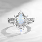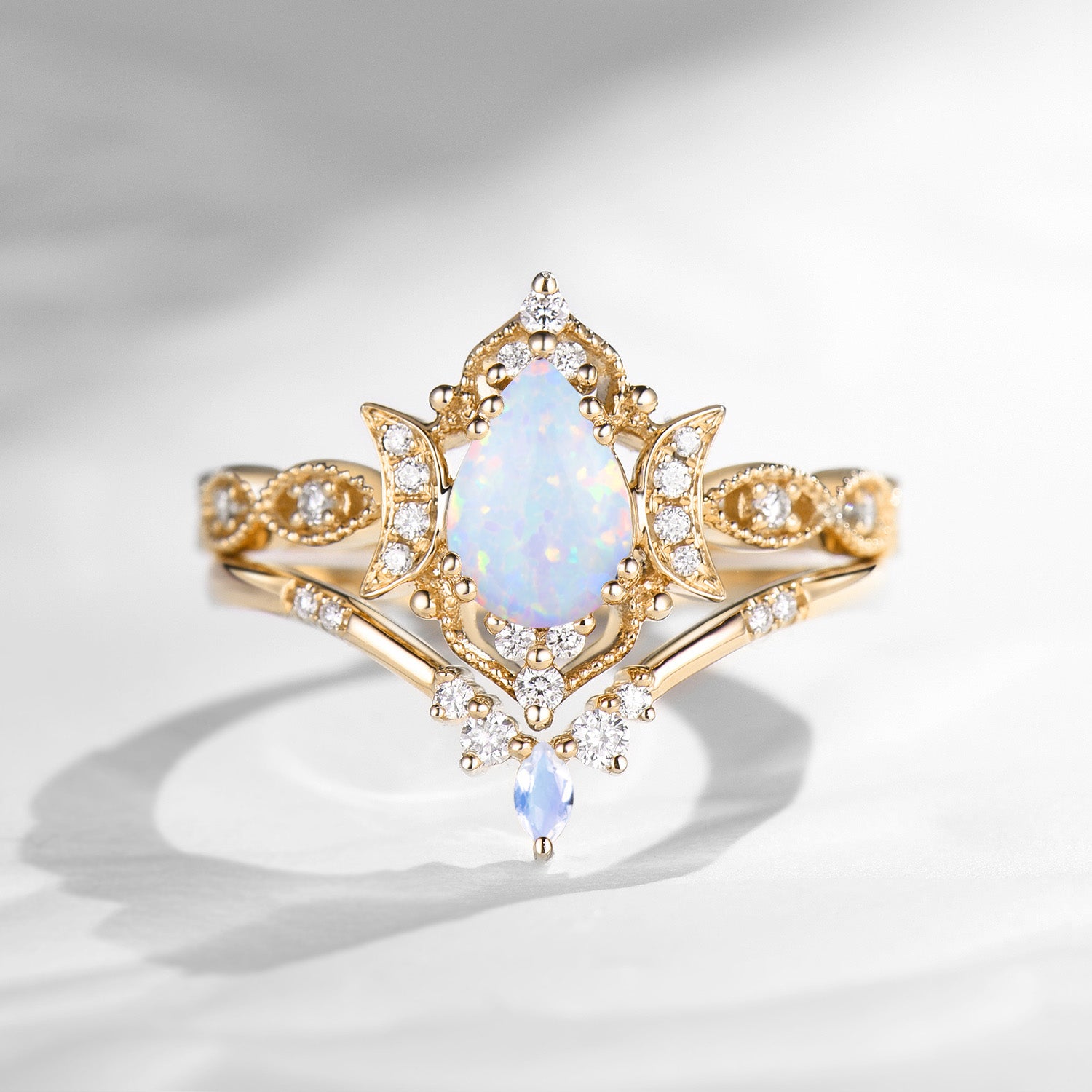 Crescent Moon | Unique White Opal Moonstone Engagement Ring Set 2pcs - Luna Bridal Set 2pcs