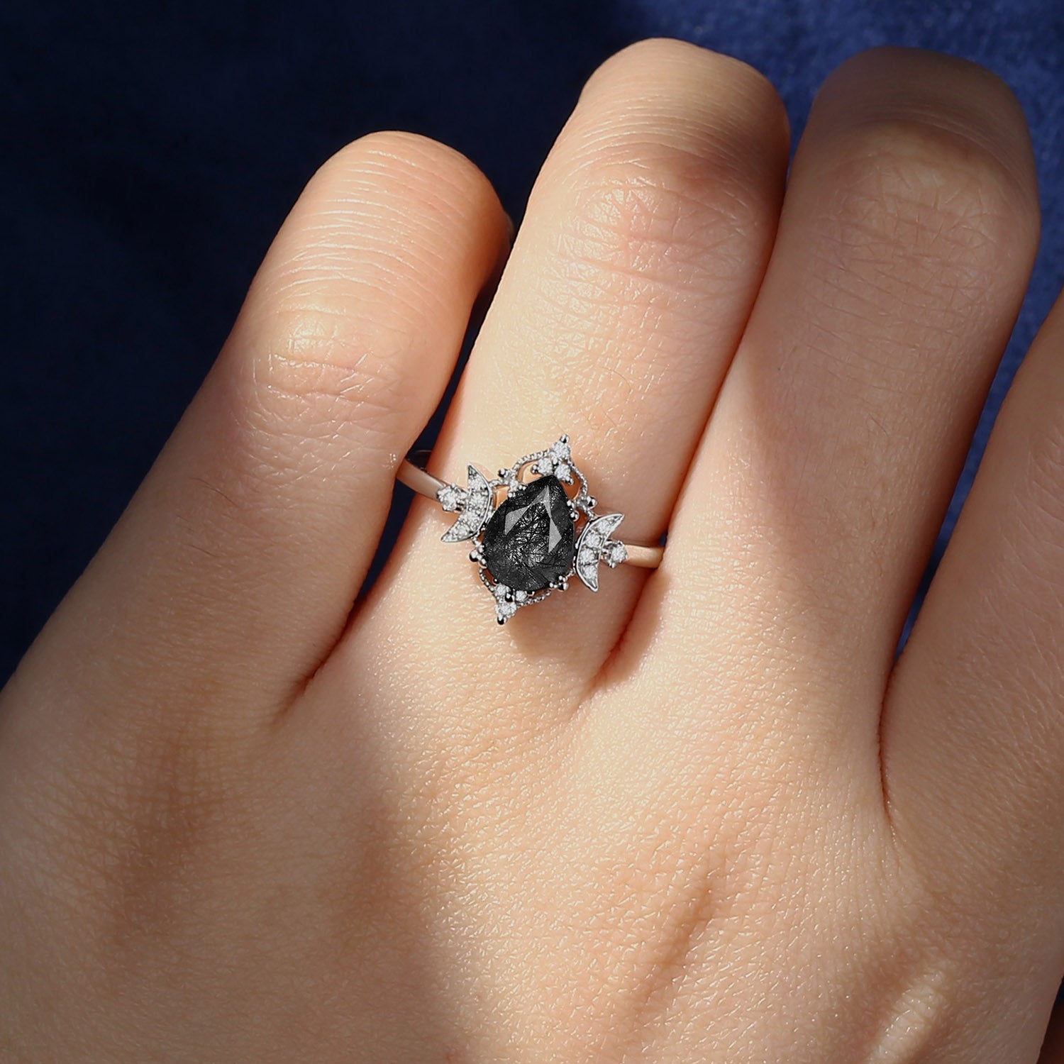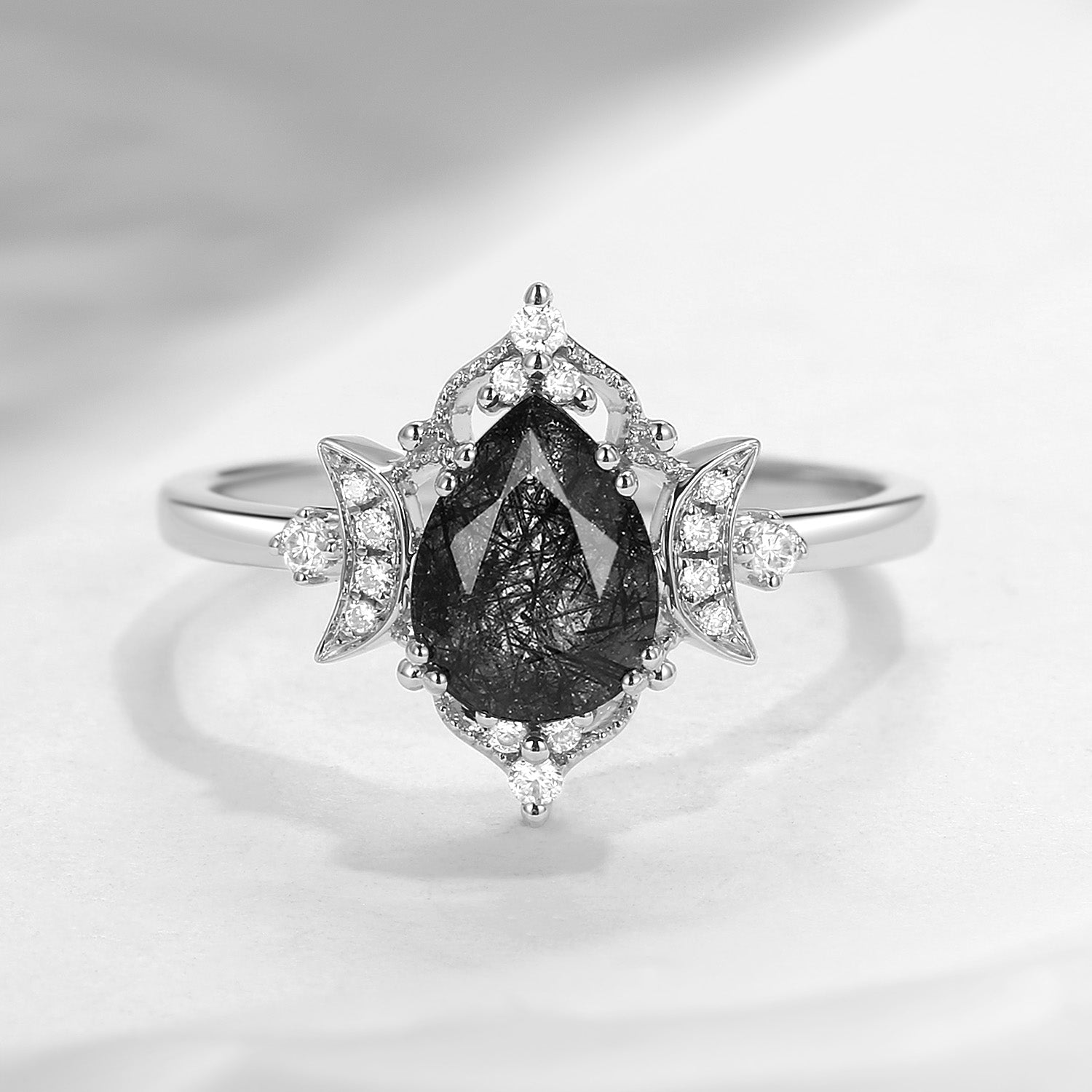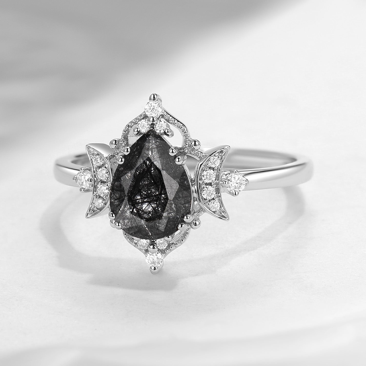 Crescent Moon | Vintage Pear Cut Black Rutilated Quartz Engagement Ring