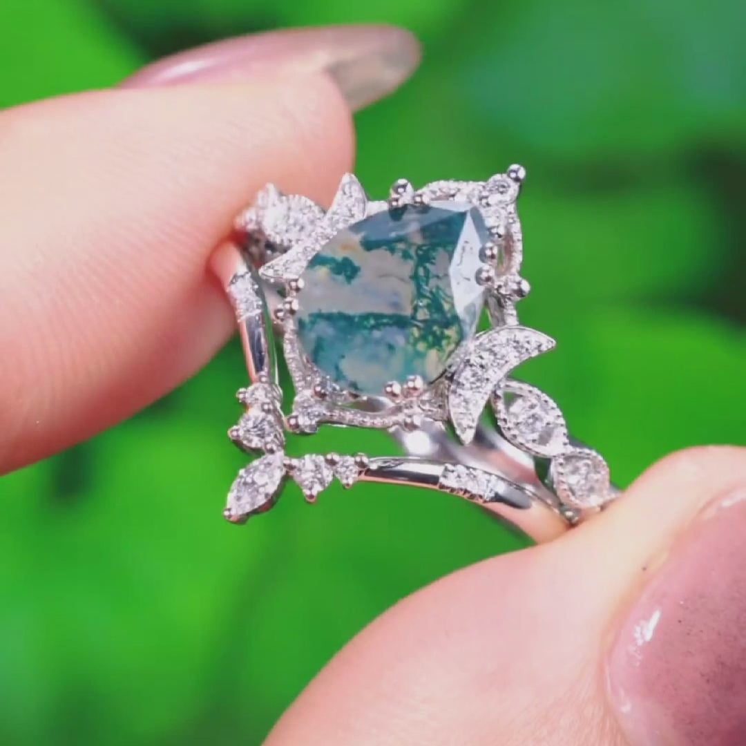 In Stock | Crescent Moon | Unique Pear Shape Moss Agate Engagement Ring Set 2pcs - Luna