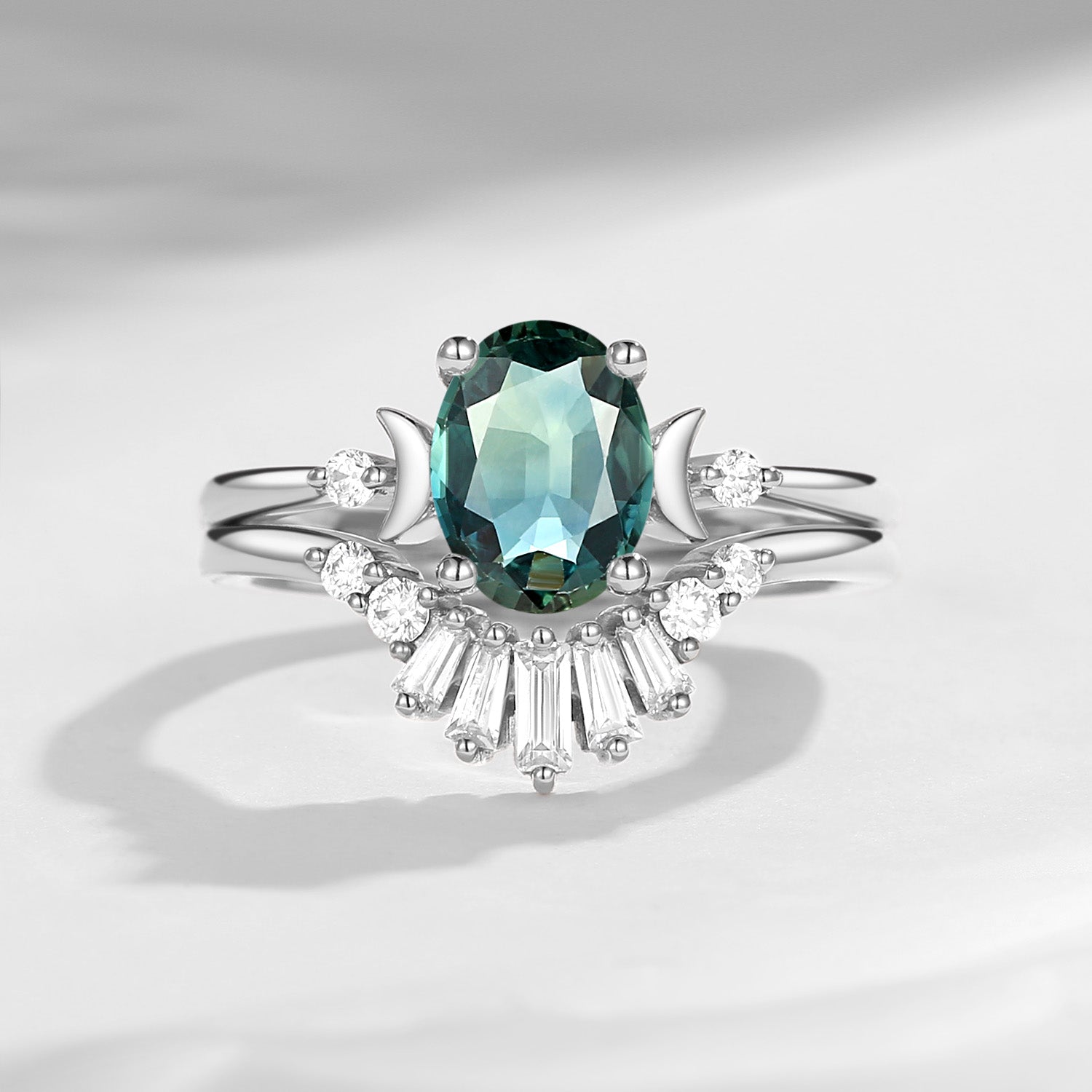 Pure Moon | Fancy Oval Cut Natural Teal Sapphire Engagement Ring Set 2pcs