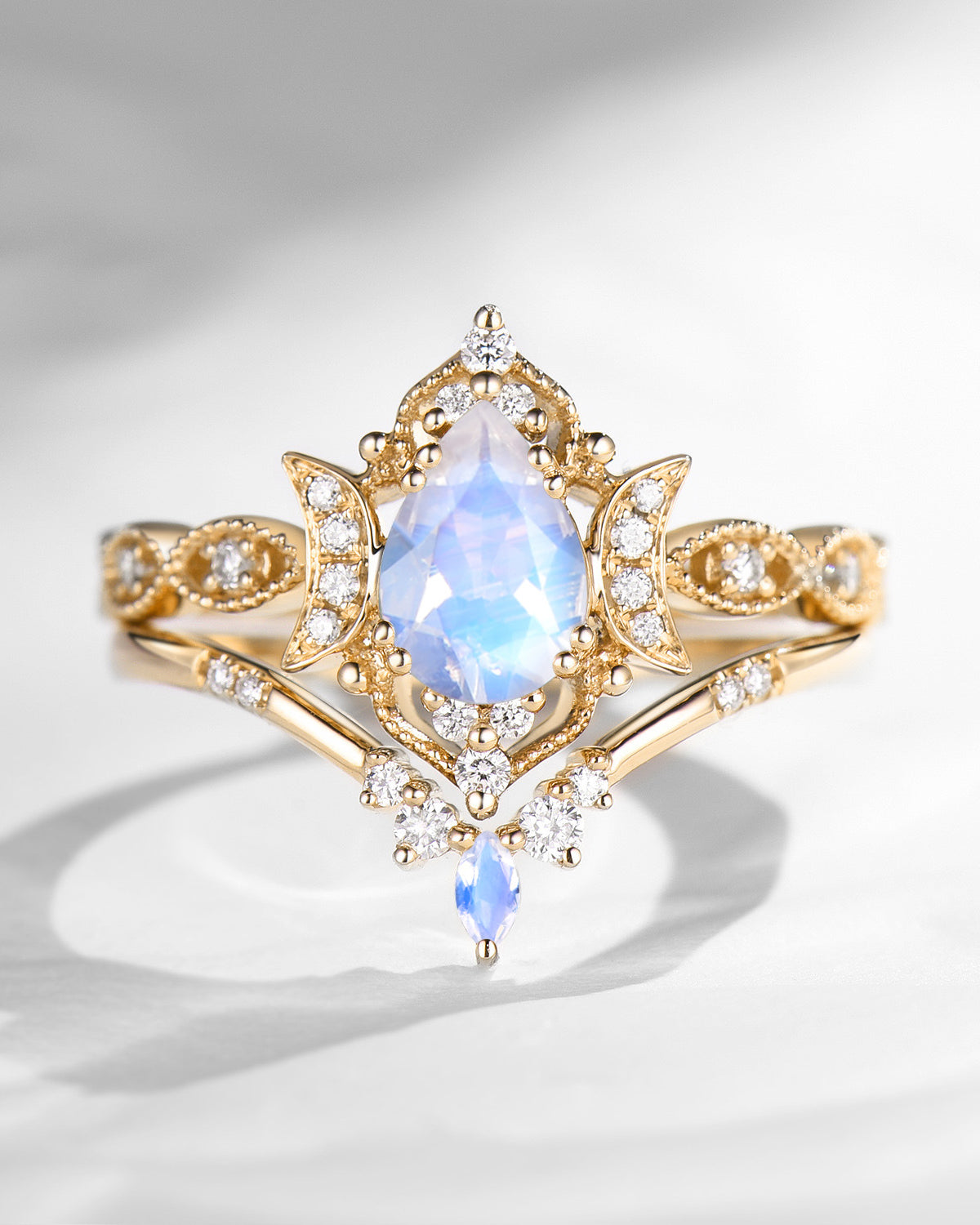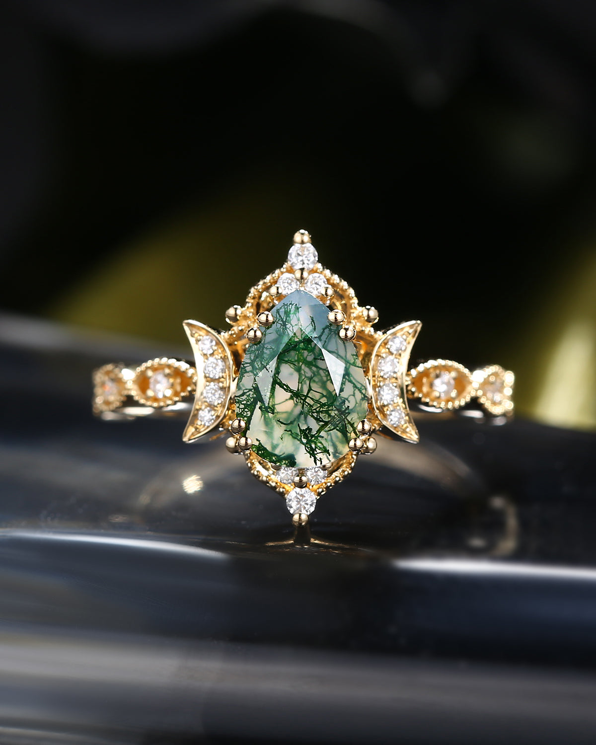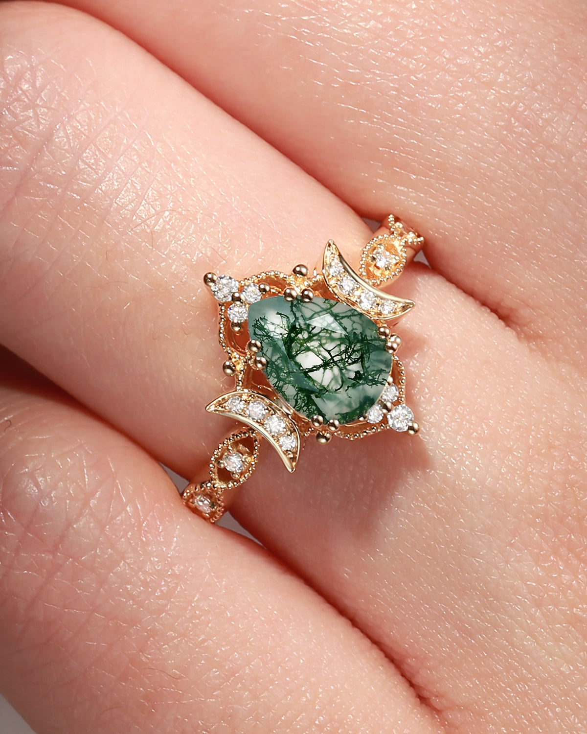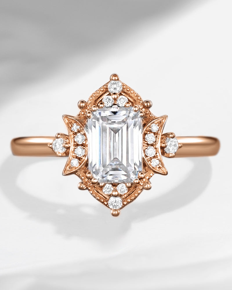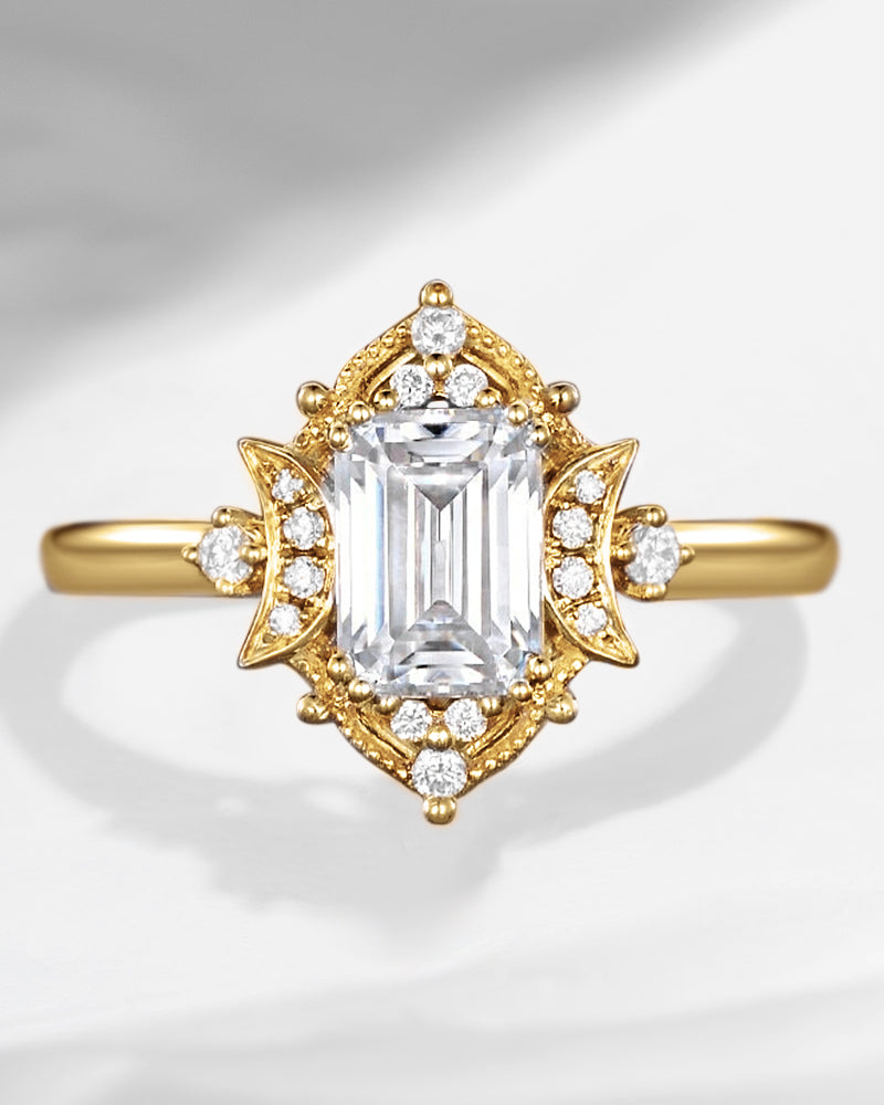 The new moon is often symbolic of new beginnings which this ring personifies for a couple starting their new life together. The crescent on the ring adorned with sparkling diamonds or other gemstones, like stars embellishing below the moon, making the ring both mystically charming and gorgeously radiant. This crescent shape ring is an ideal choice for a proposal or even daily wear, showcasing the wearer's personality in a unique way and serves as a beautiful promise of the future. Crescent moon is our proudest design by far. The crescent moon ring represents a new beginning, a process of starting over and vitality. Each crescent moon engagement ring is as unique as it can get while preserving a wonderful balance between vintage vibes and simplicity. The crescent moon ring can be of different shapes and different stone color even different side stones because here in StarlandUS, every one gets to create their own crescent moon, so as their own beginning.