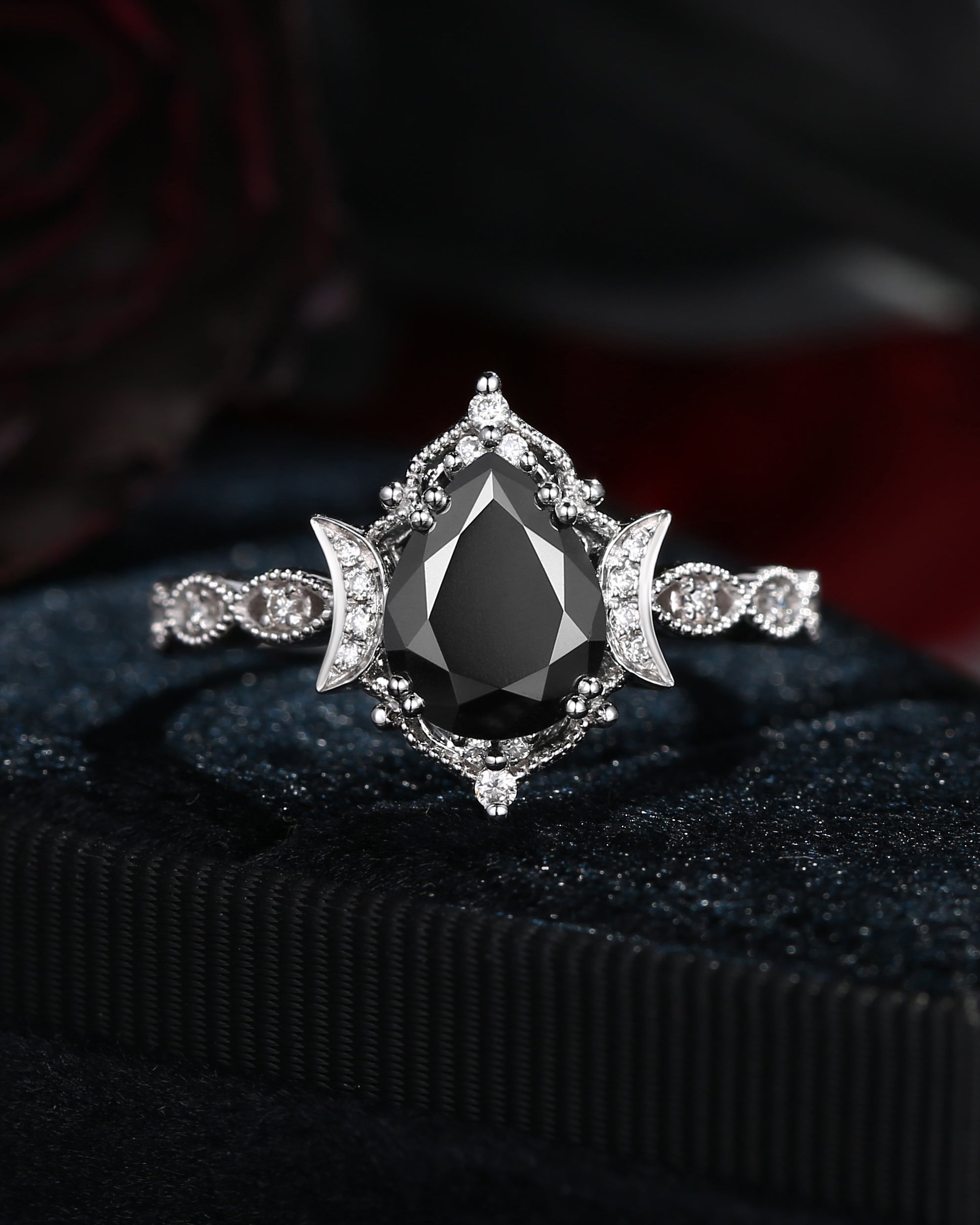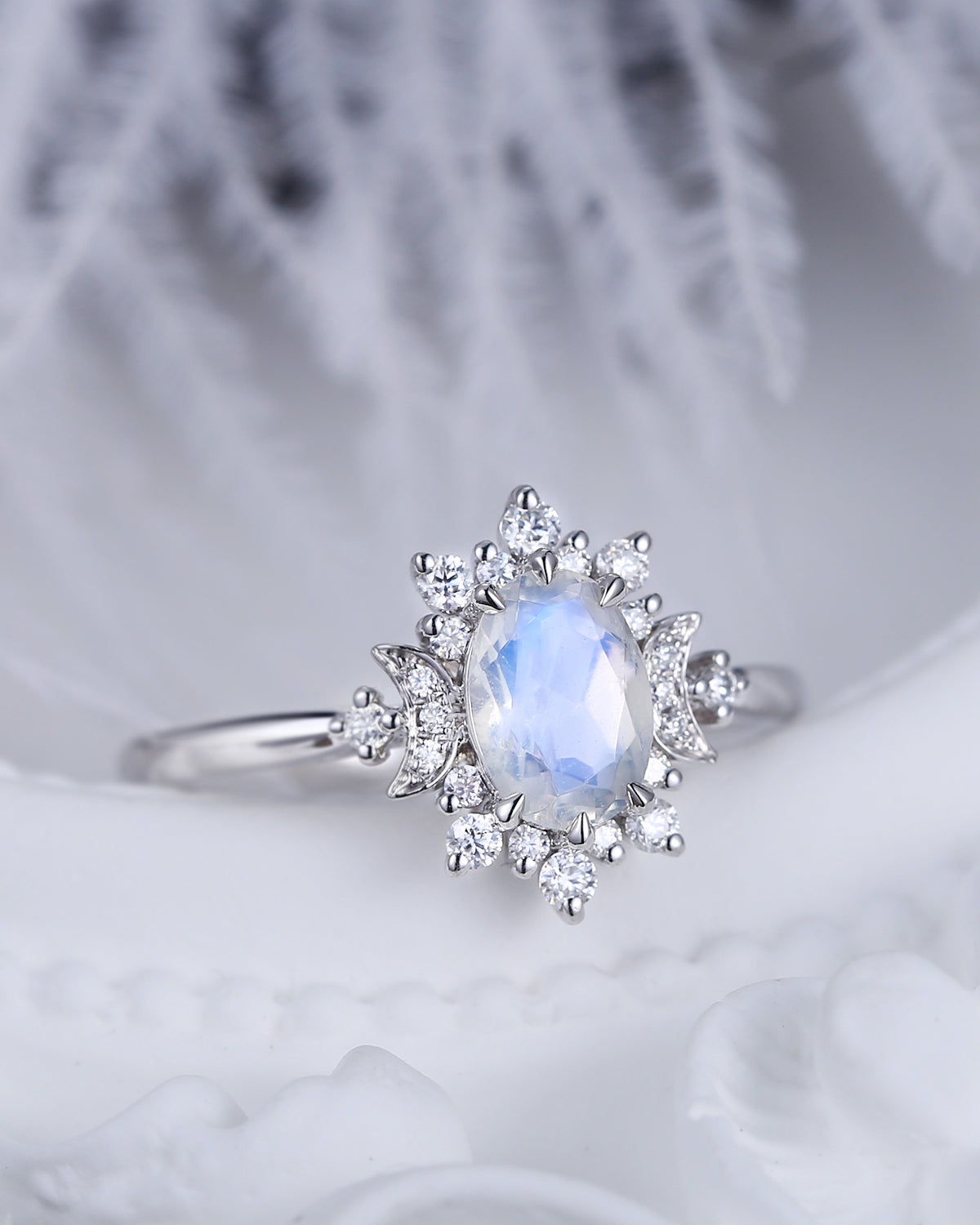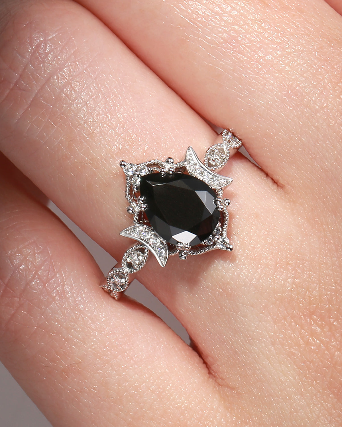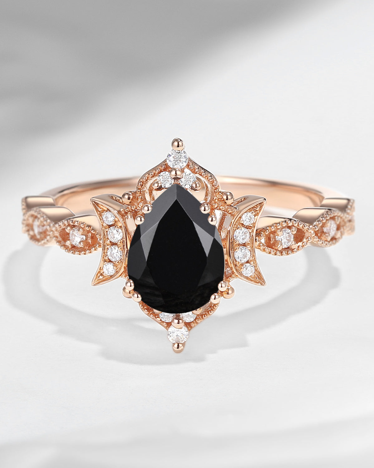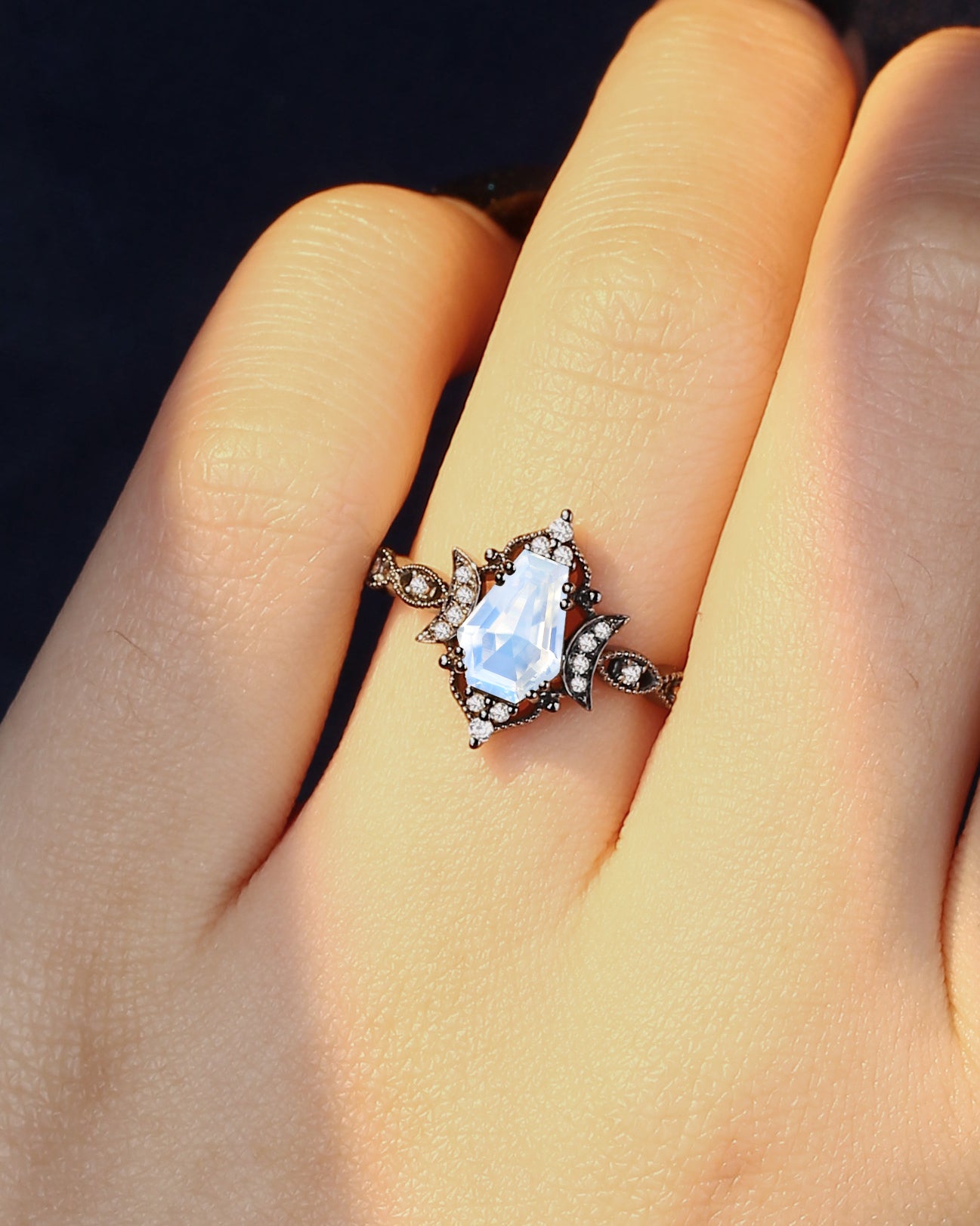 The new moon is often symbolic of new beginnings which this ring personifies for a couple starting their new life together. The crescent on the ring adorned with sparkling diamonds or other gemstones, like stars embellishing below the moon, making the ring both mystically charming and gorgeously radiant. This crescent shape ring is an ideal choice for a proposal or even daily wear, showcasing the wearer's personality in a unique way and serves as a beautiful promise of the future. Crescent moon is our proudest design by far. The crescent moon ring represents a new beginning, a process of starting over and vitality. Each crescent moon engagement ring is as unique as it can get while preserving a wonderful balance between vintage vibes and simplicity. The crescent moon ring can be of different shapes and different stone color even different side stones because here in StarlandUS, every one gets to create their own crescent moon, so as their own beginning.