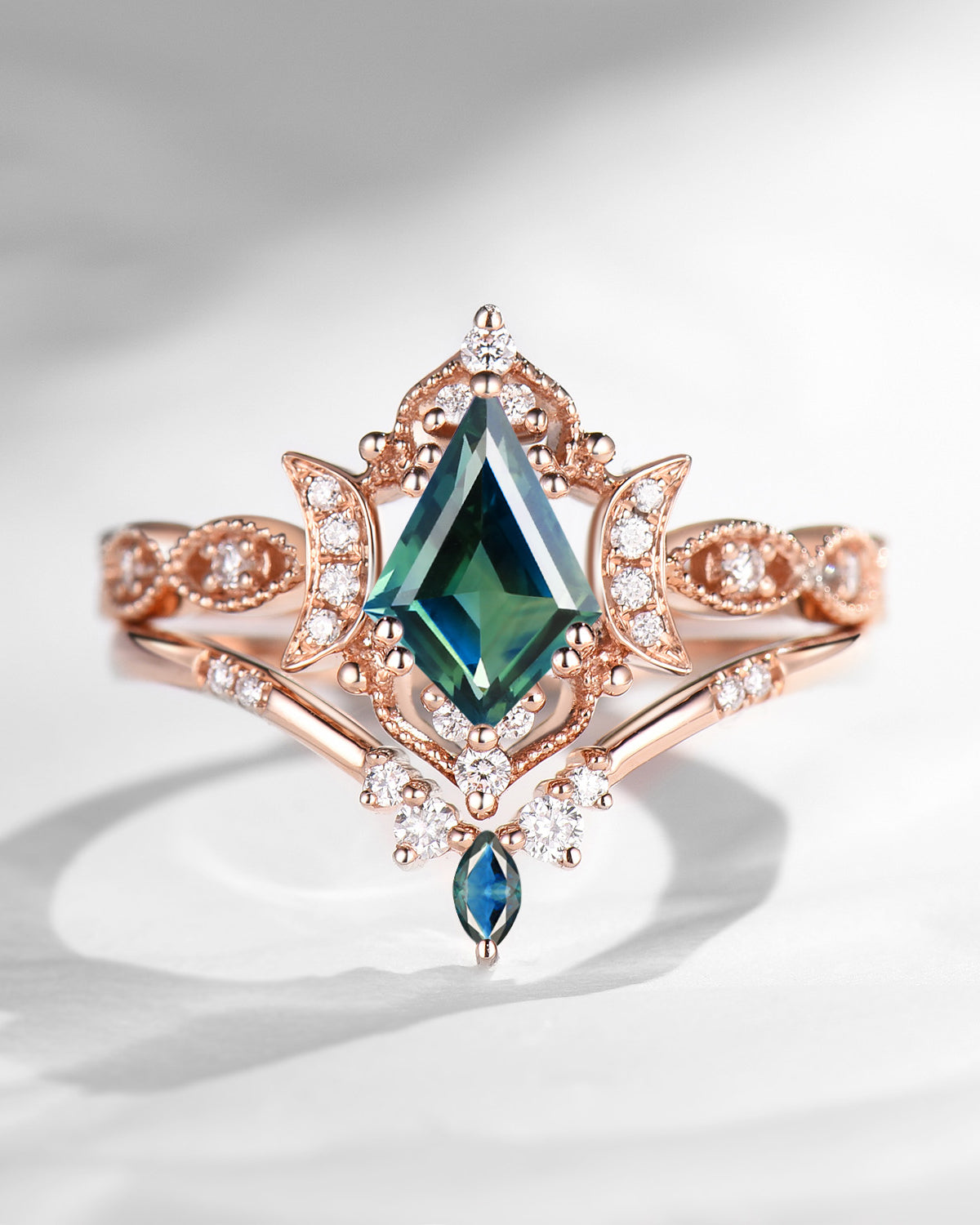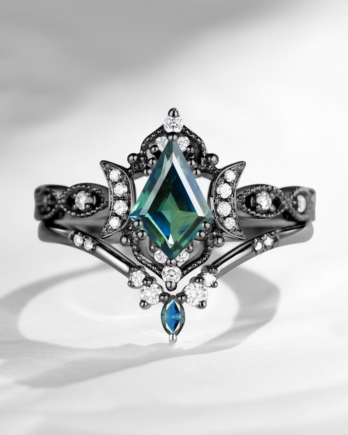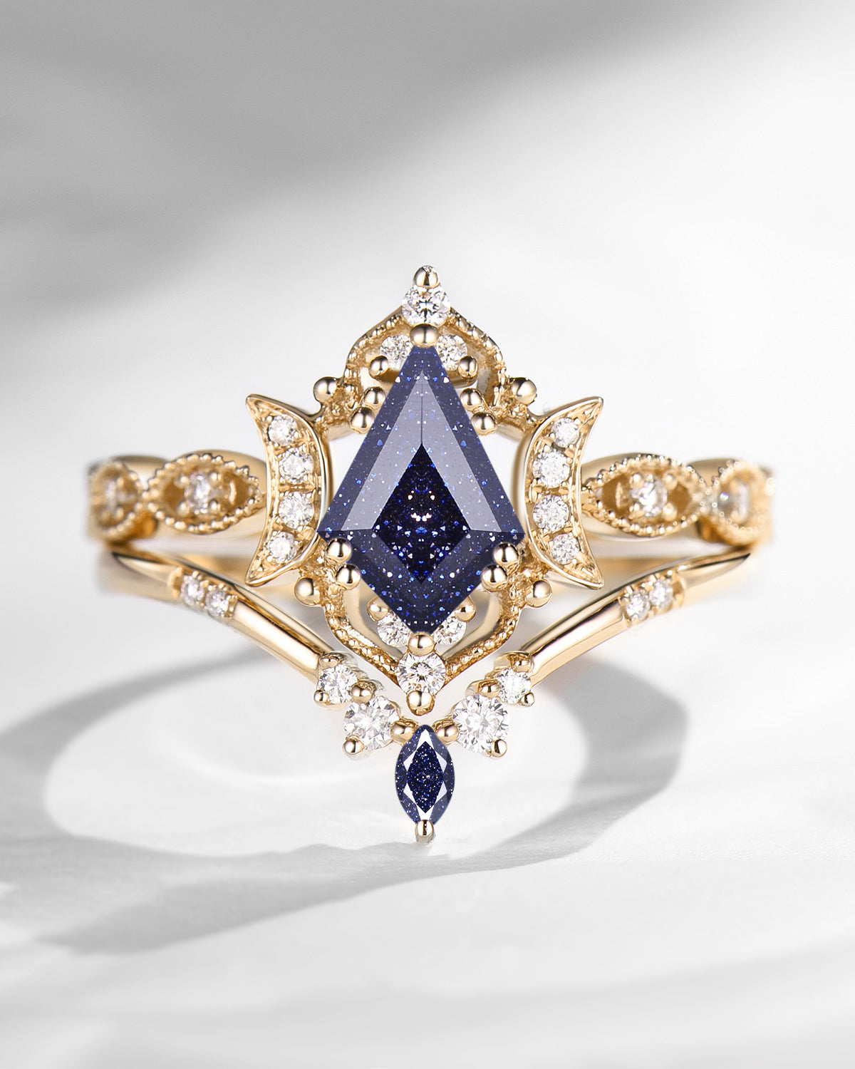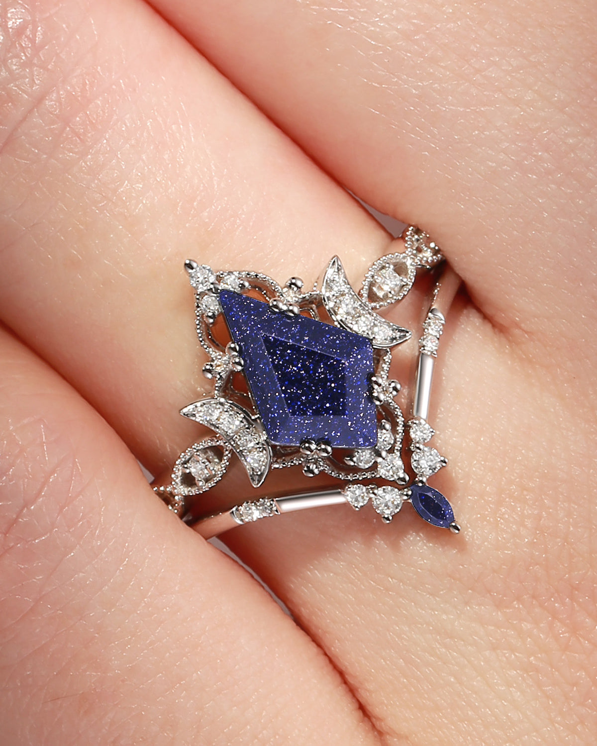 The new moon is often symbolic of new beginnings which this ring personifies for a couple starting their new life together. The crescent on the ring adorned with sparkling diamonds or other gemstones, like stars embellishing below the moon, making the ring both mystically charming and gorgeously radiant. This crescent shape ring is an ideal choice for a proposal or even daily wear, showcasing the wearer's personality in a unique way and serves as a beautiful promise of the future. Crescent moon is our proudest design by far. The crescent moon ring represents a new beginning, a process of starting over and vitality. Each crescent moon engagement ring is as unique as it can get while preserving a wonderful balance between vintage vibes and simplicity. The crescent moon ring can be of different shapes and different stone color even different side stones because here in StarlandUS, every one gets to create their own crescent moon, so as their own beginning.