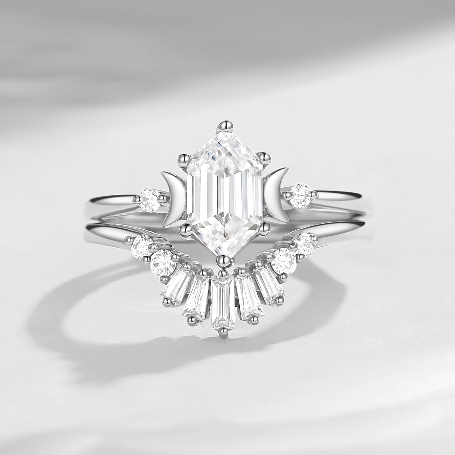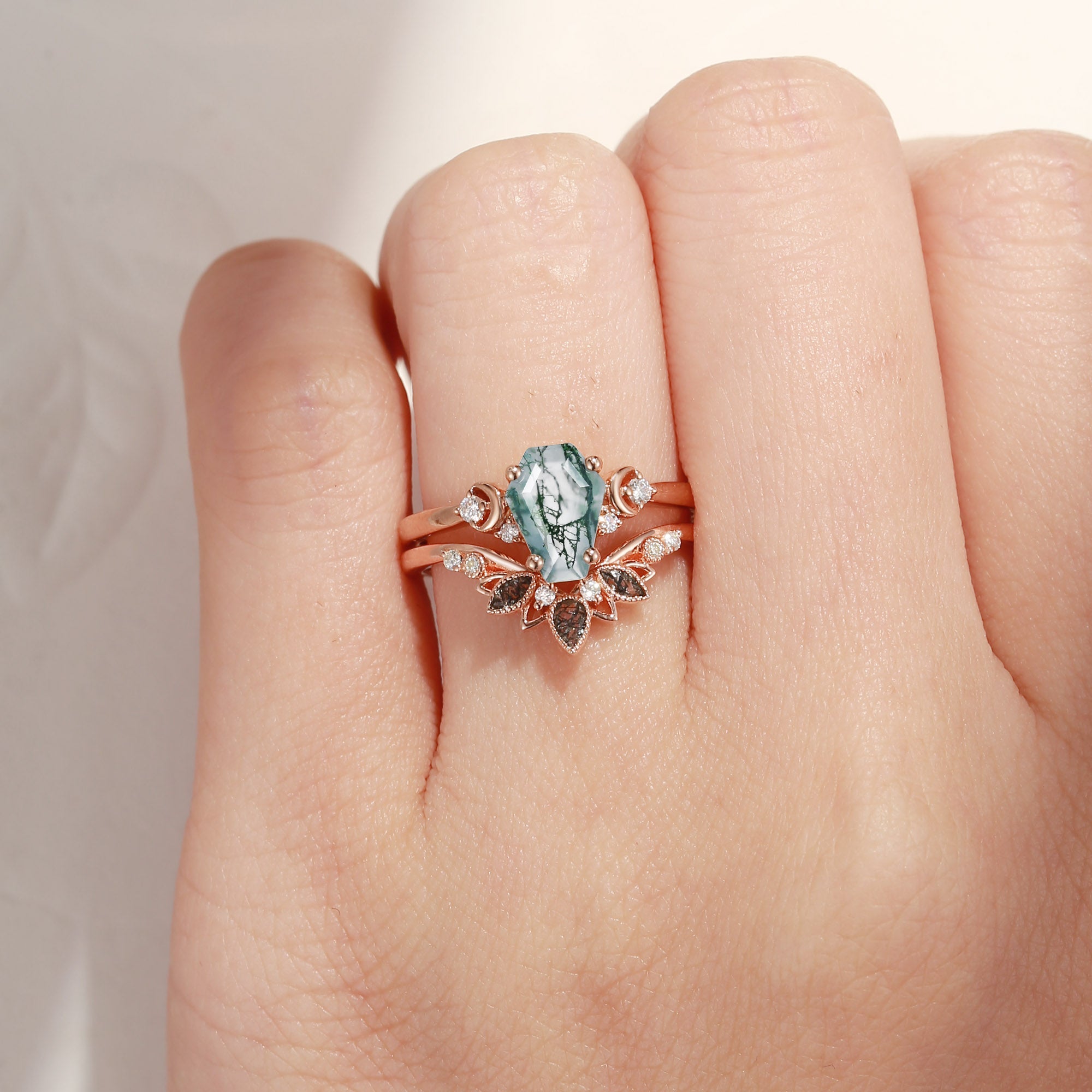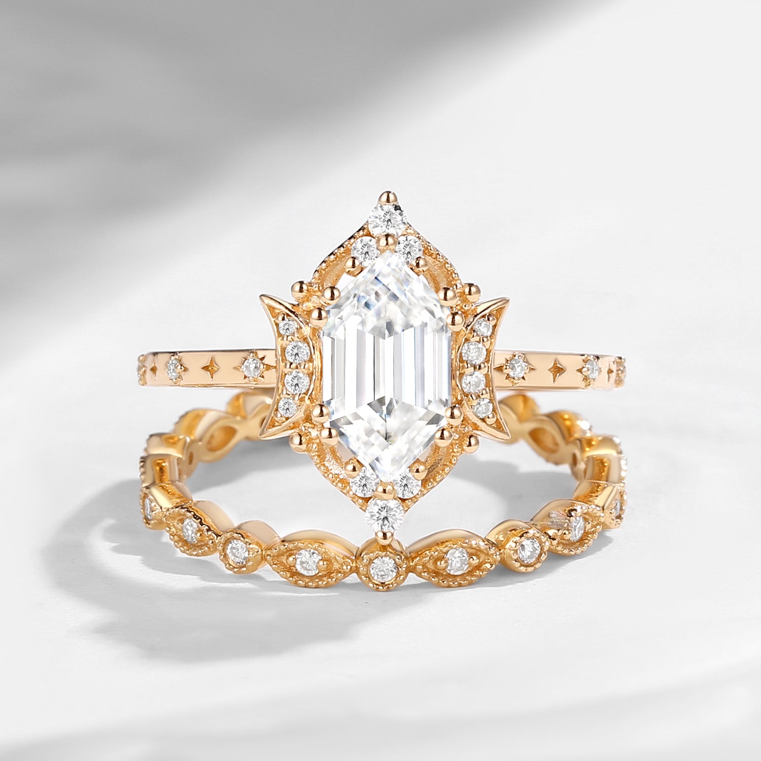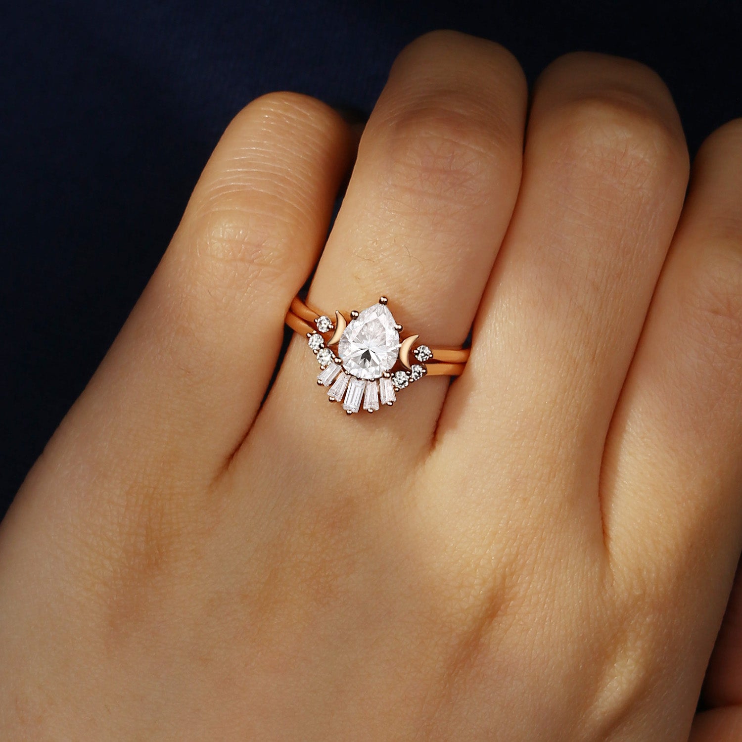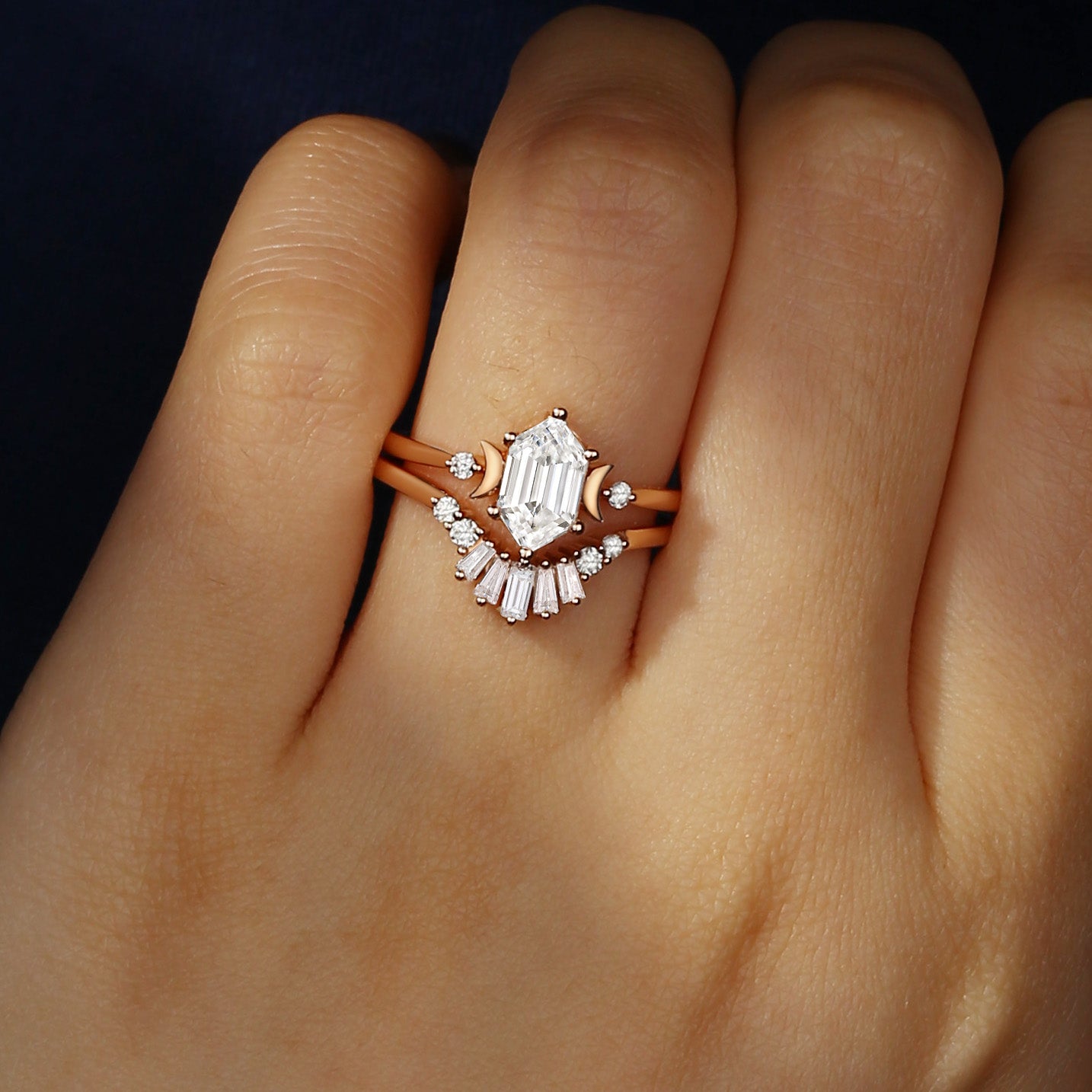 The new moon is often symbolic of new beginnings which this ring personifies for a couple starting their new life together. The crescent on the ring adorned with sparkling diamonds or other gemstones, like stars embellishing below the moon, making the ring both mystically charming and gorgeously radiant. This crescent shape ring is an ideal choice for a proposal or even daily wear, showcasing the wearer's personality in a unique way and serves as a beautiful promise of the future. Crescent moon is our proudest design by far. The crescent moon ring represents a new beginning, a process of starting over and vitality. Each crescent moon engagement ring is as unique as it can get while preserving a wonderful balance between vintage vibes and simplicity. The crescent moon ring can be of different shapes and different stone color even different side stones because here in StarlandUS, every one gets to create their own crescent moon, so as their own beginning.
