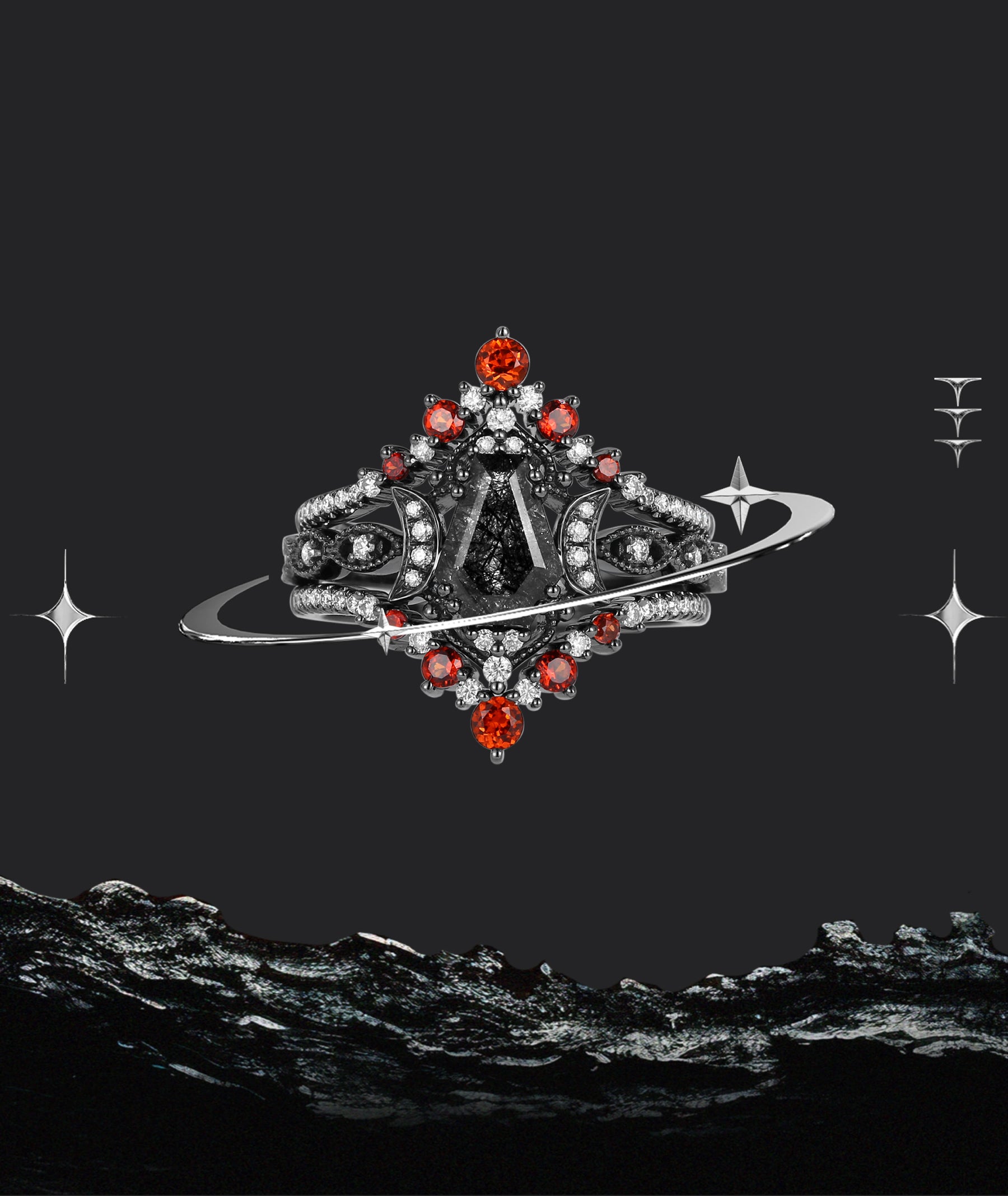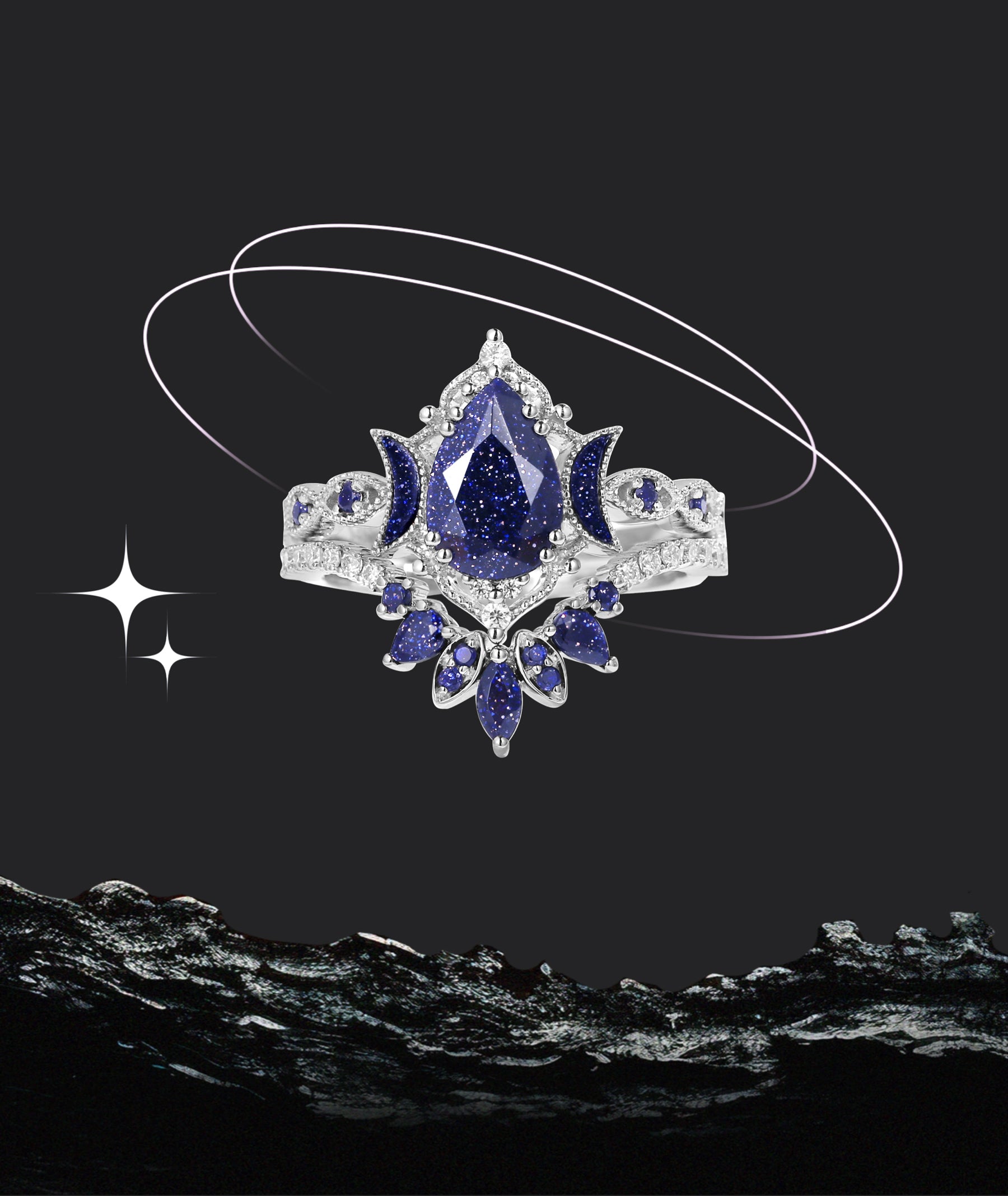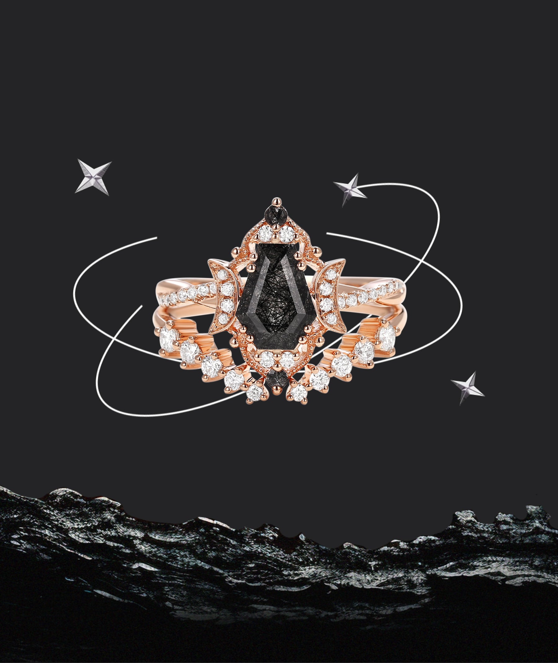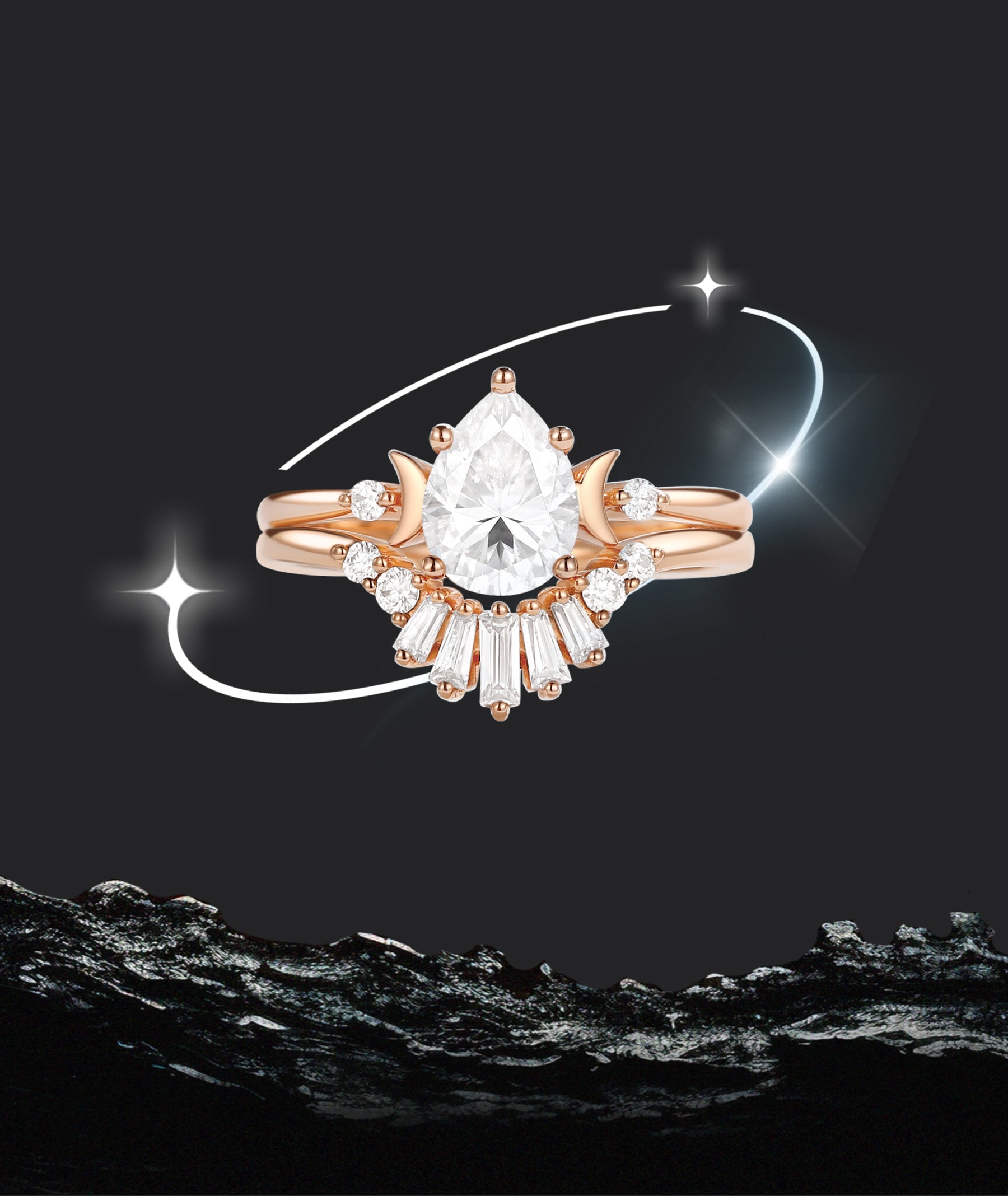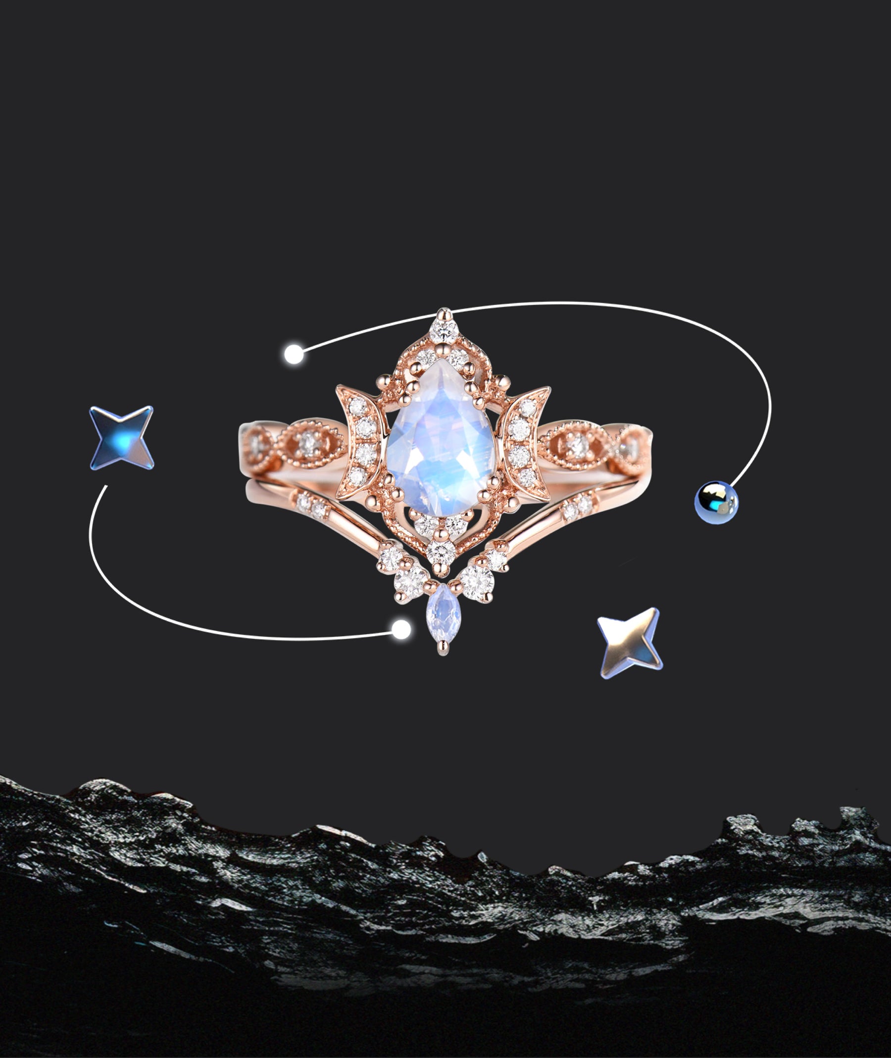The new moon is often symbolic of new beginnings which this ring personifies for a couple starting their new life together. The crescent on the ring adorned with sparkling diamonds or other gemstones, like stars embellishing below the moon, making the ring both mystically charming and gorgeously radiant. This crescent shape ring is an ideal choice for a proposal or even daily wear, showcasing the wearer's personality in a unique way and serves as a beautiful promise of the future. Crescent moon is our proudest design by far. The crescent moon ring represents a new beginning, a process of starting over and vitality. Each crescent moon engagement ring is as unique as it can get while preserving a wonderful balance between vintage vibes and simplicity. The crescent moon ring can be of different shapes and different stone color even different side stones because here in StarlandUS, every one gets to create their own crescent moon, so as their own beginning.