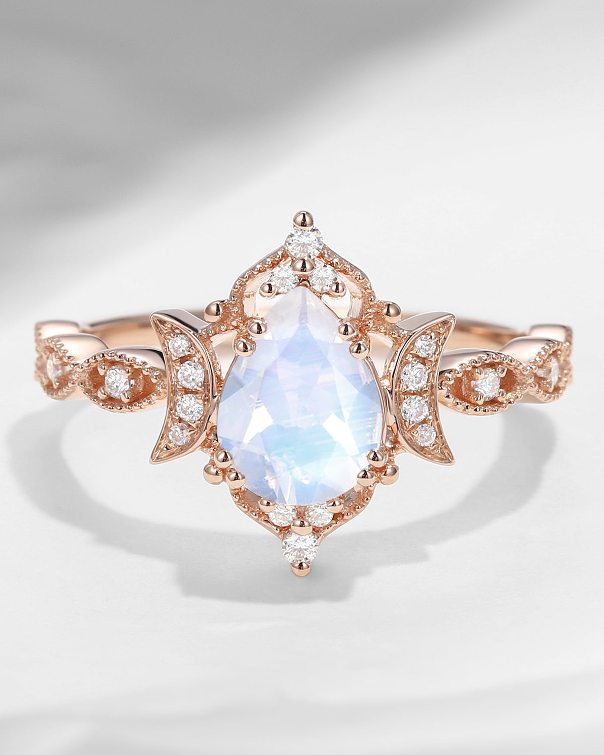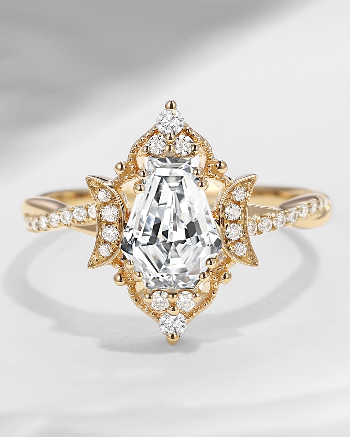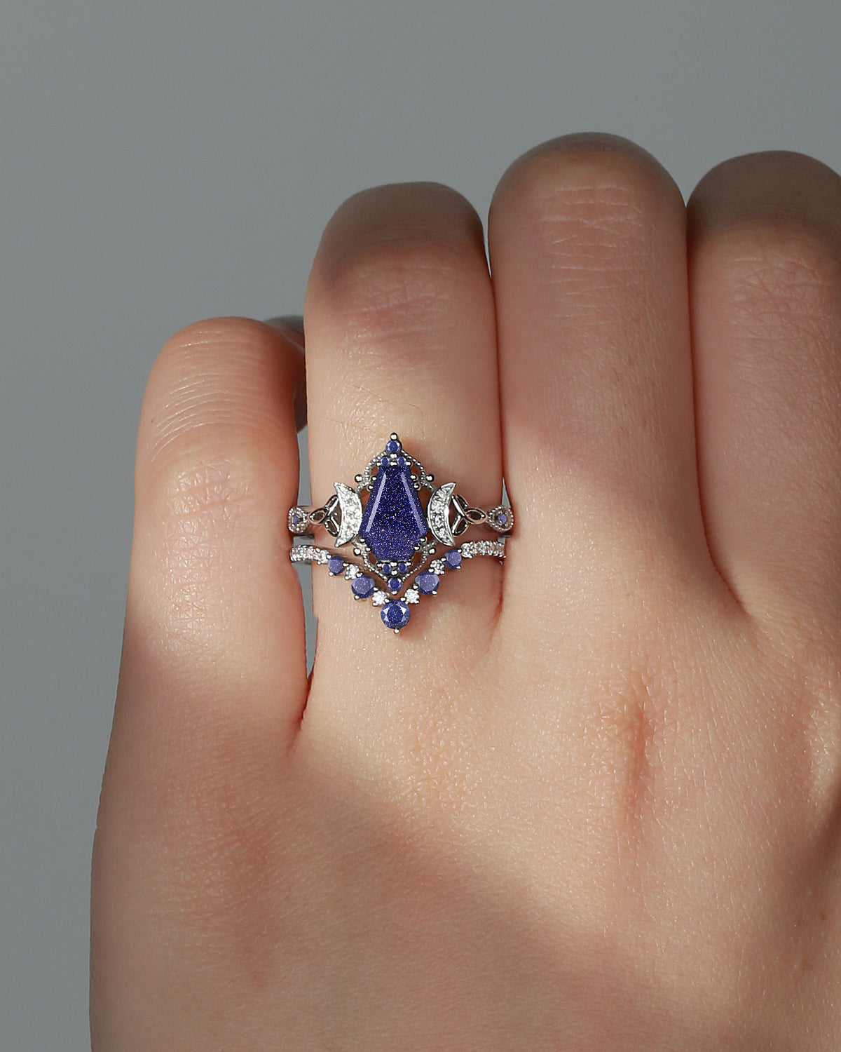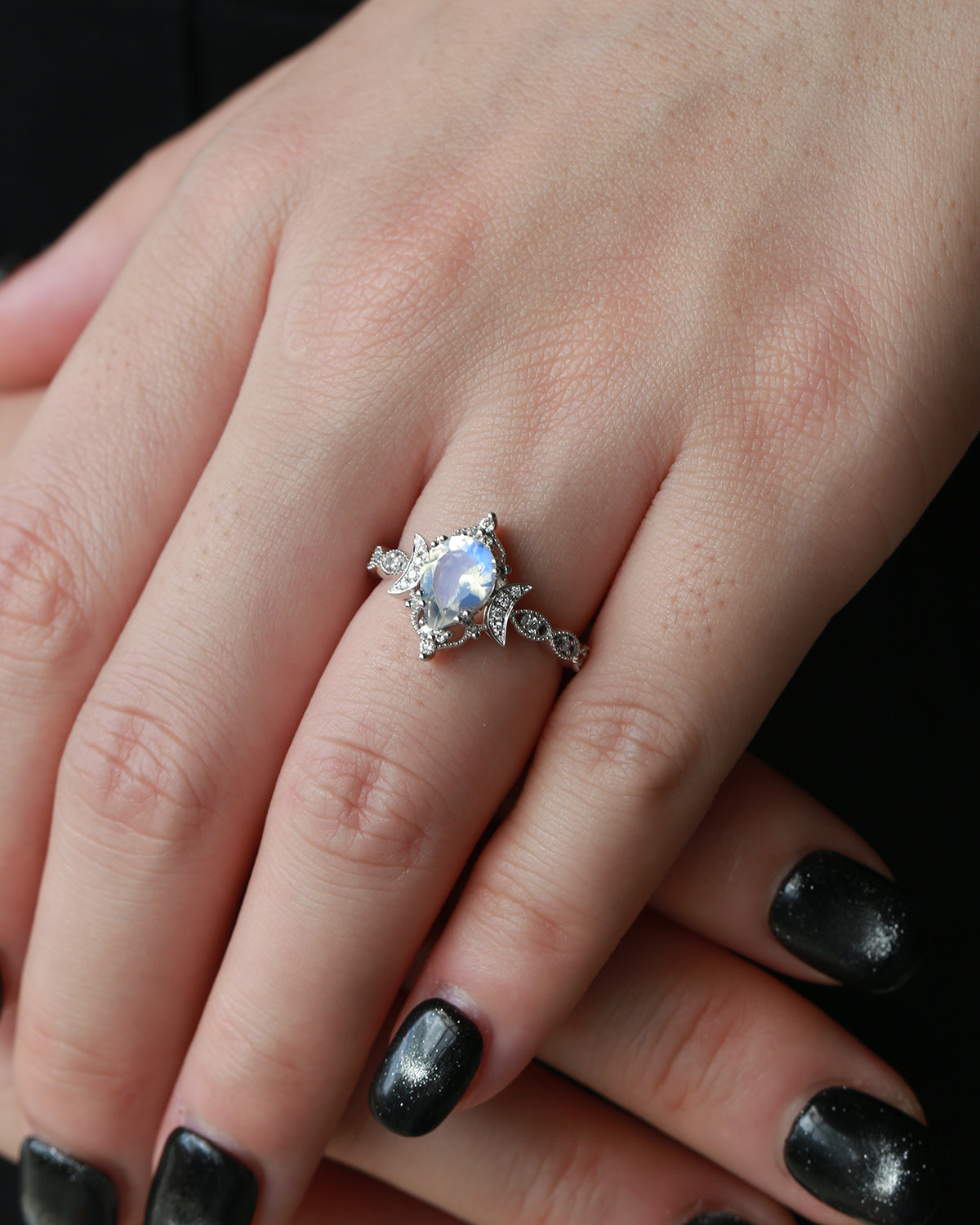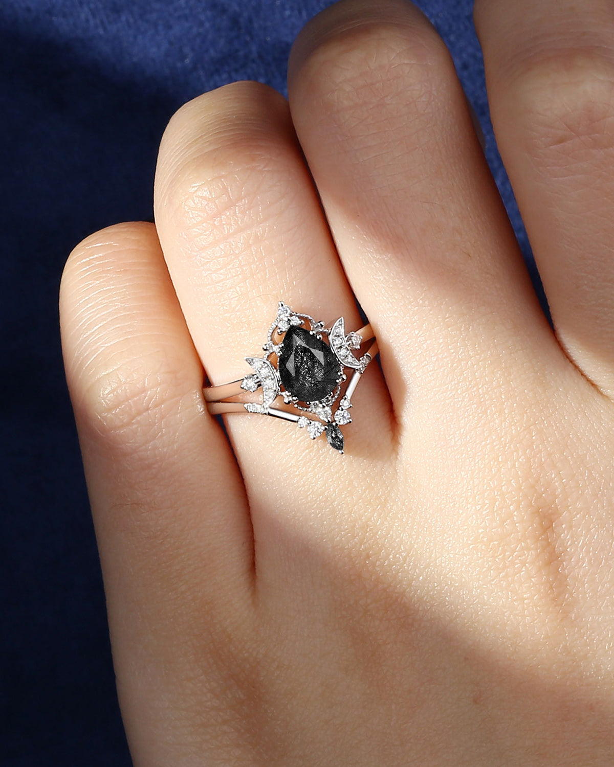 The new moon is often symbolic of new beginnings which this ring personifies for a couple starting their new life together. The crescent on the ring adorned with sparkling diamonds or other gemstones, like stars embellishing below the moon, making the ring both mystically charming and gorgeously radiant. This crescent shape ring is an ideal choice for a proposal or even daily wear, showcasing the wearer's personality in a unique way and serves as a beautiful promise of the future. Crescent moon is our proudest design by far. The crescent moon ring represents a new beginning, a process of starting over and vitality. Each crescent moon engagement ring is as unique as it can get while preserving a wonderful balance between vintage vibes and simplicity. The crescent moon ring can be of different shapes and different stone color even different side stones because here in StarlandUS, every one gets to create their own crescent moon, so as their own beginning.