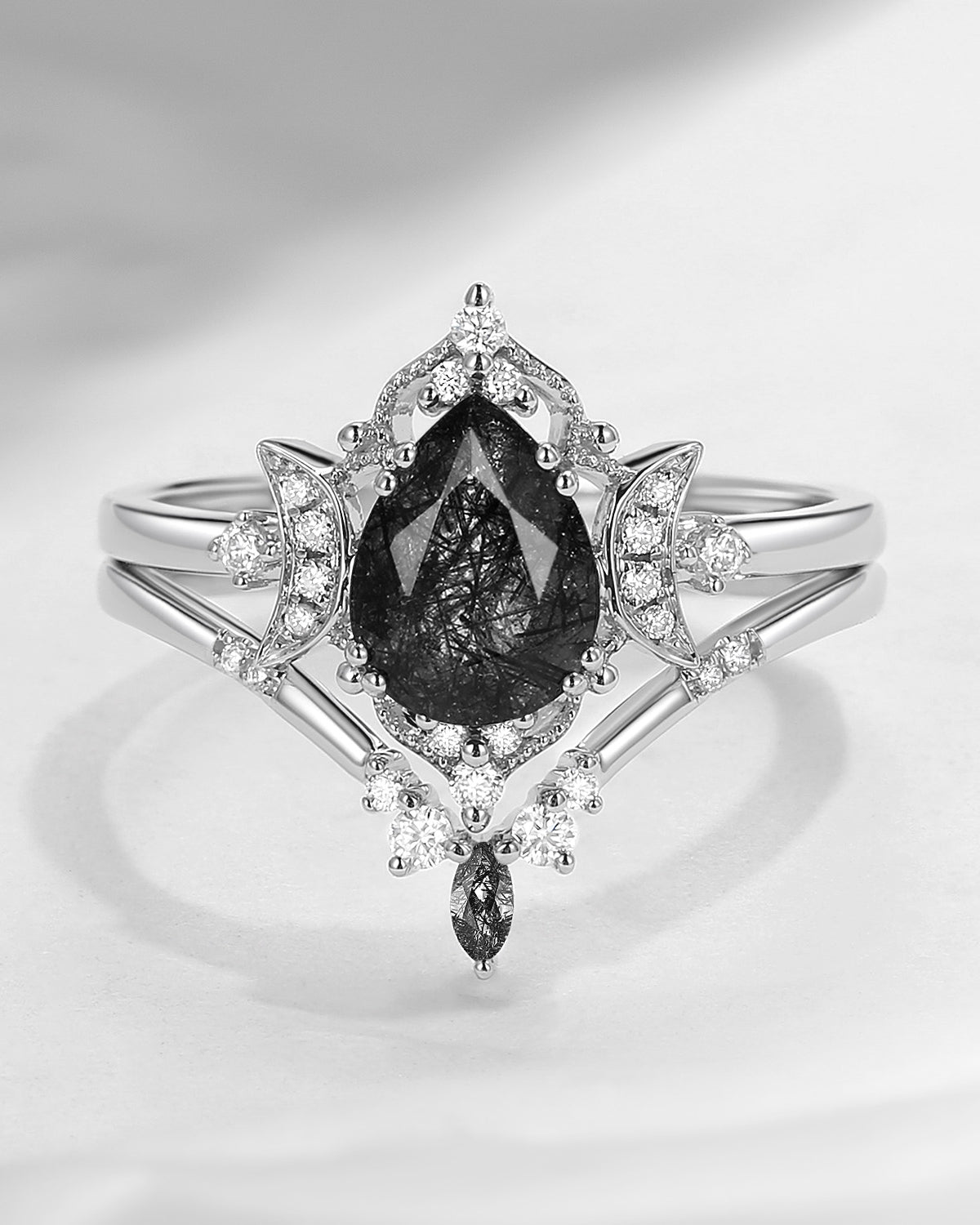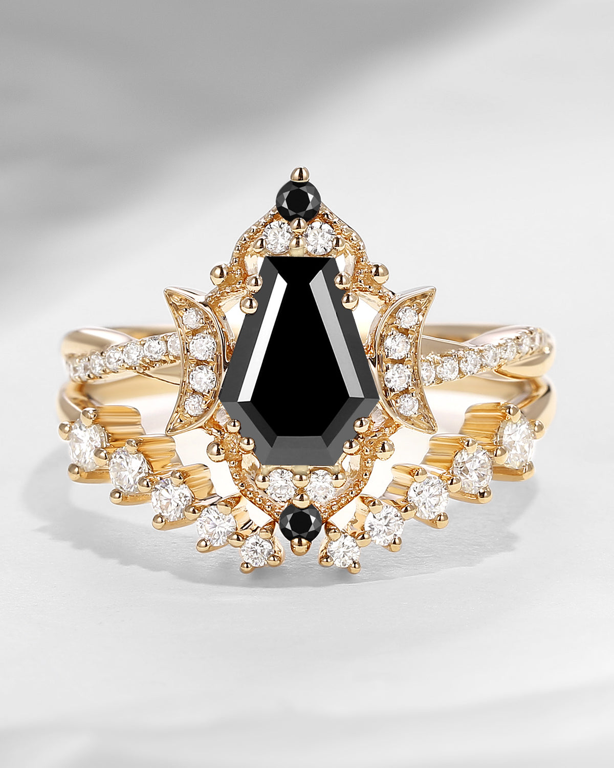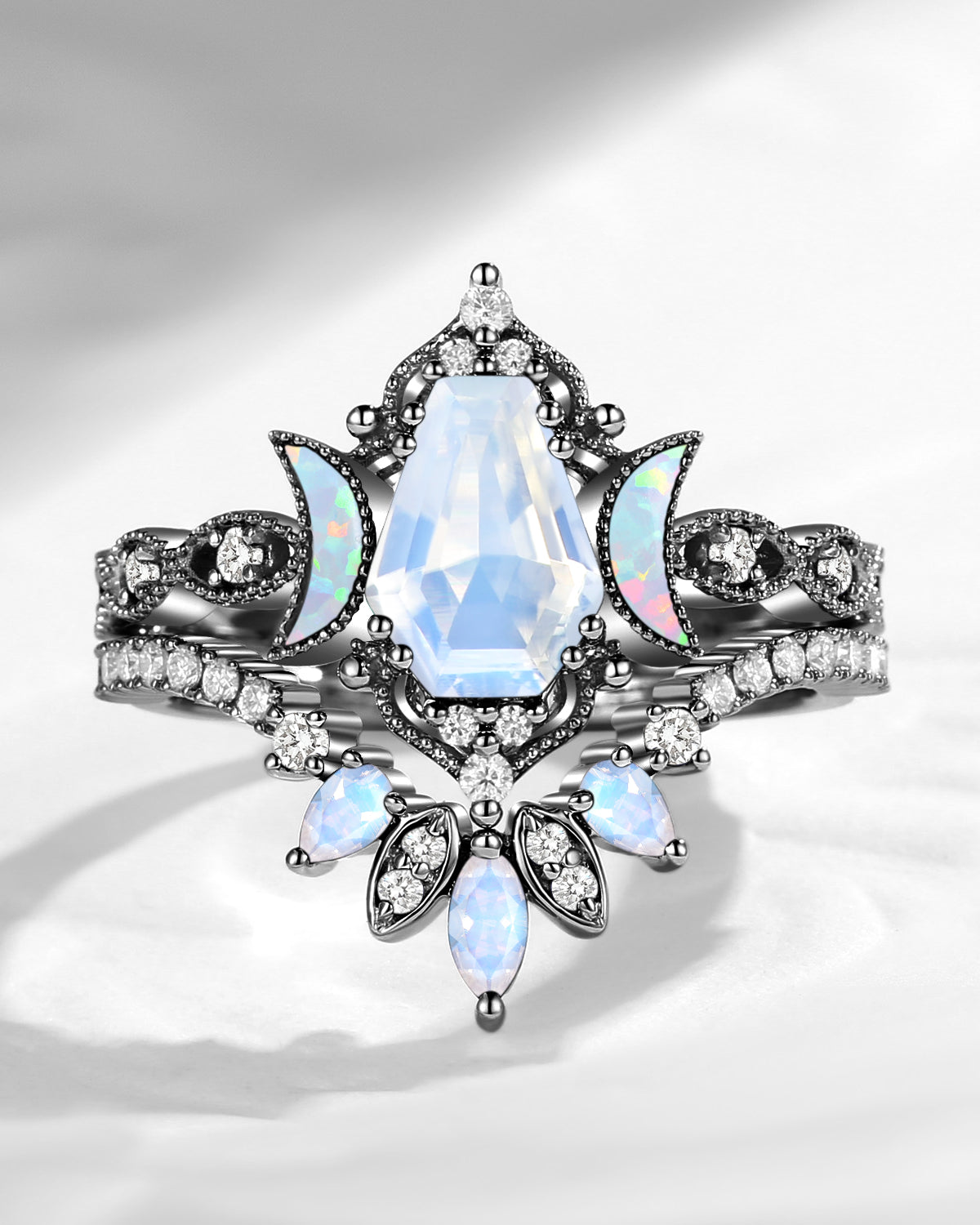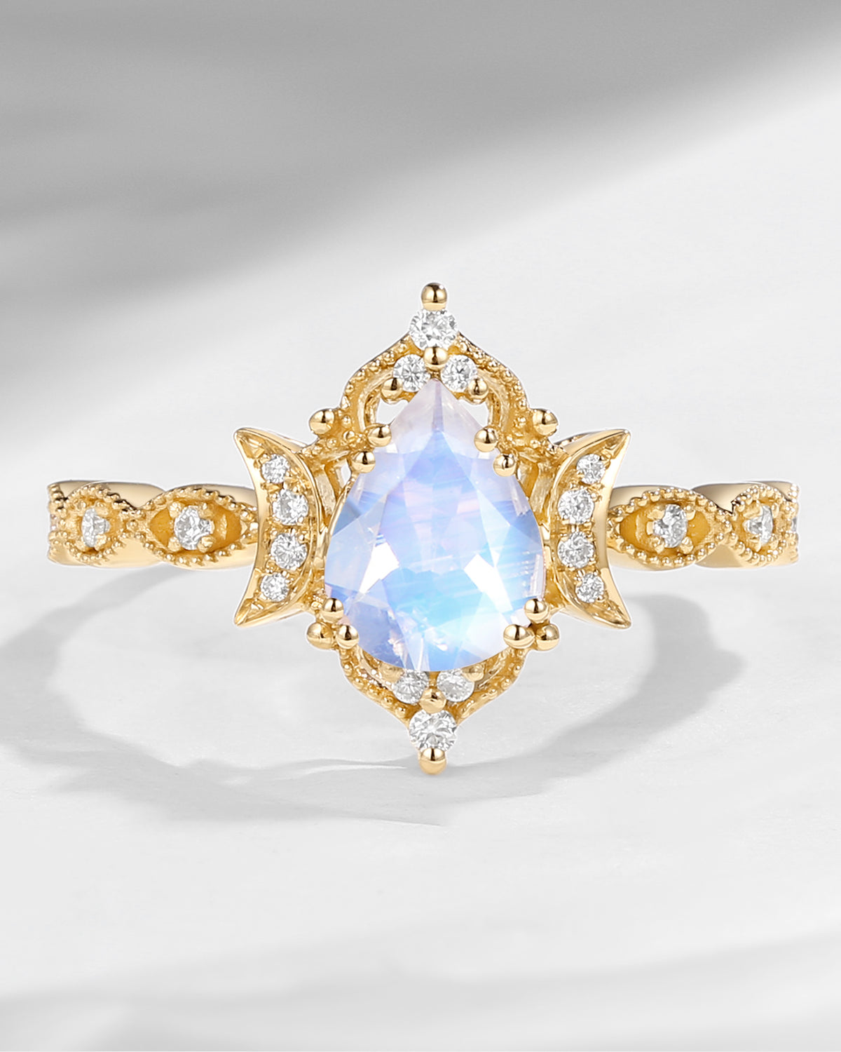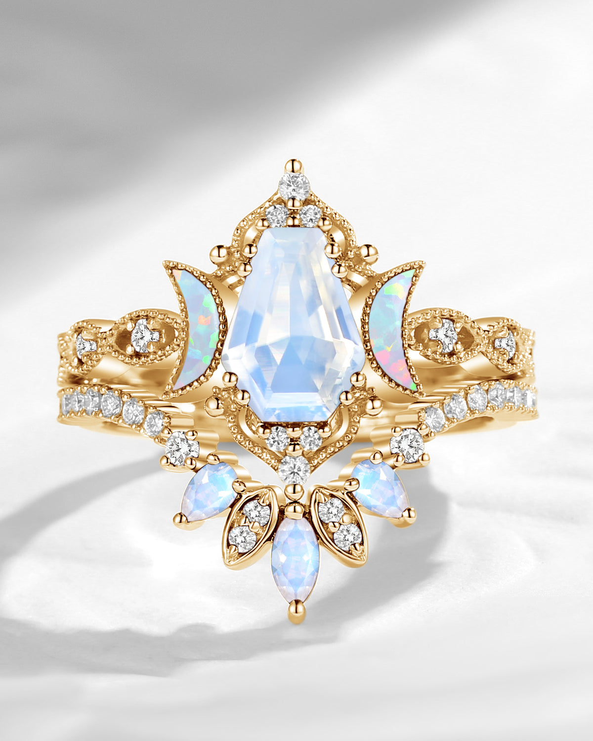 The new moon is often symbolic of new beginnings which this ring personifies for a couple starting their new life together. The crescent on the ring adorned with sparkling diamonds or other gemstones, like stars embellishing below the moon, making the ring both mystically charming and gorgeously radiant. This crescent shape ring is an ideal choice for a proposal or even daily wear, showcasing the wearer's personality in a unique way and serves as a beautiful promise of the future. Crescent moon is our proudest design by far. The crescent moon ring represents a new beginning, a process of starting over and vitality. Each crescent moon engagement ring is as unique as it can get while preserving a wonderful balance between vintage vibes and simplicity. The crescent moon ring can be of different shapes and different stone color even different side stones because here in StarlandUS, every one gets to create their own crescent moon, so as their own beginning.