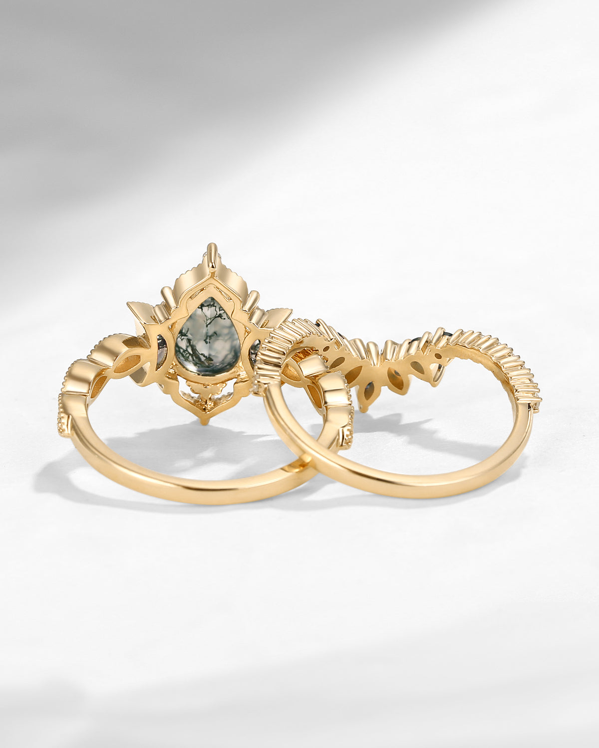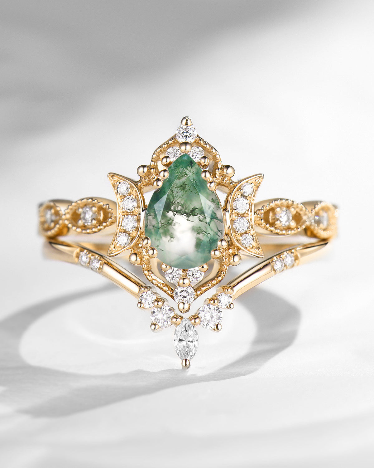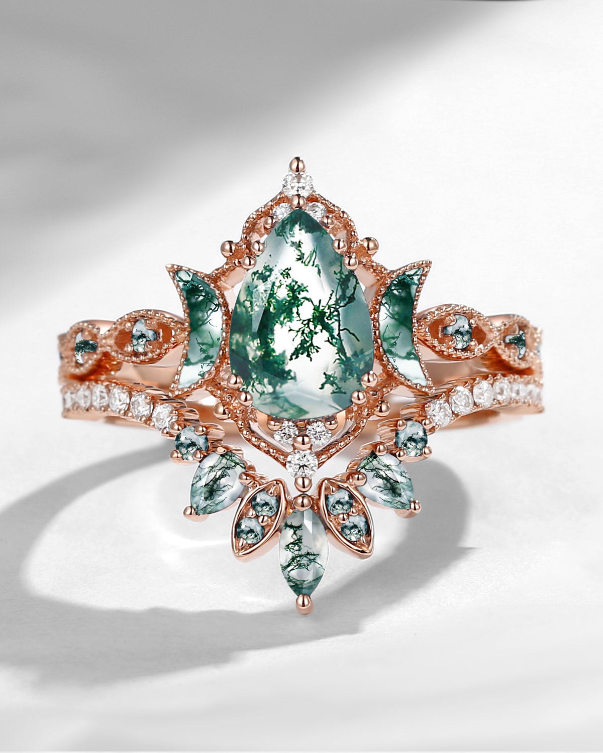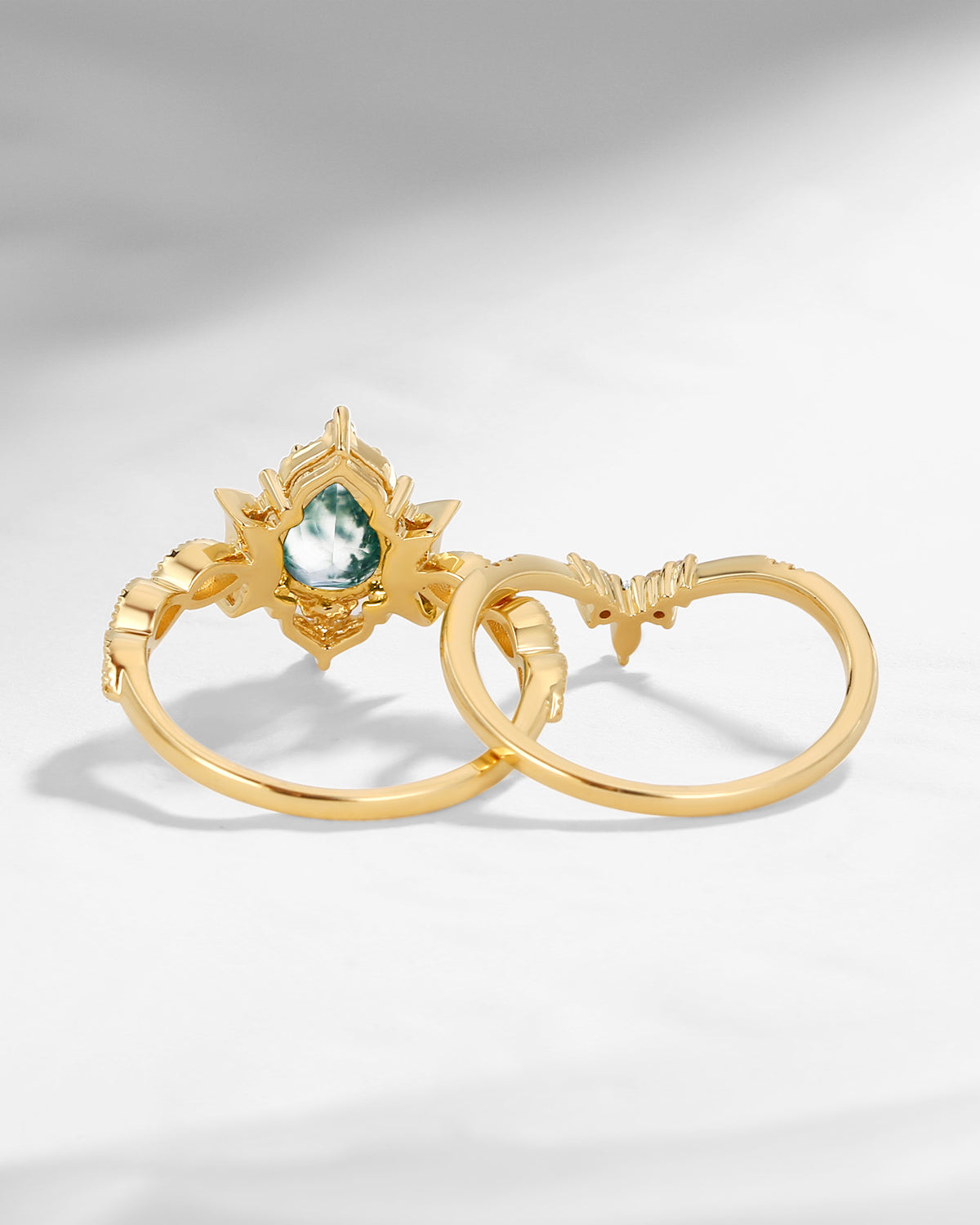Crescent Moon | Pear Shaped Art Deco Lab Pink Diamond Engagement Ring Set 2pcs