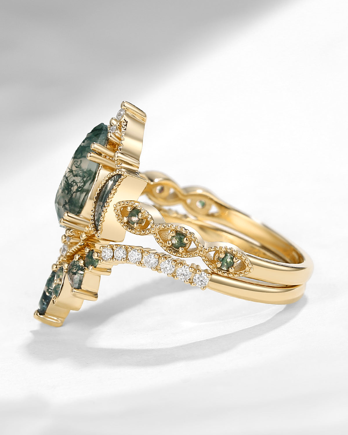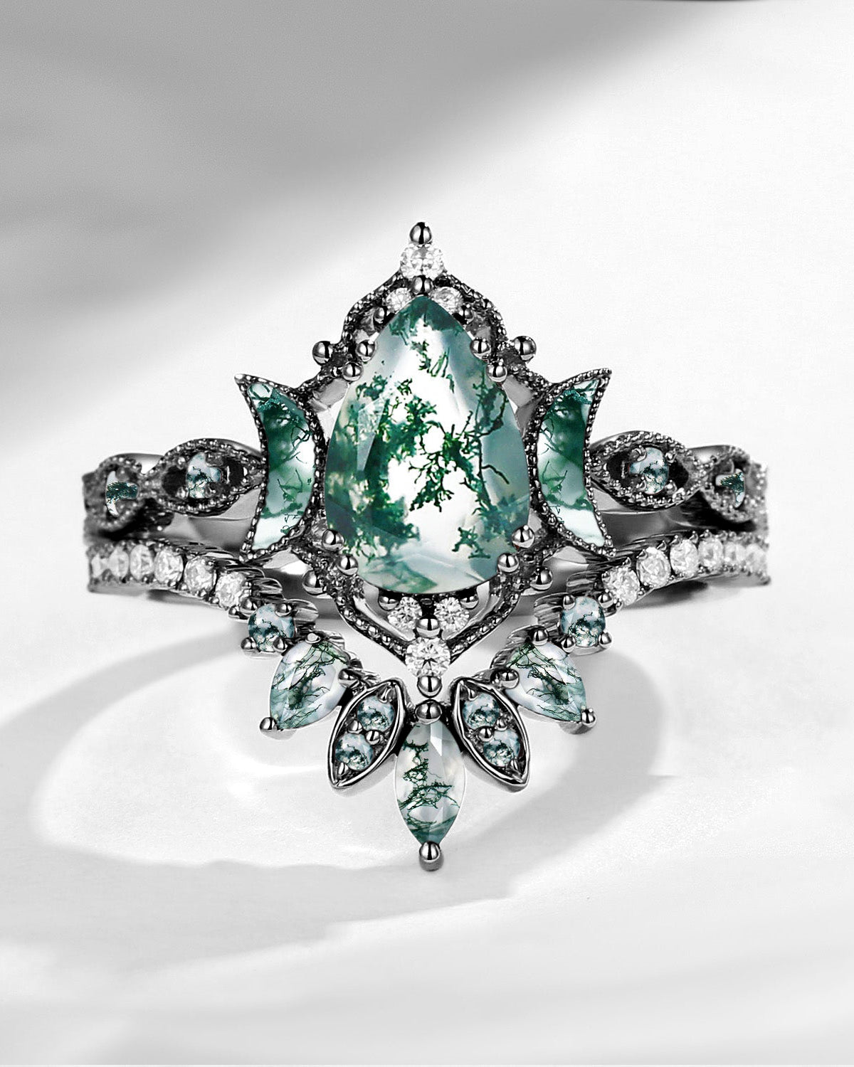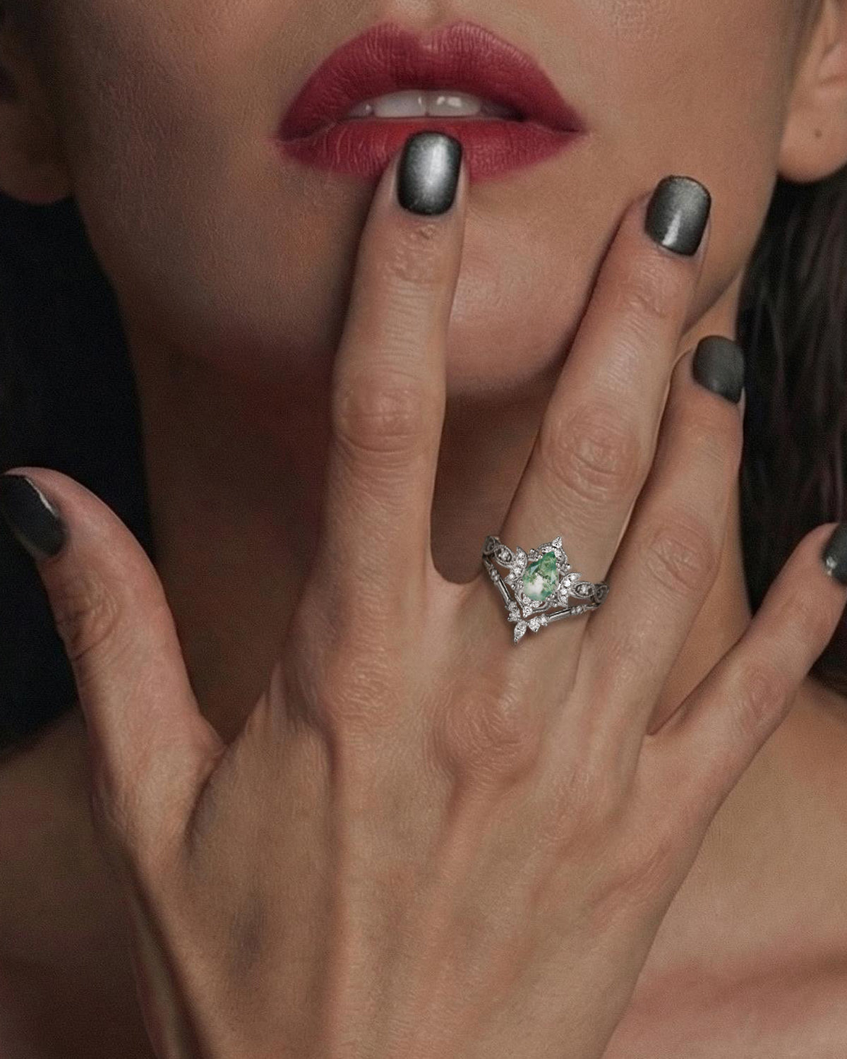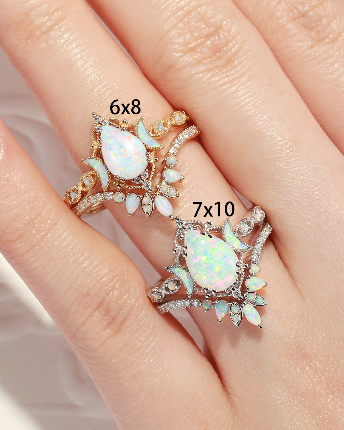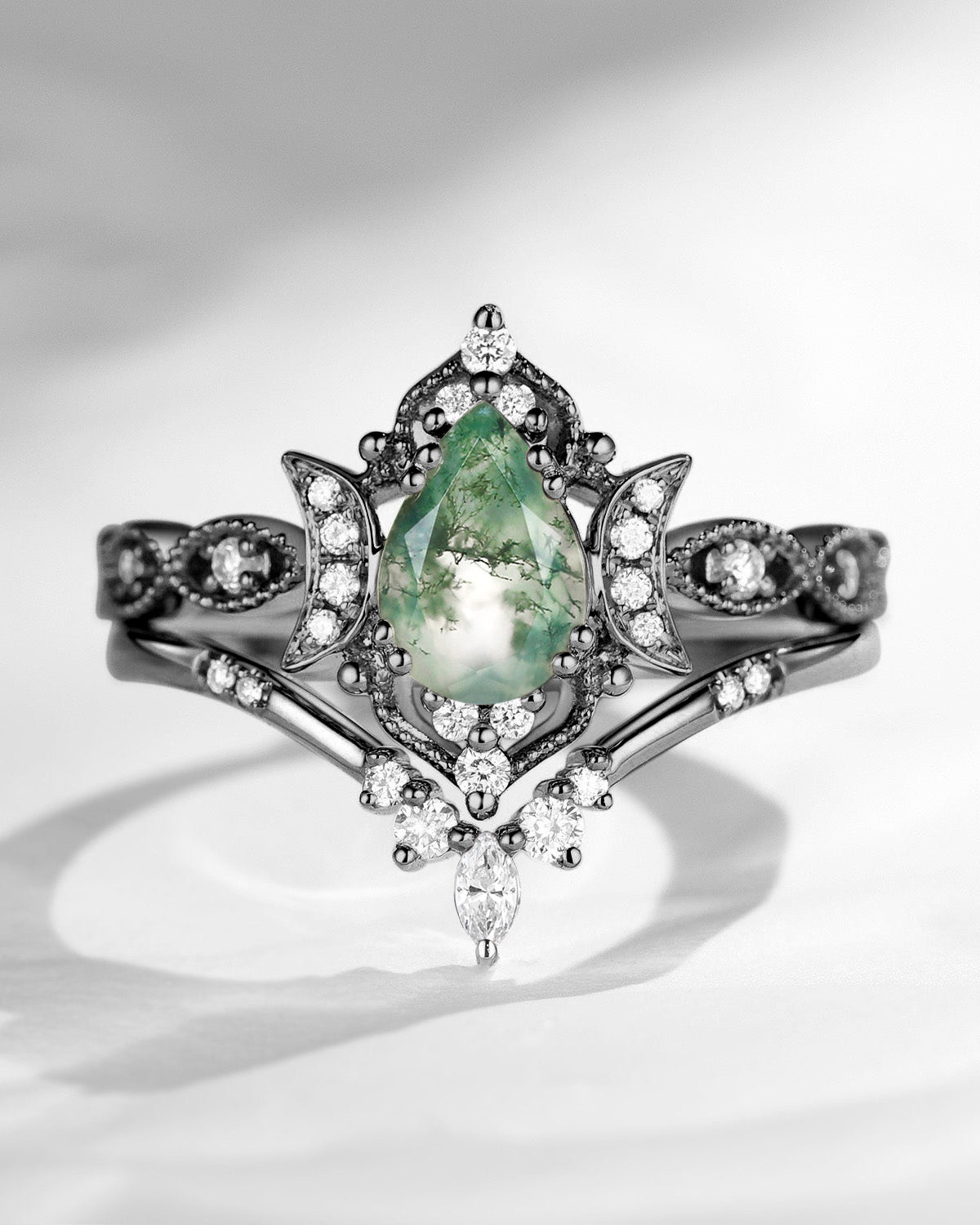 Crescent Moon | Pear Shaped Art Deco Lab Pink Diamond Engagement Ring Set 2pcs