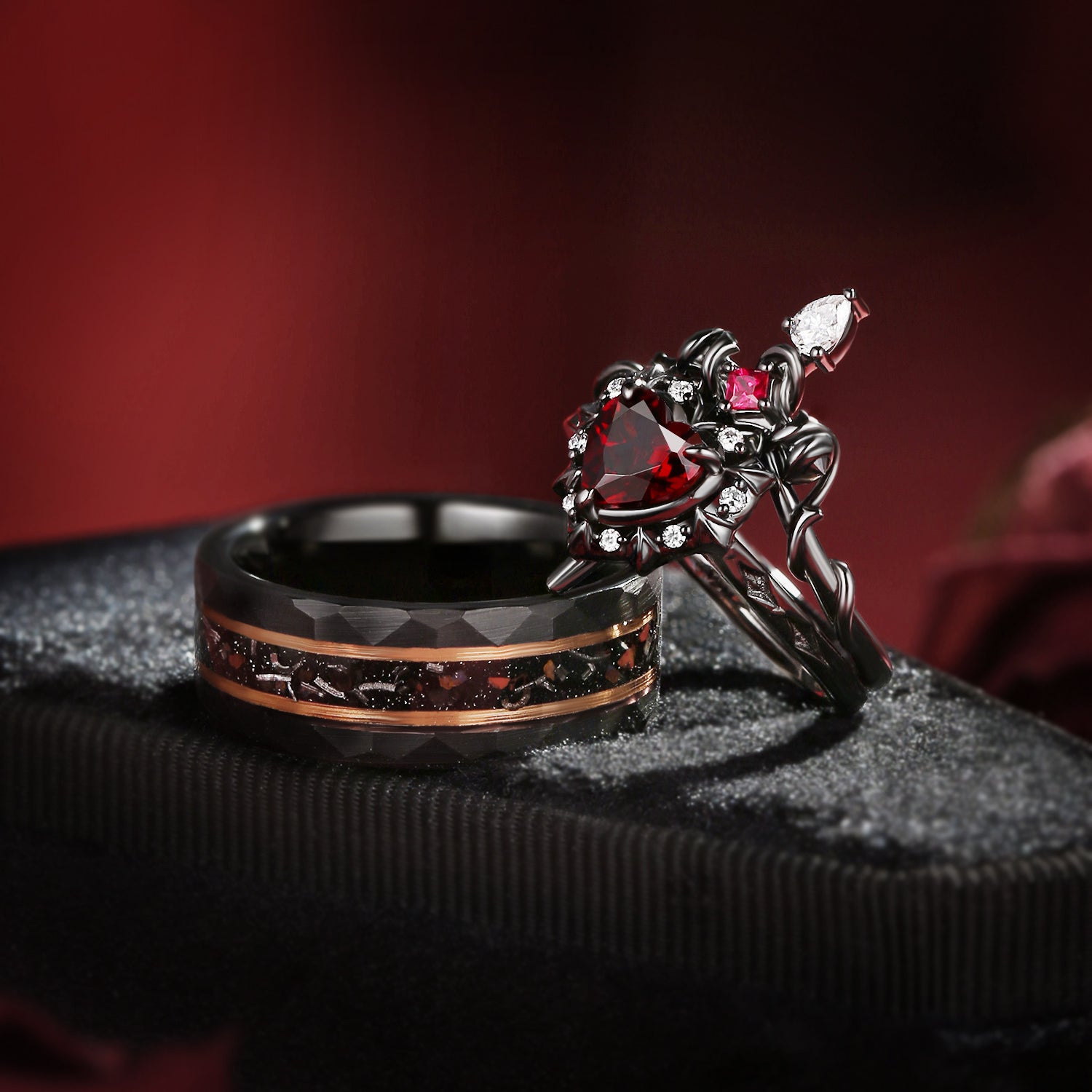 Heart Shaped Garnet Black Gold 'Cupid's Arrow' & Strips Band Couple Bridal Ring Set