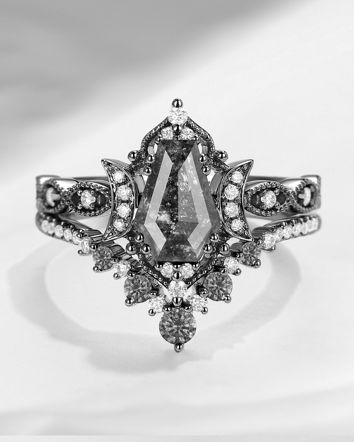 Crescent Moon | Coffin Cut Salt and Pepper Diamond Art-Deco Engagement Ring Set 3pcs