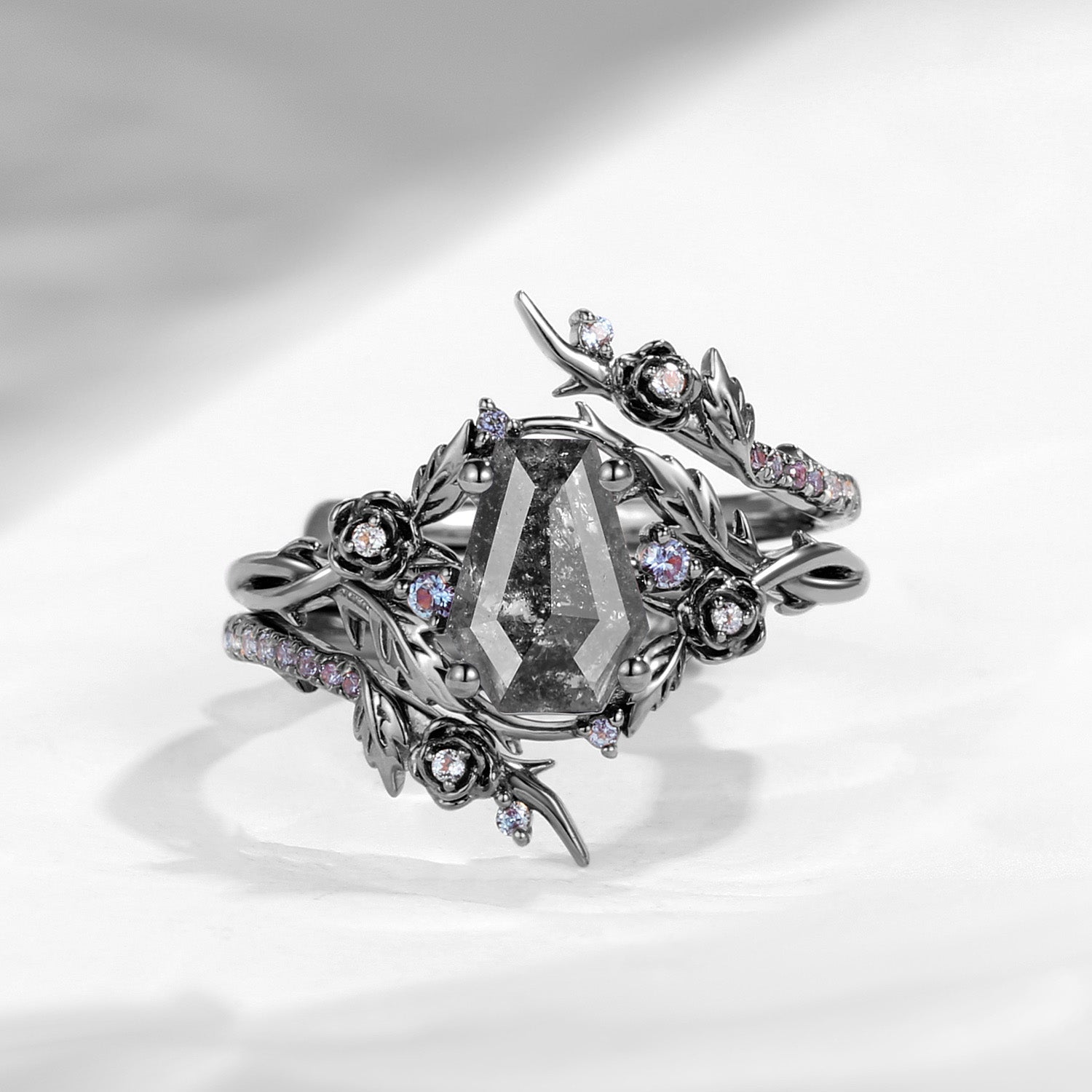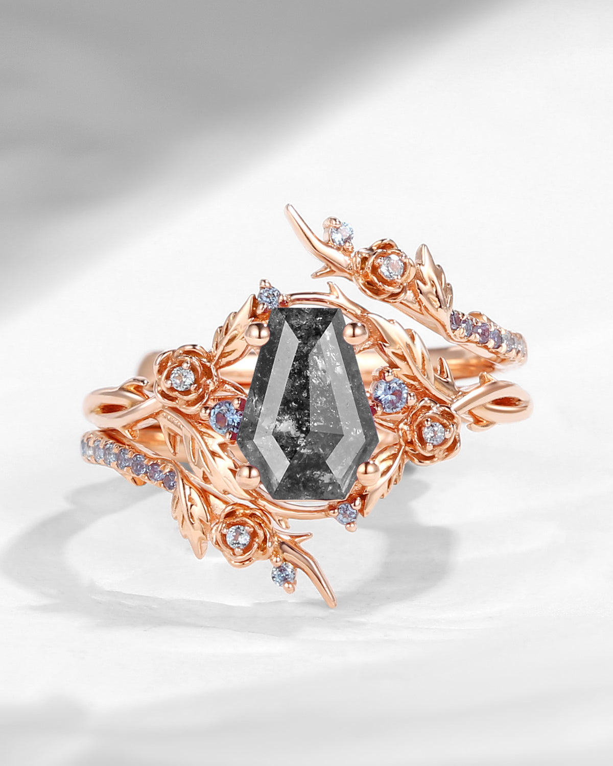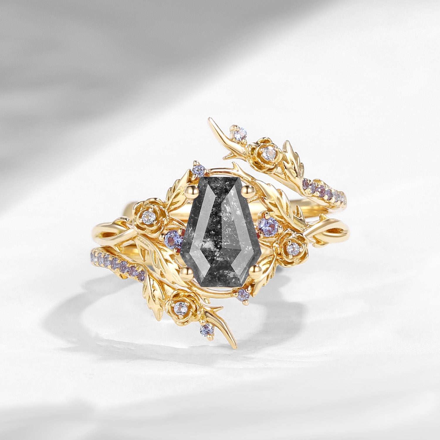 Nature Inspired Twist Coffin Cut Salt & Pepper Diamond Engagement Ring Set 2pcs