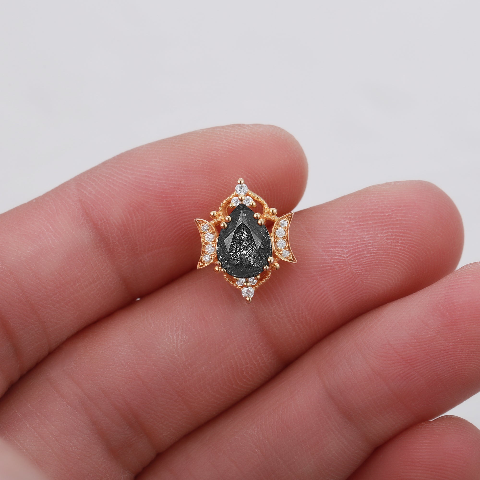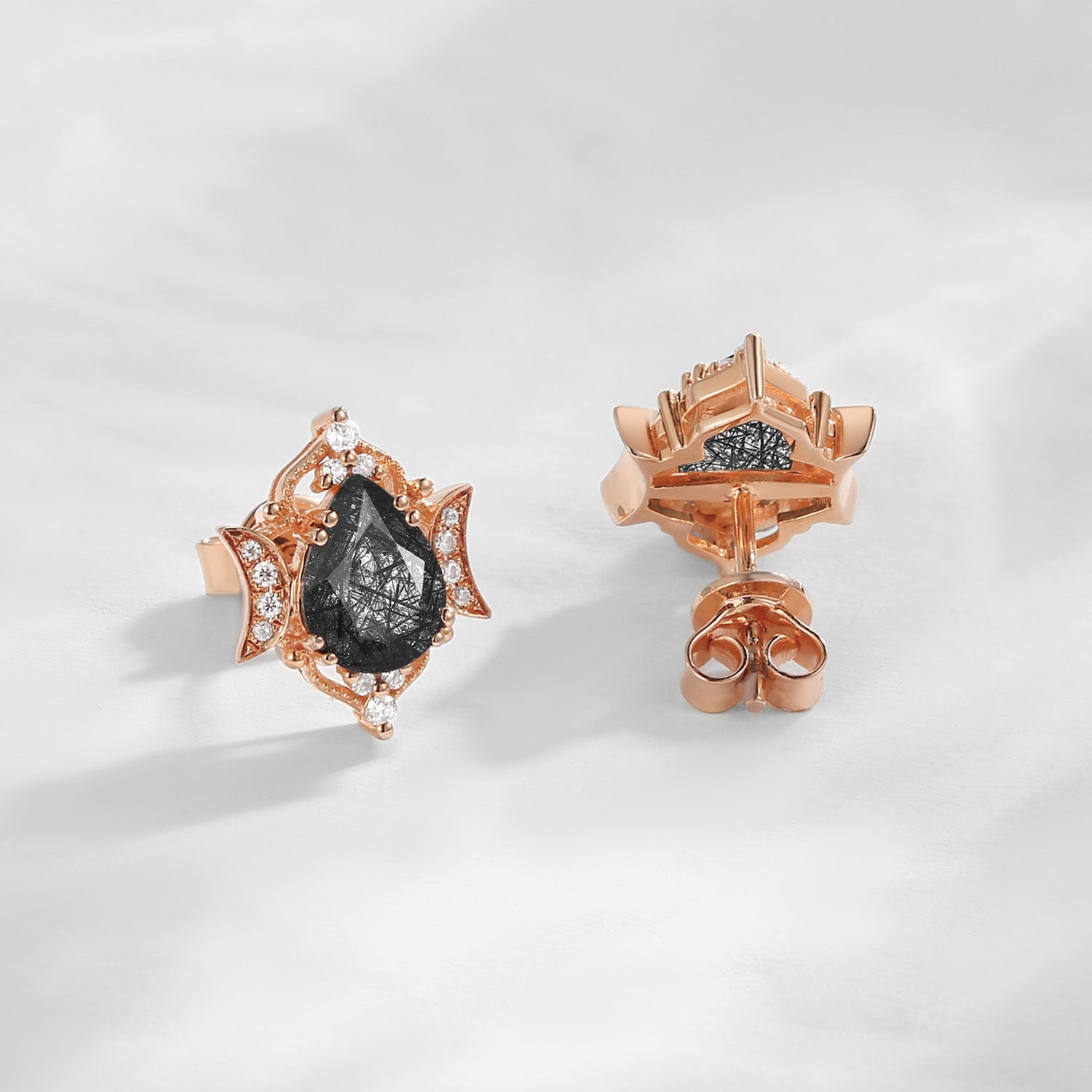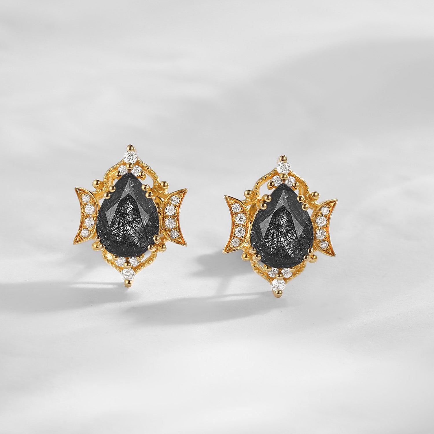 Crescent Moon Vintage Pear Cut Black Rutilated Quartz Earrings