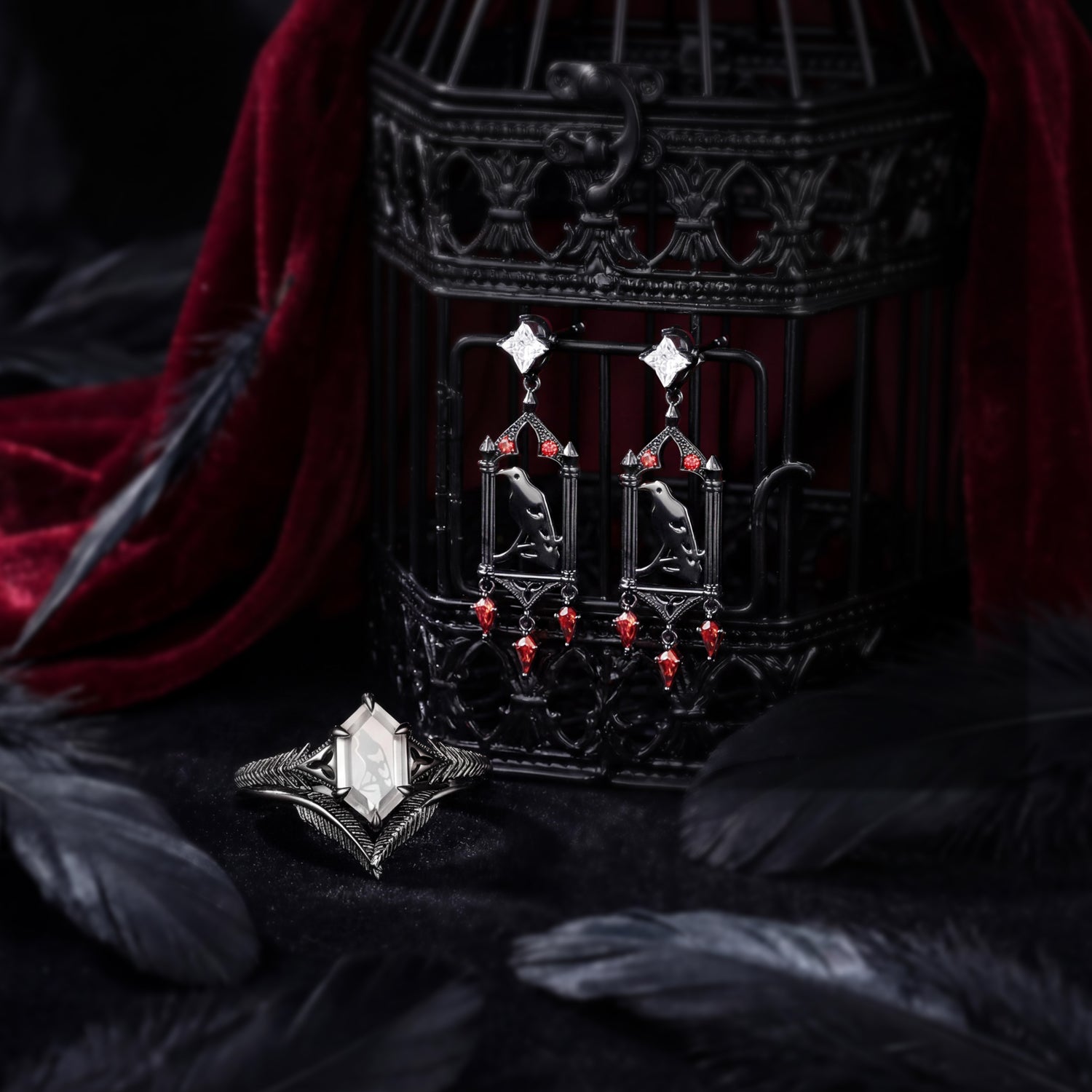 Gothic Dark Crow Inspired Long Hexagon Moissanite Black Inspired Jewelry - 'Caged Bird' Jewelry Box