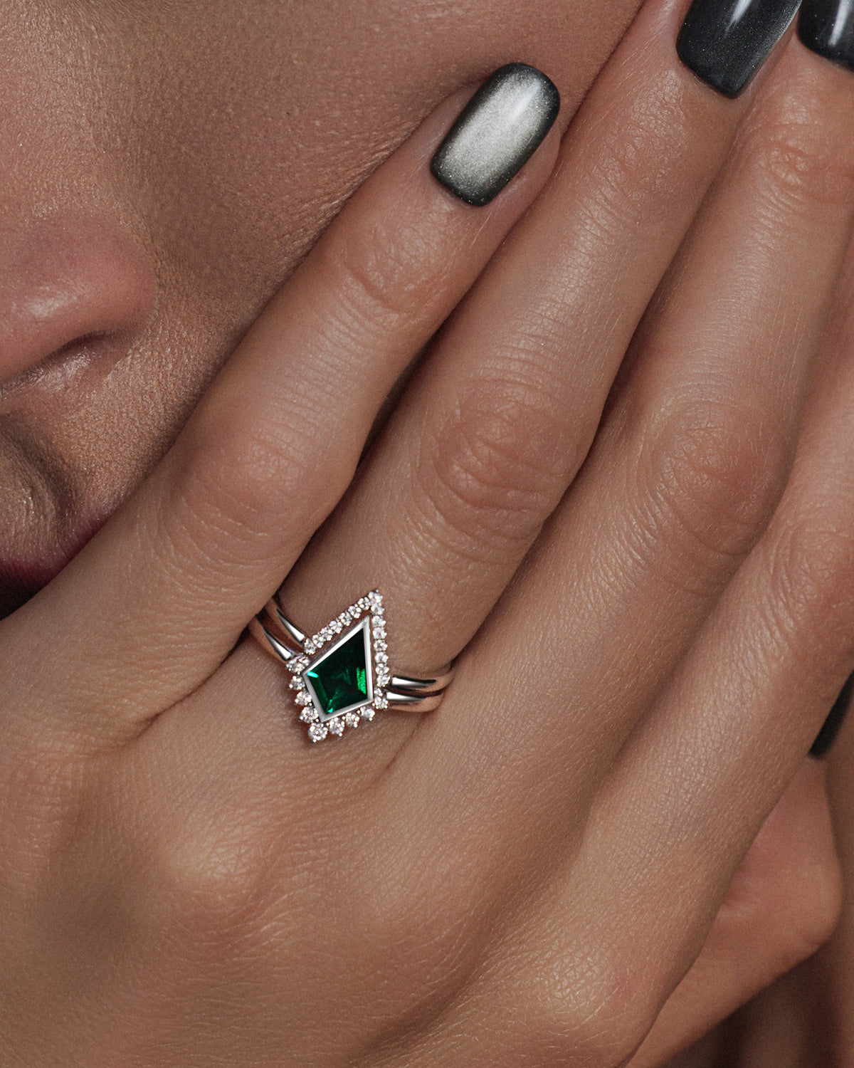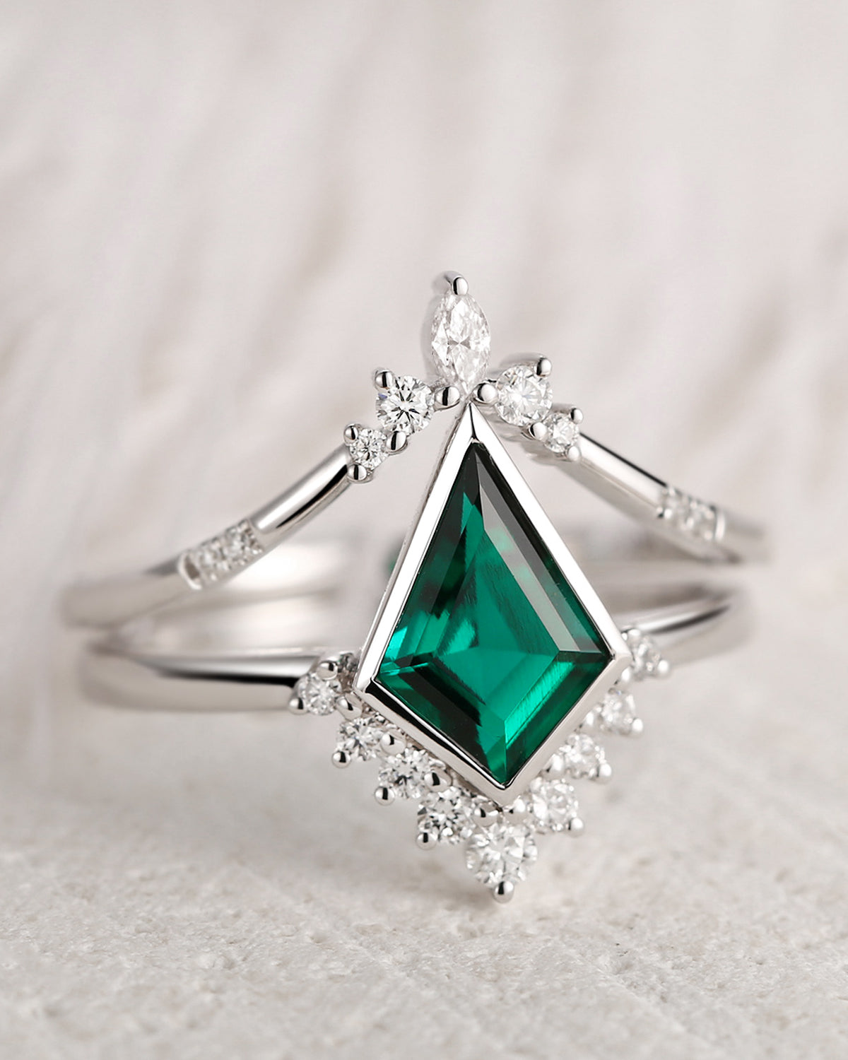 Crescent Moon | Unique Kite Cut Lab Emerald Engagement Ring Set 2pcs - Luna