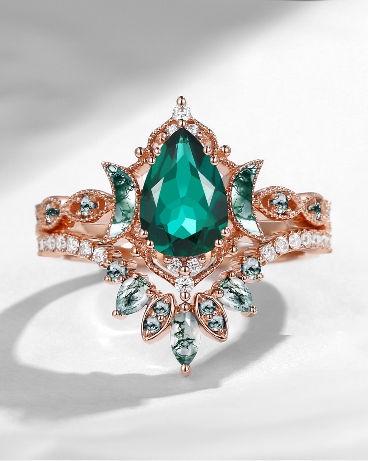 Crescent moon | Antique Pear Cut Lab Emerald Engagement Ring Set 3pcs