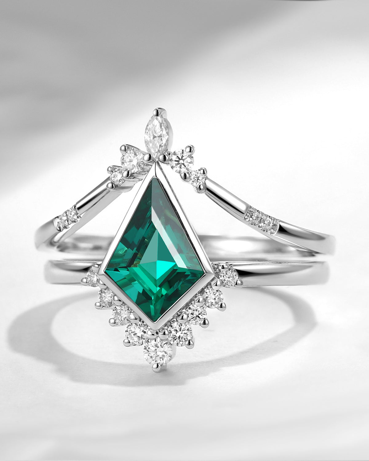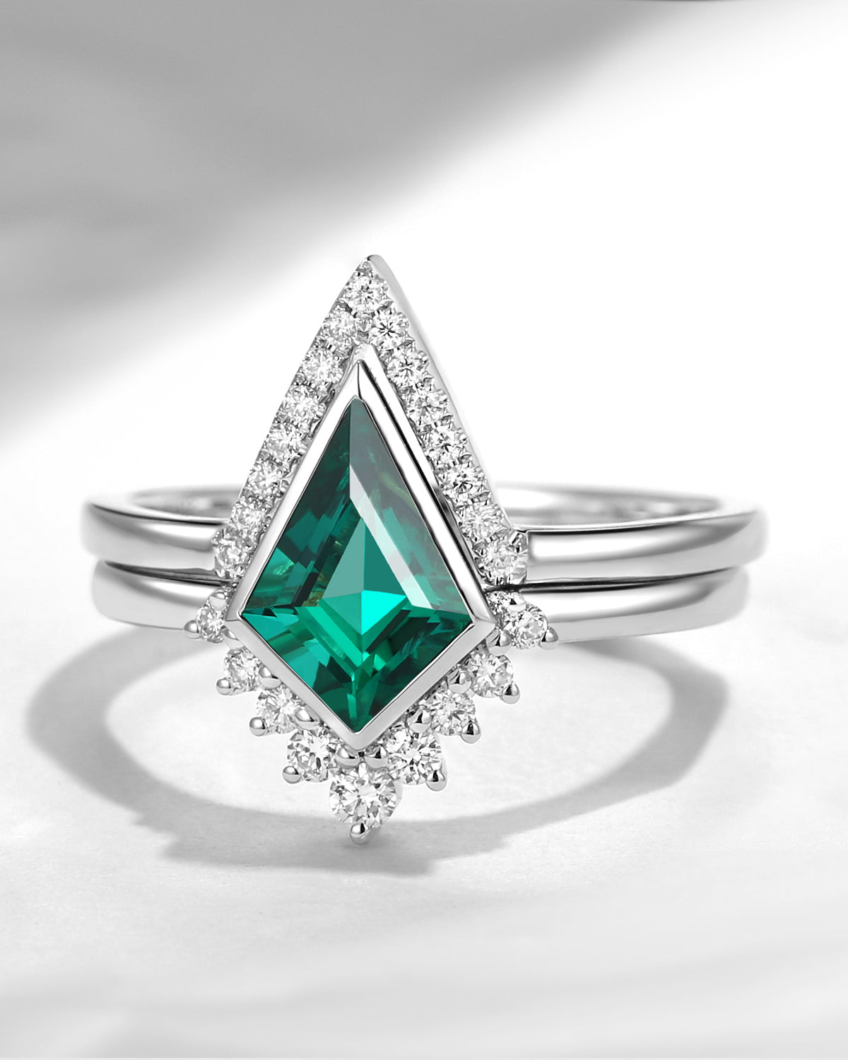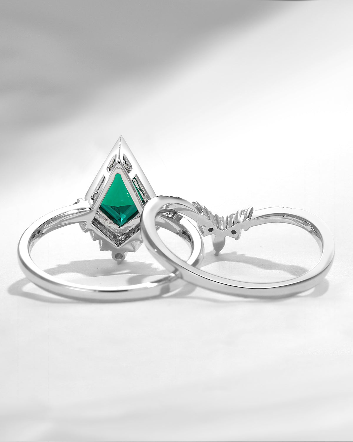 18K Kite Shaped Lab Emerald Engagement Ring Set 2pcs