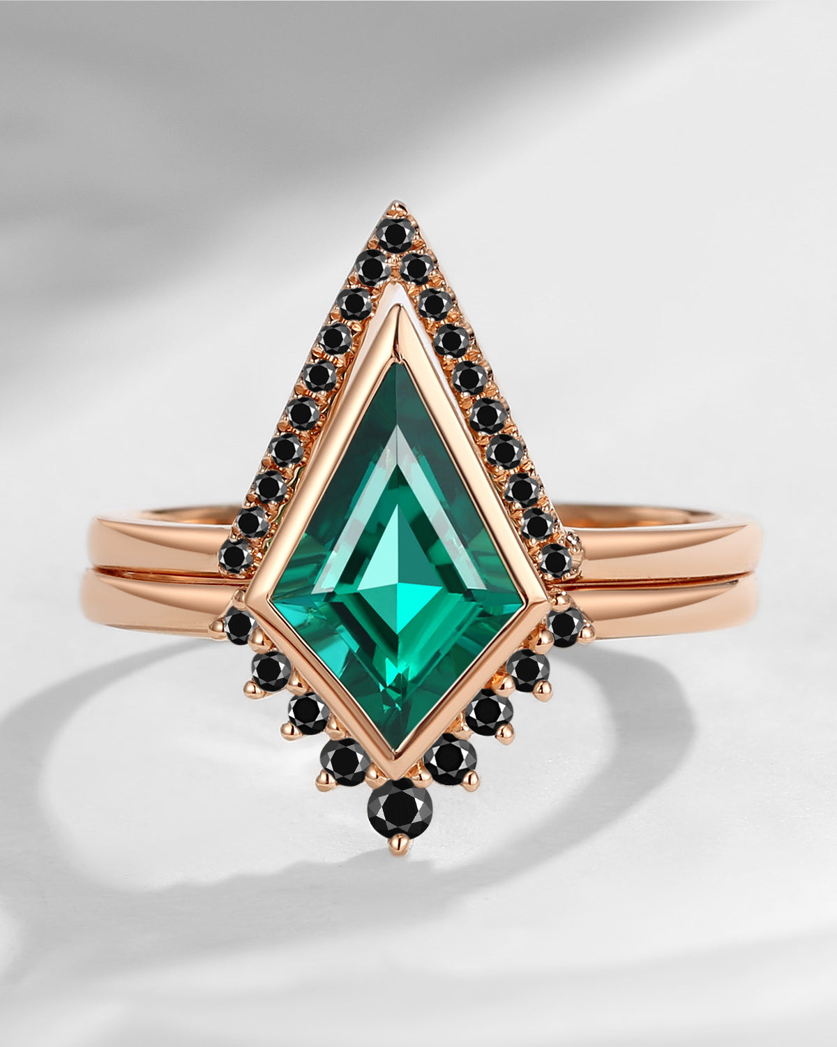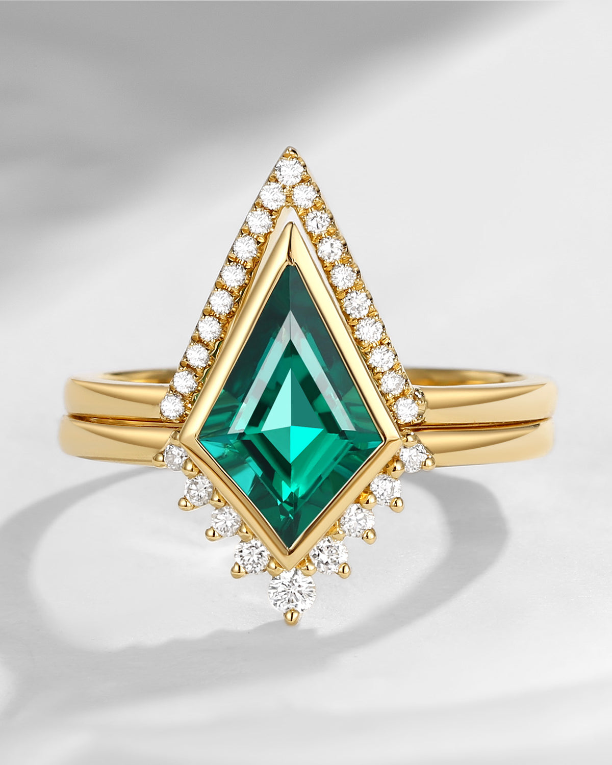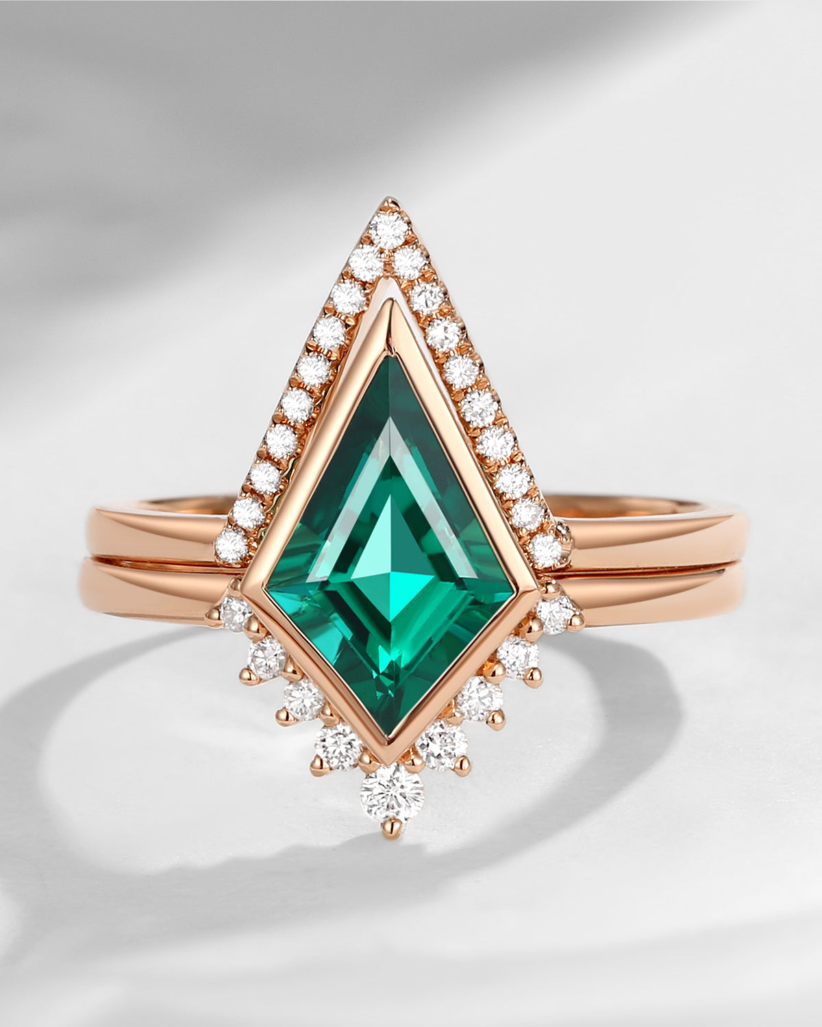18K Kite Shaped Lab Emerald Engagement Ring Set 2pcs