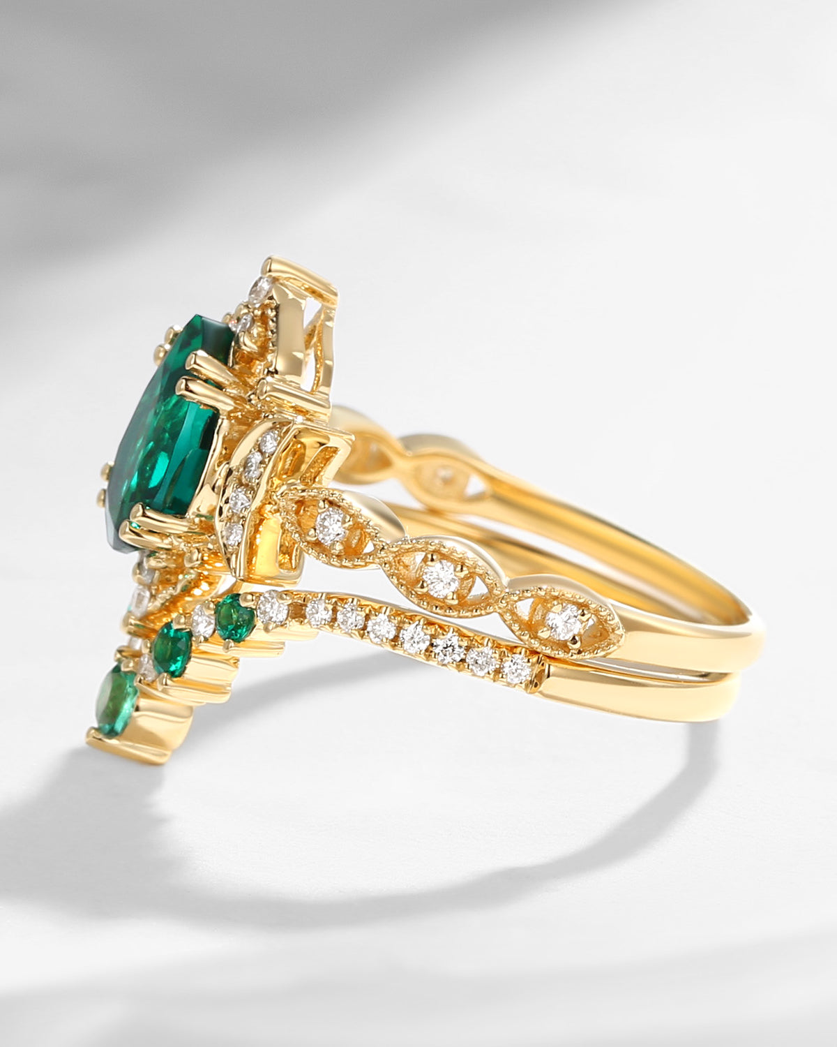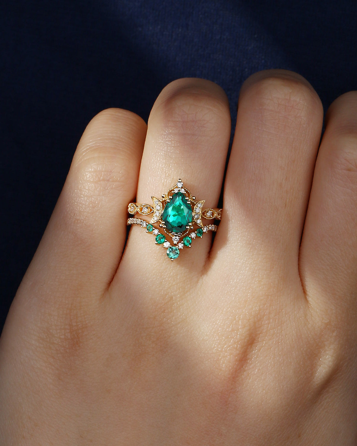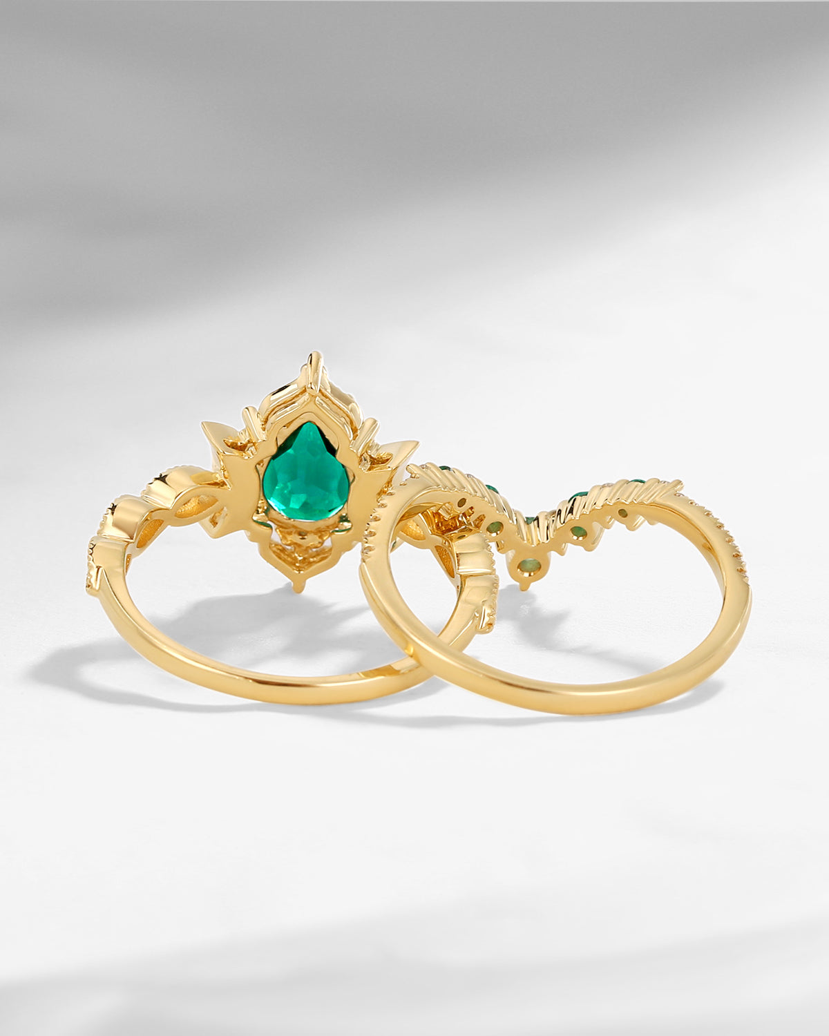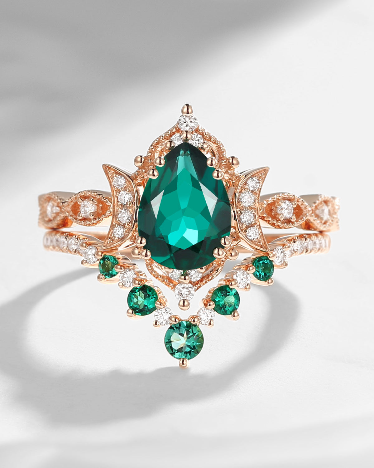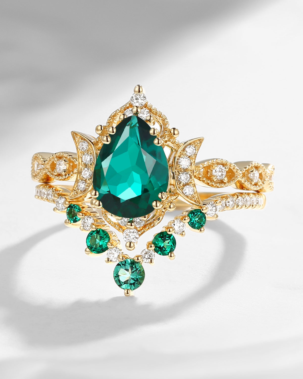 Crescent Moon | Pear Cut Lab Emerald Engagement Ring Set 2PCS 18K