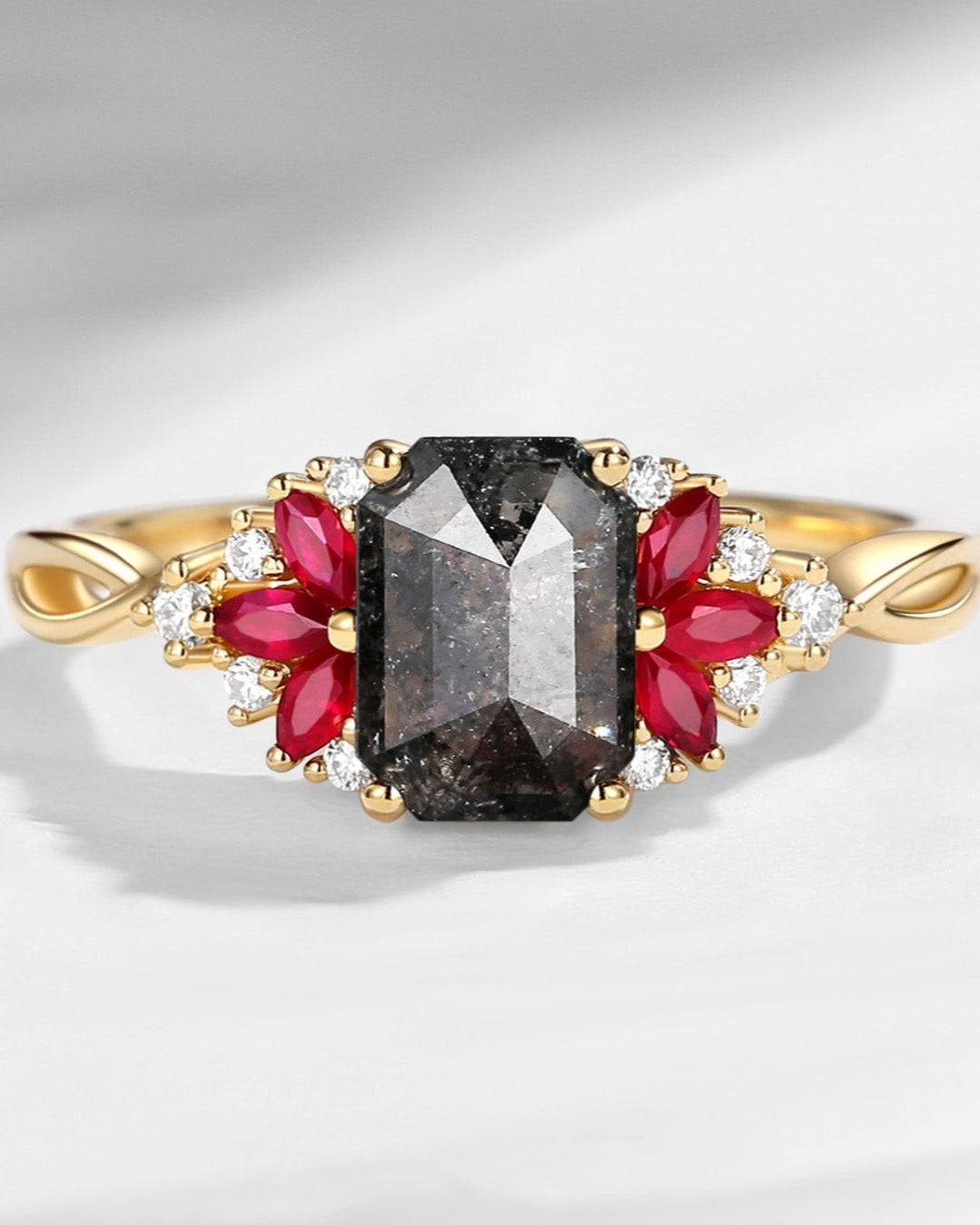 Cluster Emerald Cut Salt And Pepper Diamond & Ruby Twist Engagement Ring