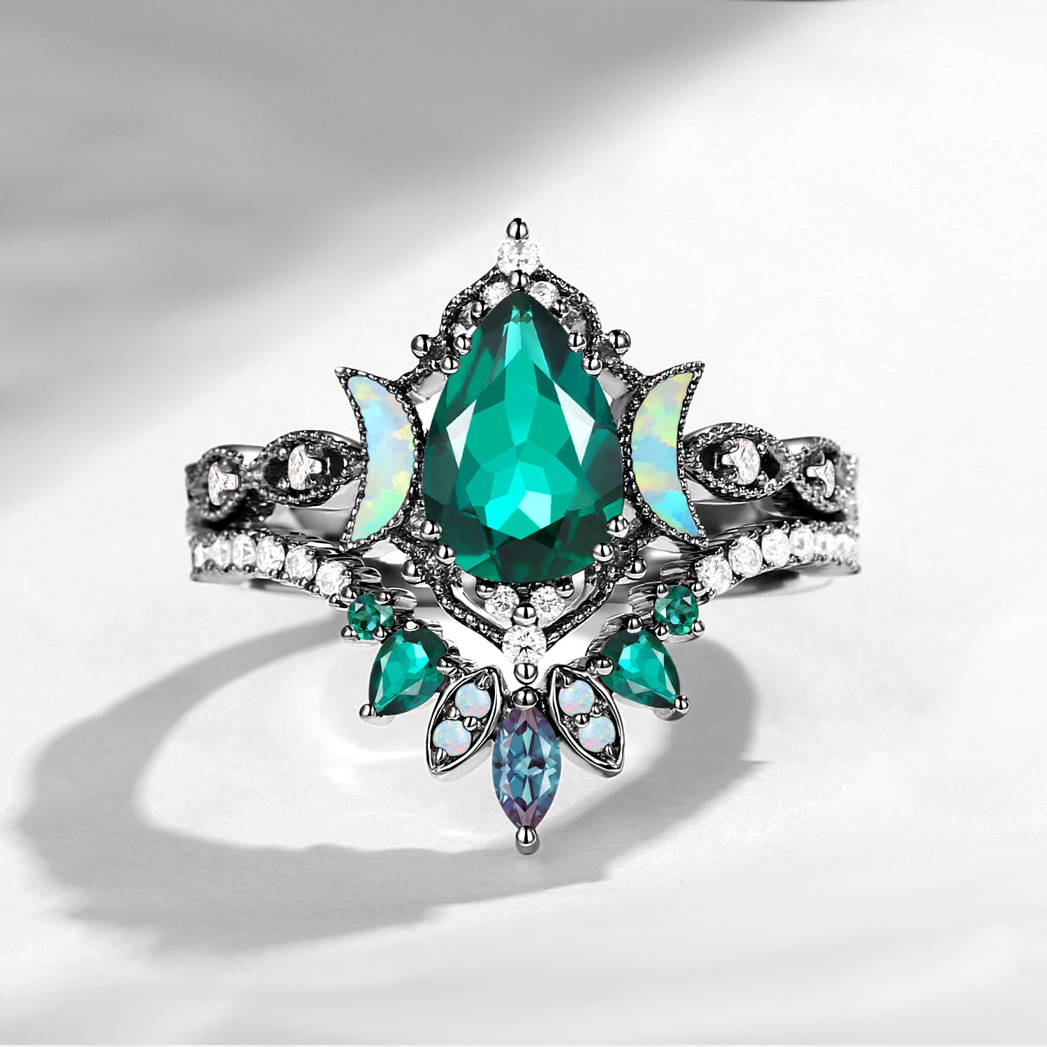 Crescent Moon | Pear Cut Lab Emerald 'Ultra Galaxy' Lab Opal Engagement Ring Set 2pcs