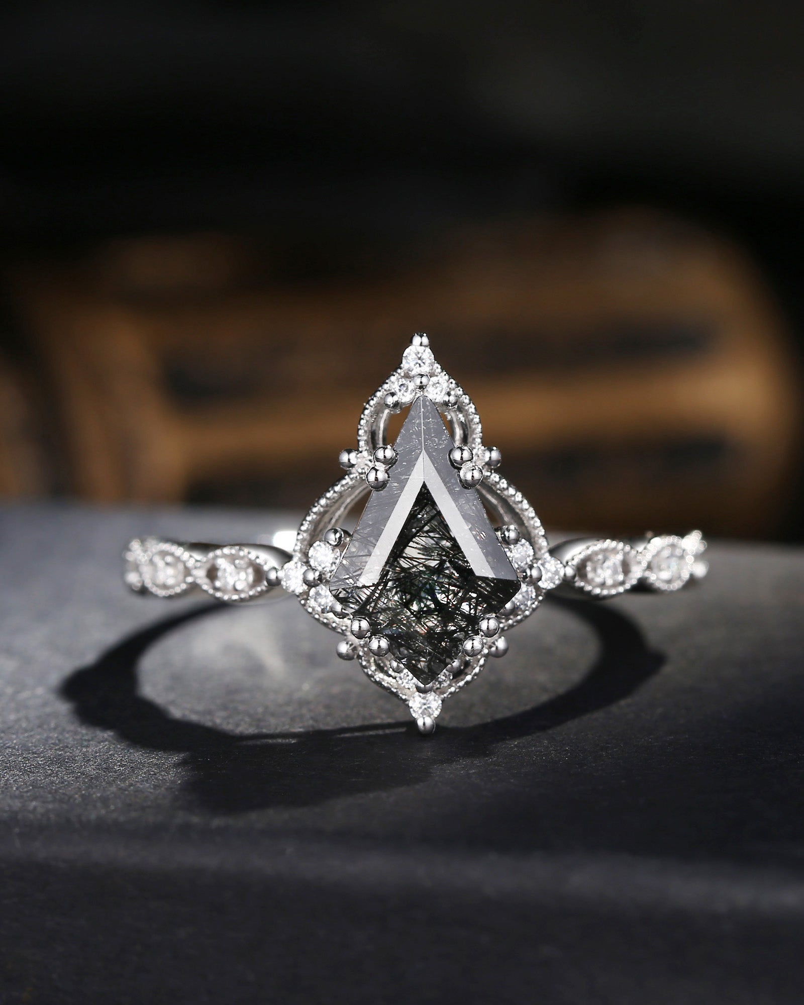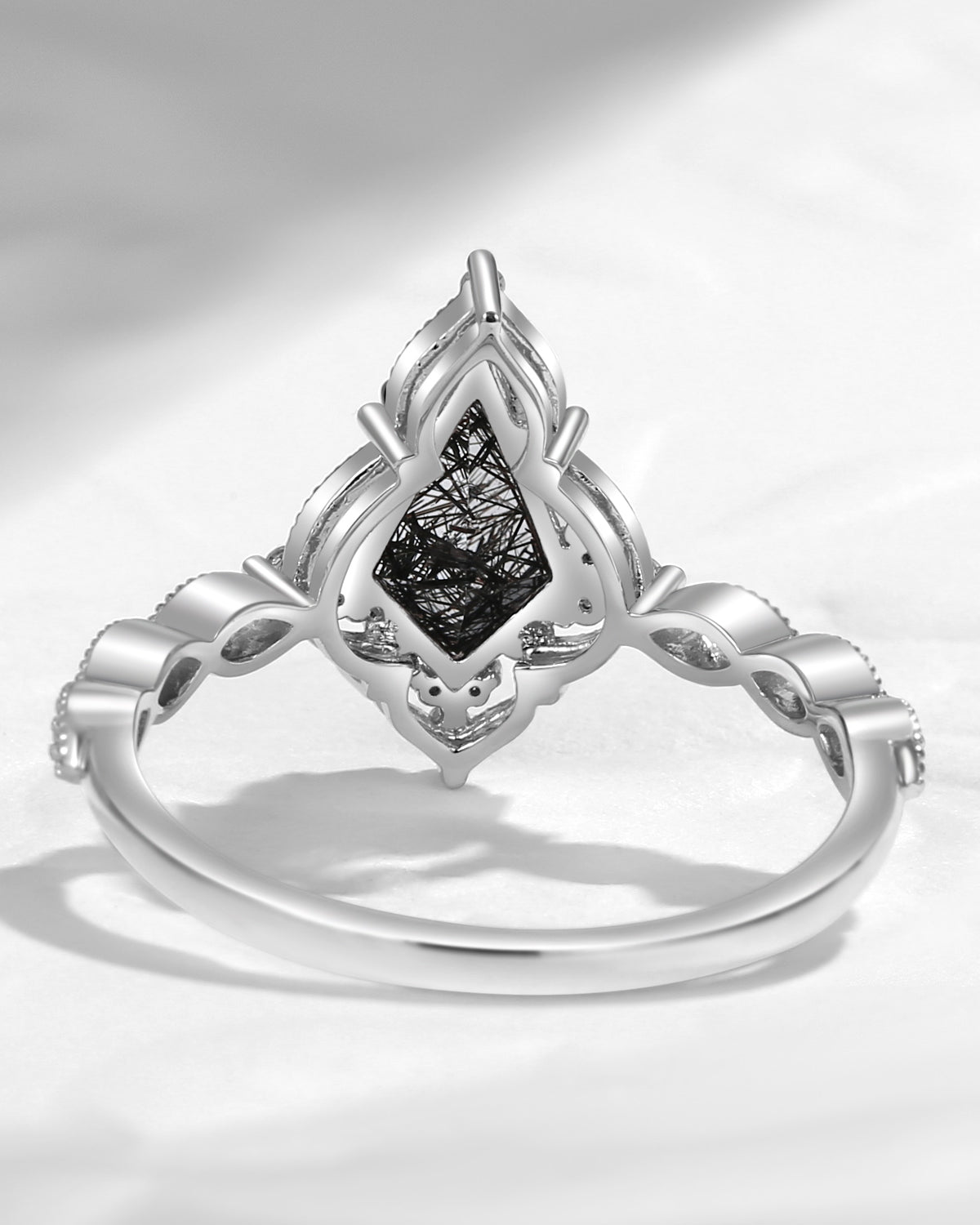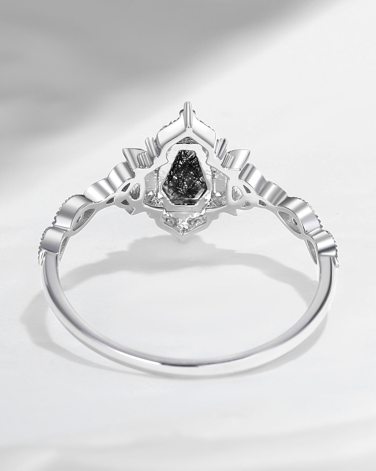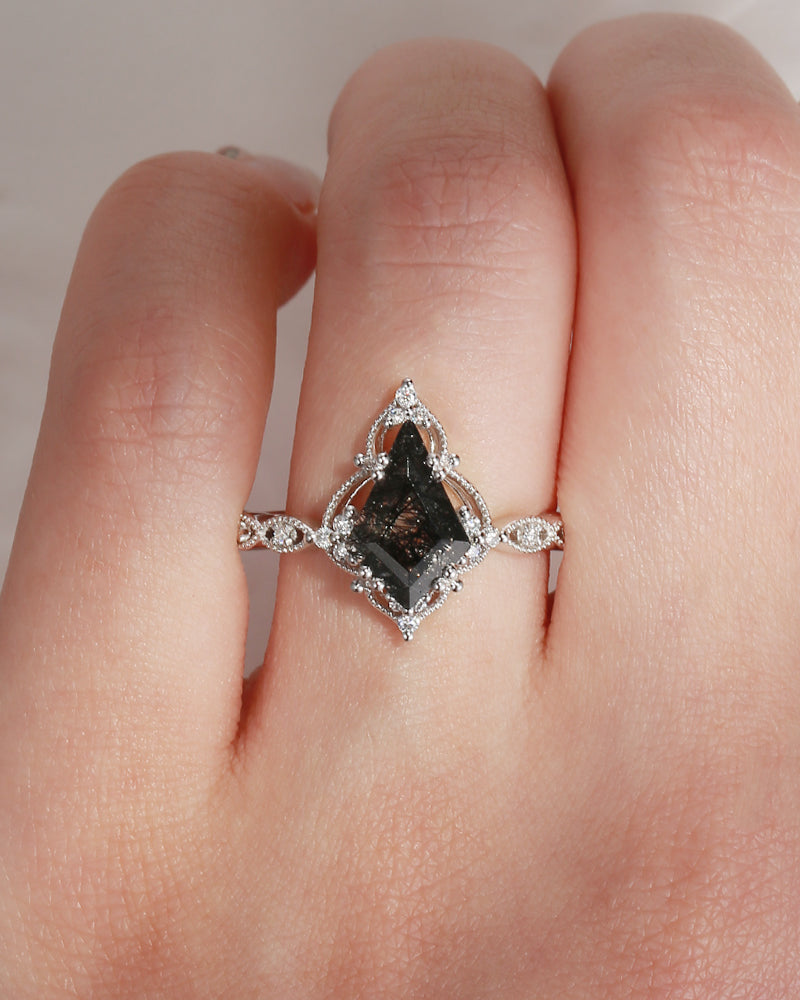 Vintage Inspired Milgrain Kite Cut Black Rutilated Quartz Engagement Ring