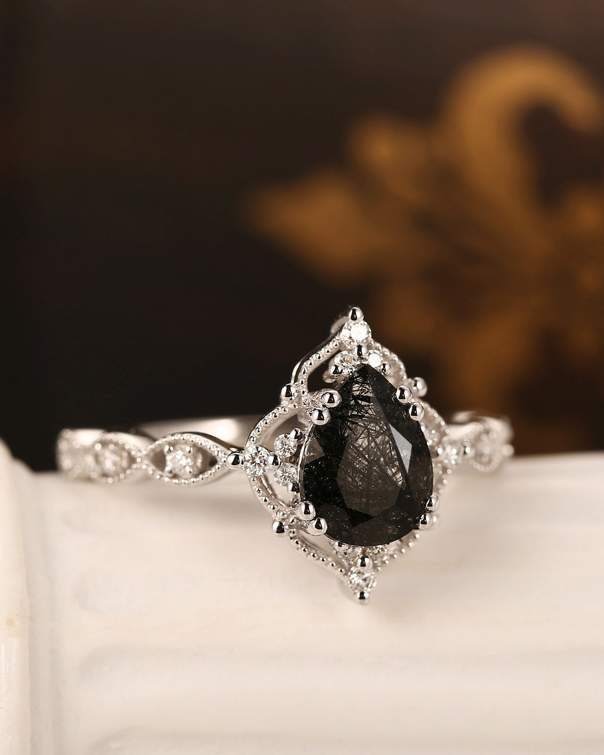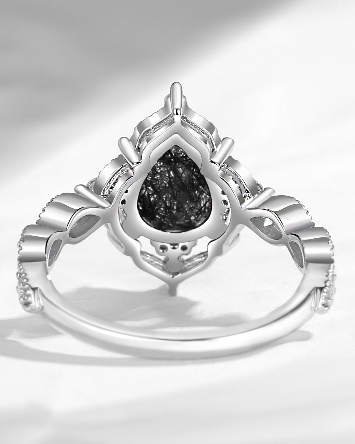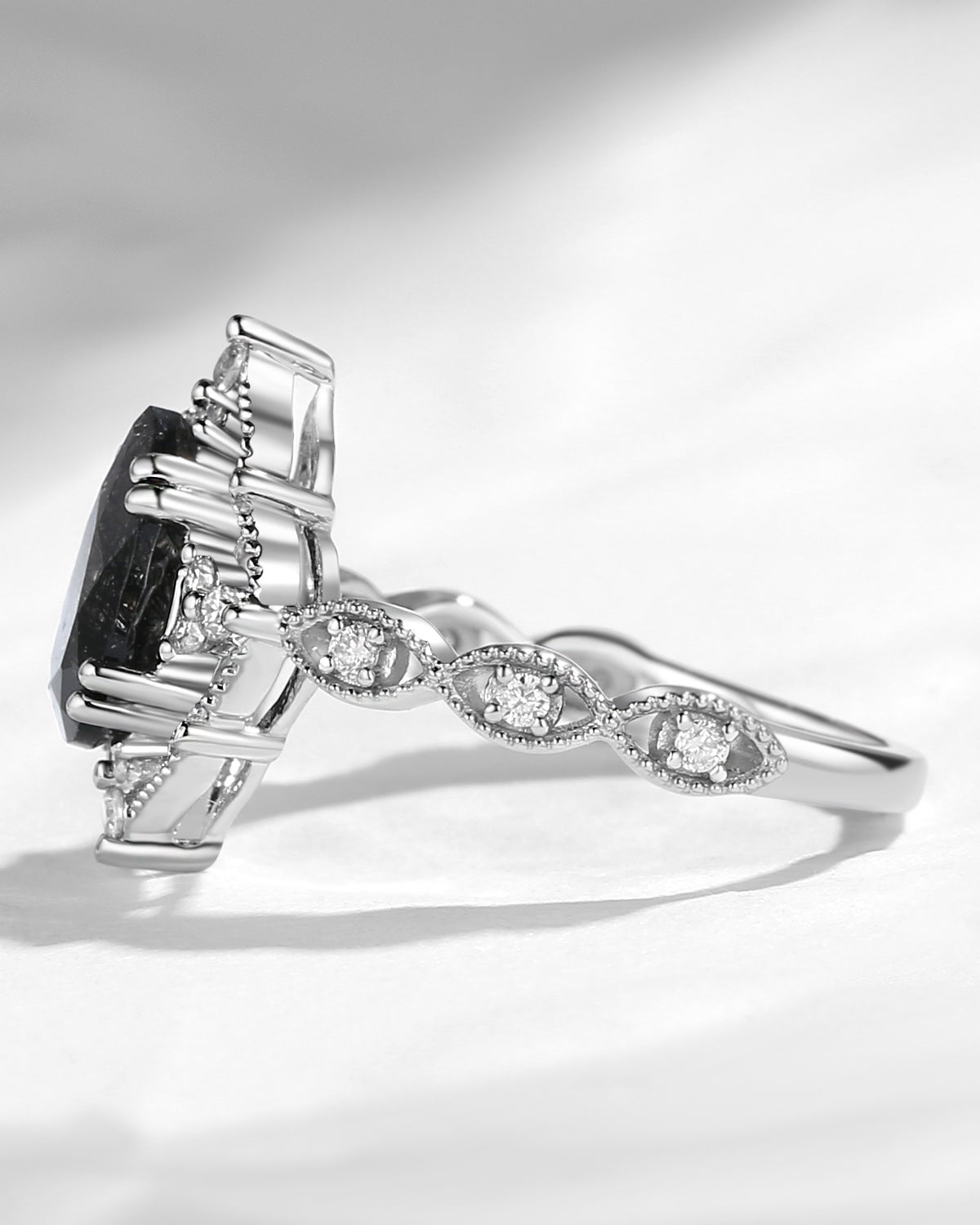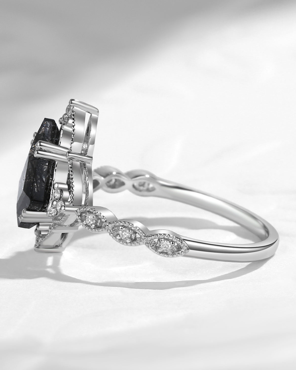 Vintage Inspired Milgrain Kite Cut Black Rutilated Quartz Engagement Ring