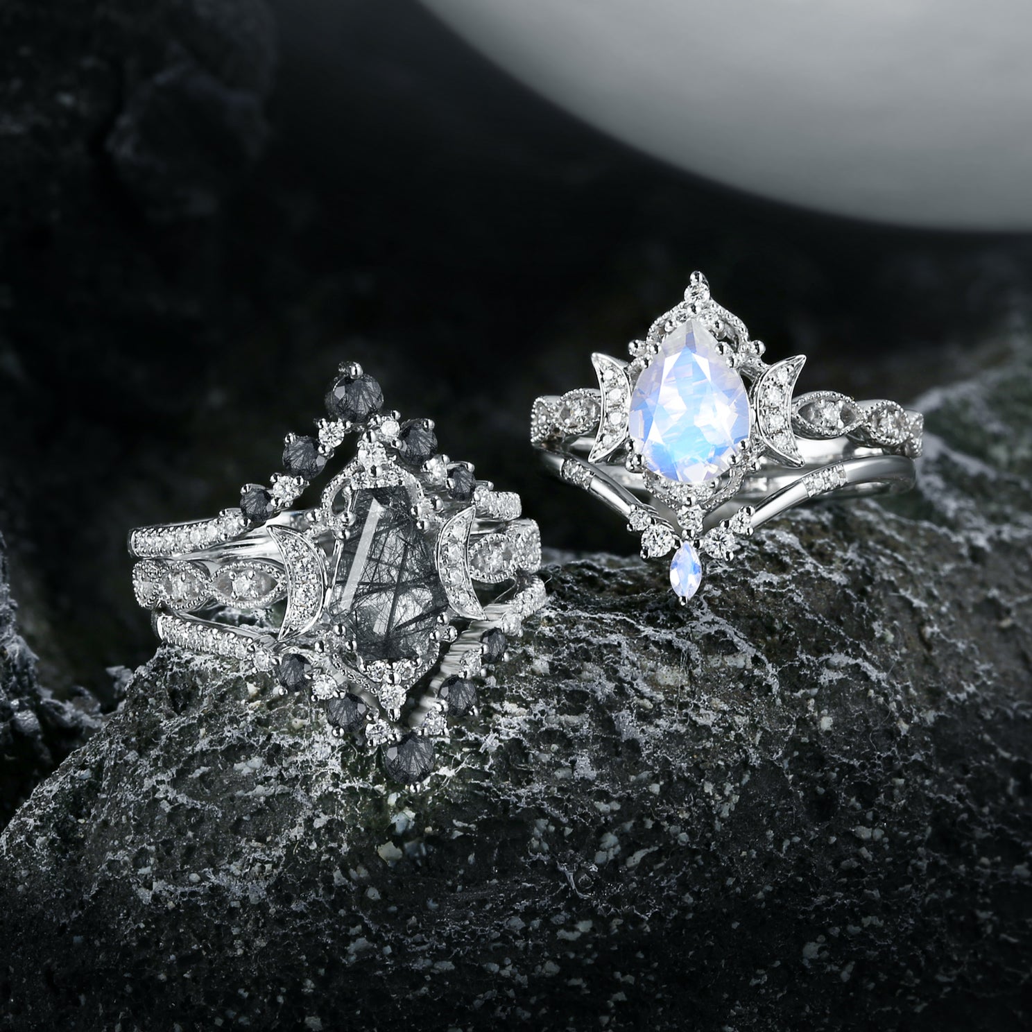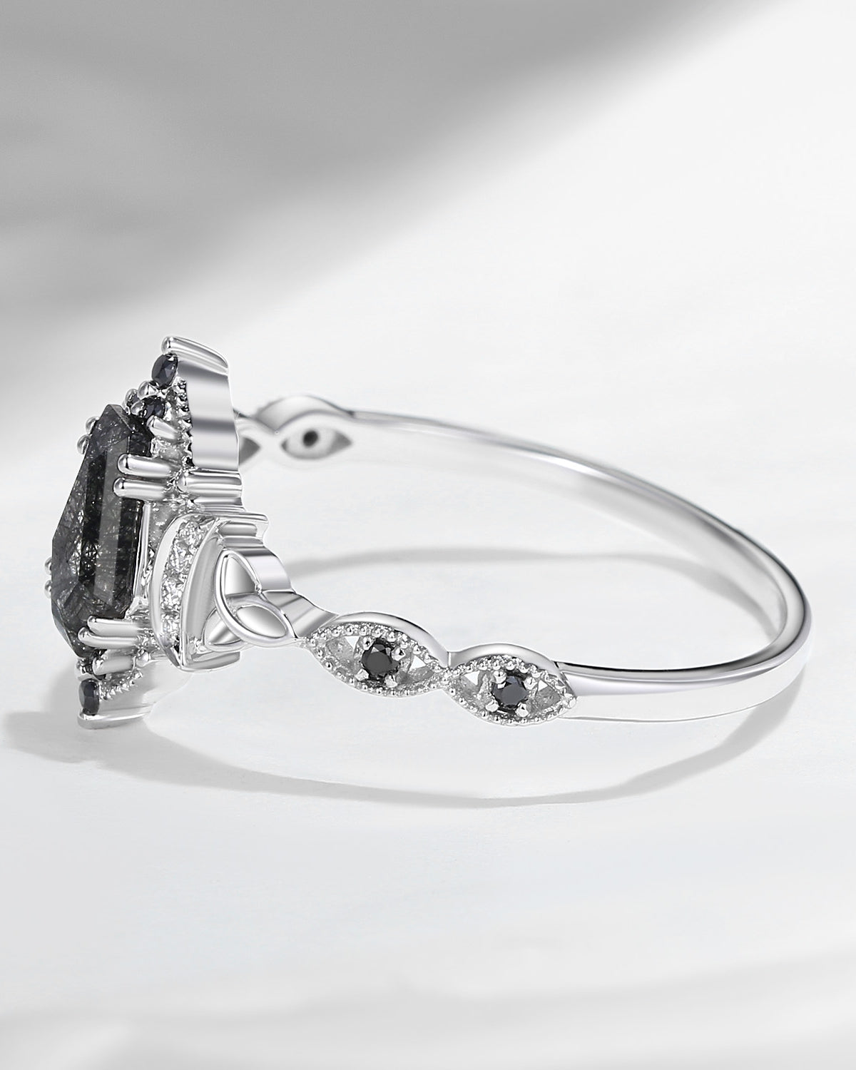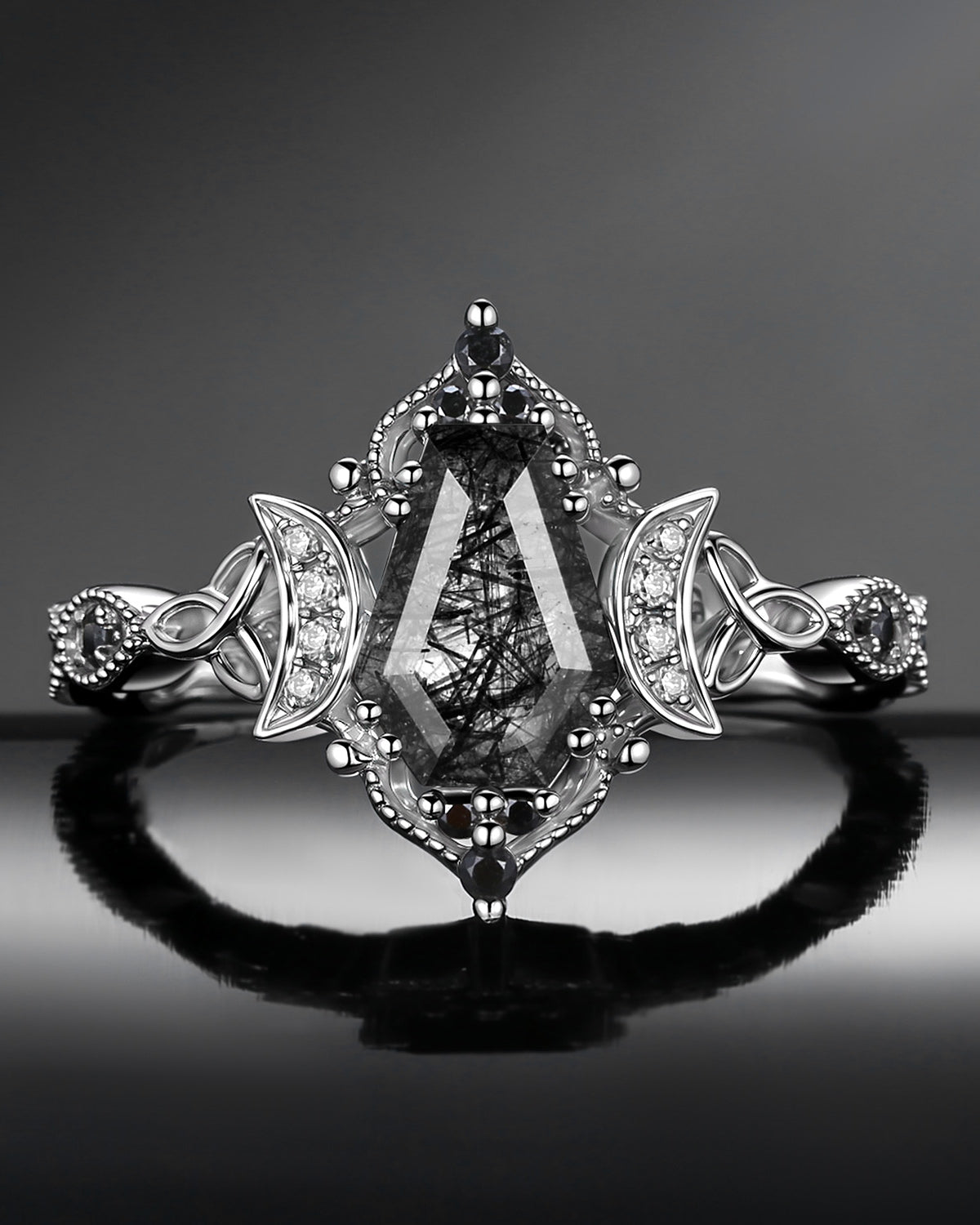Crescent Moon | Unique Coffin Black Rutilated Quartz Infinity Celtic Engagement Ring