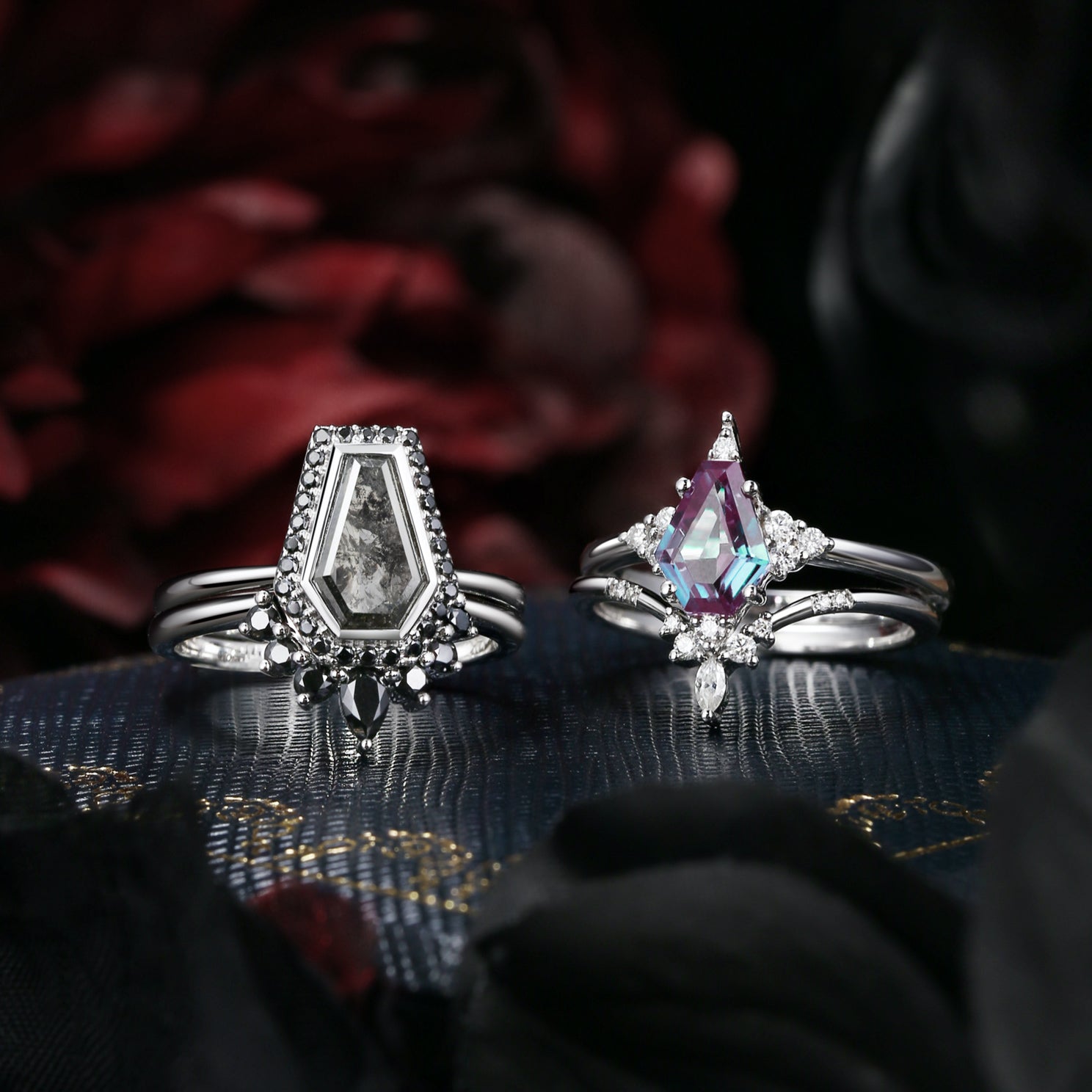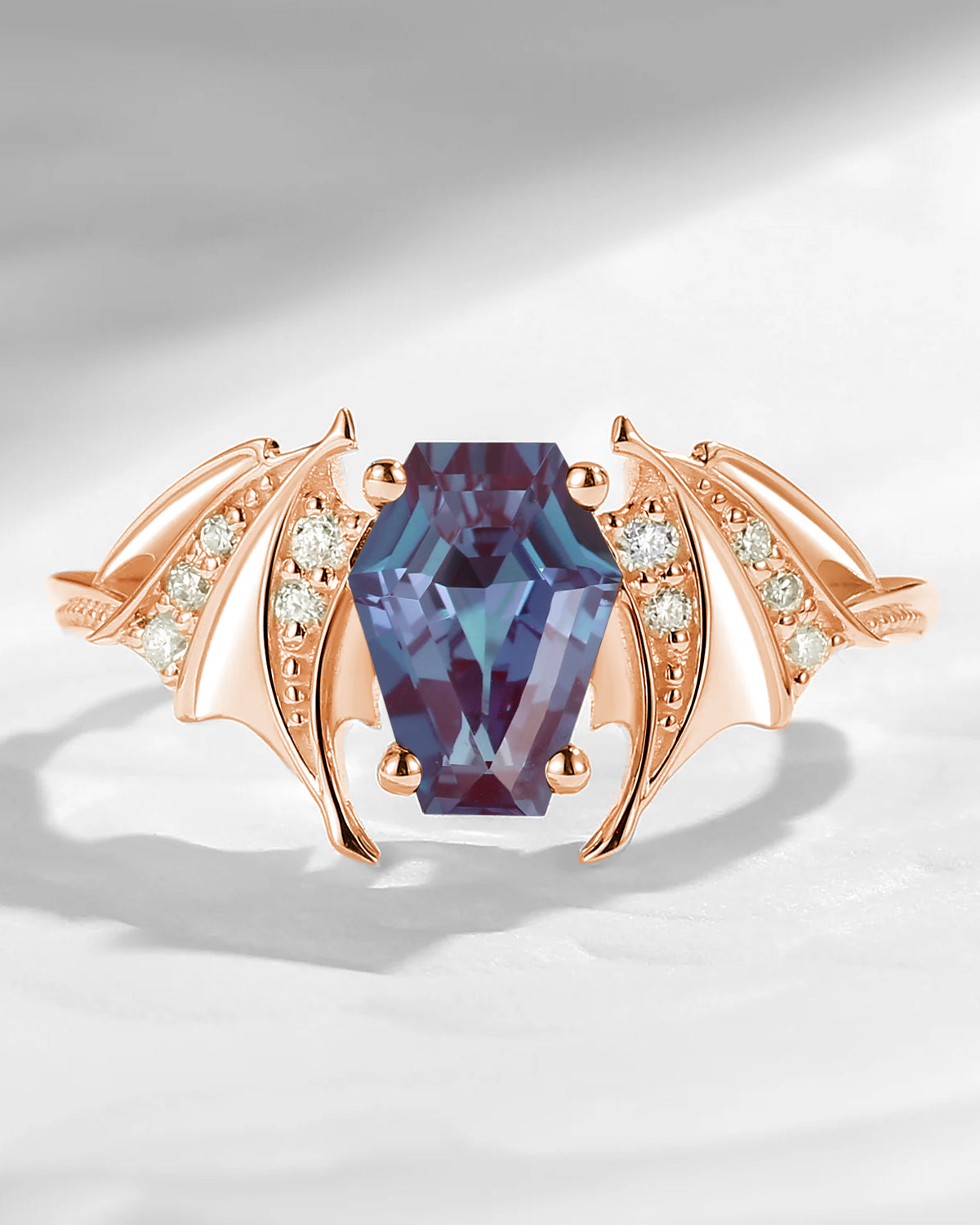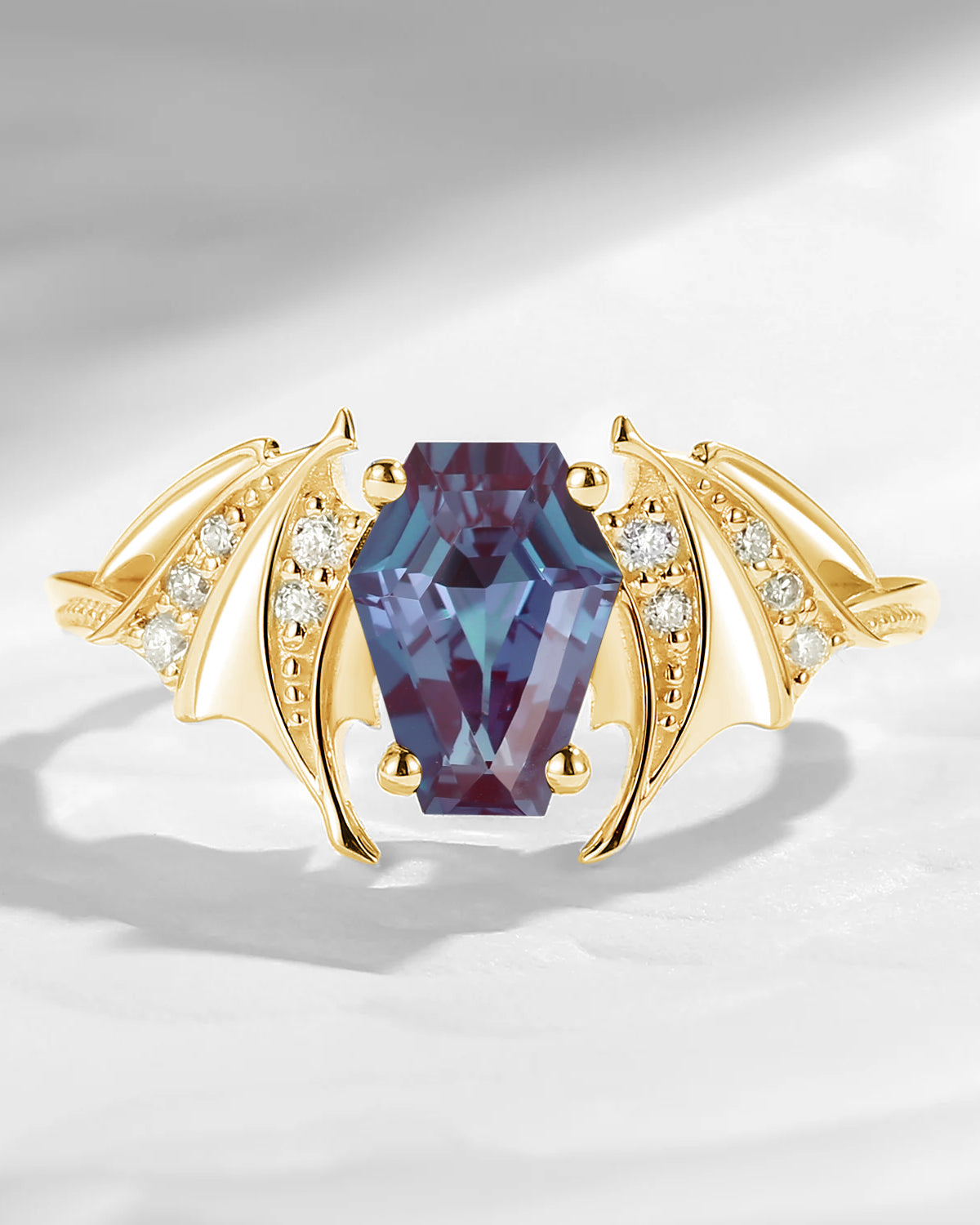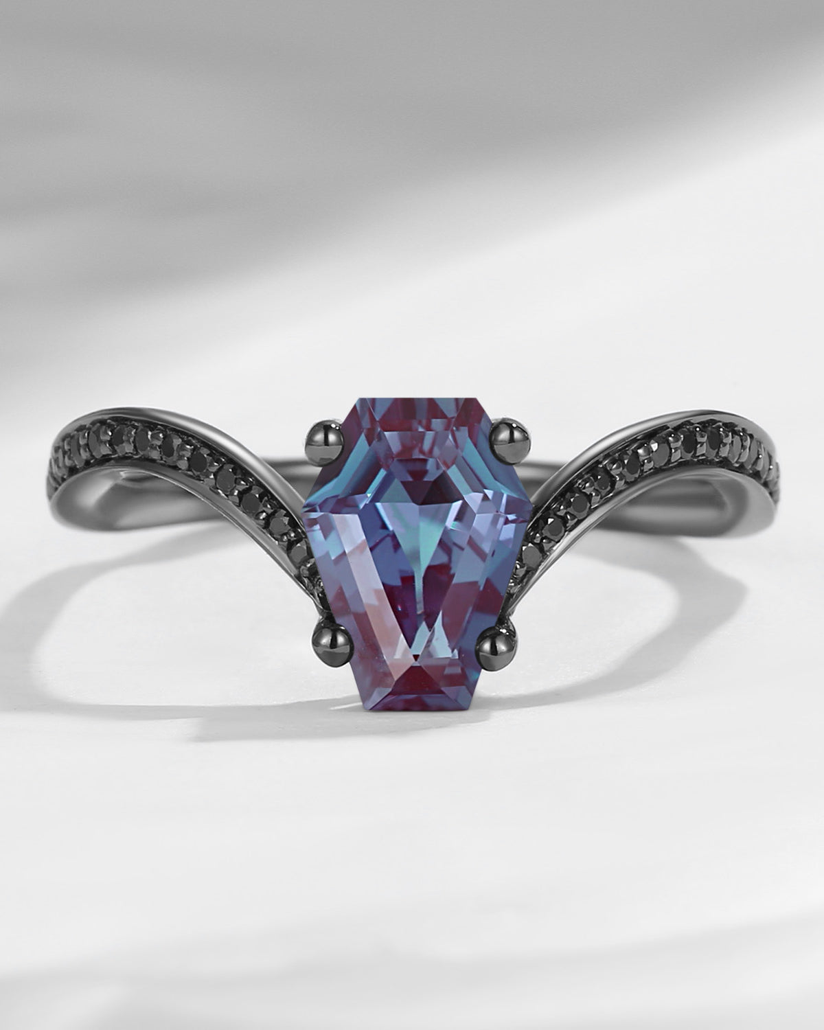 Coffin Cut Lab Alexandrite Gothic Inspired Black Gold Engagement Ring - Bat Ring