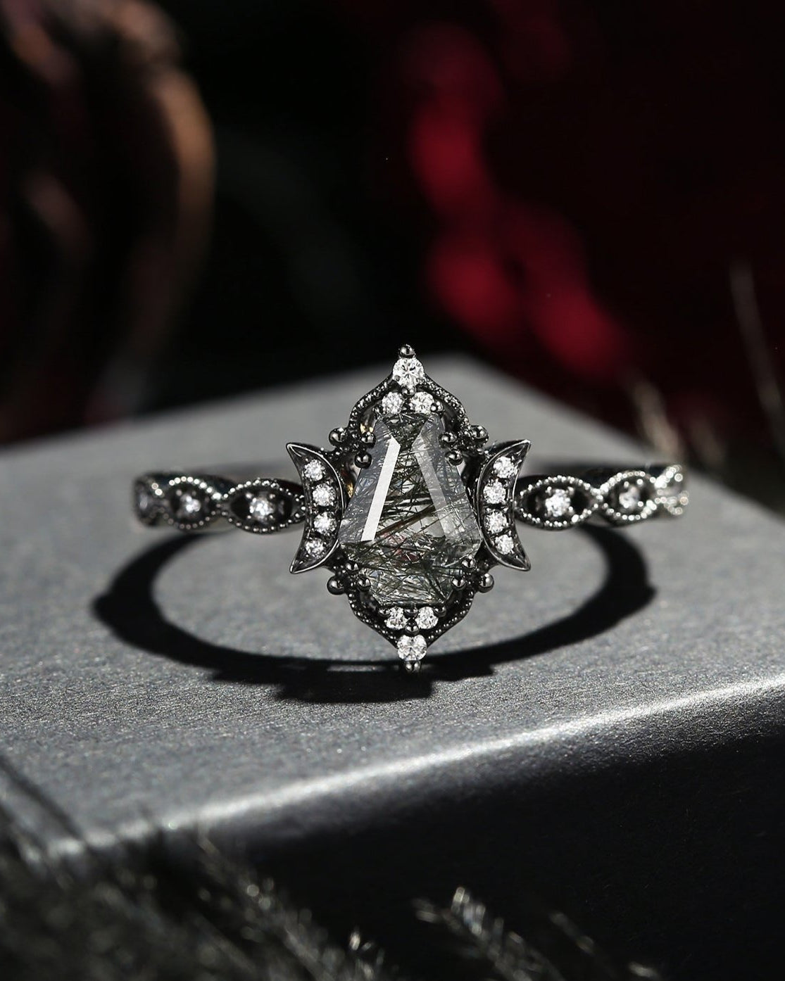 Crescent Moon | Vintage Style Coffin Cut Black Rutilated Quartz 'Evermore' Engagement Ring