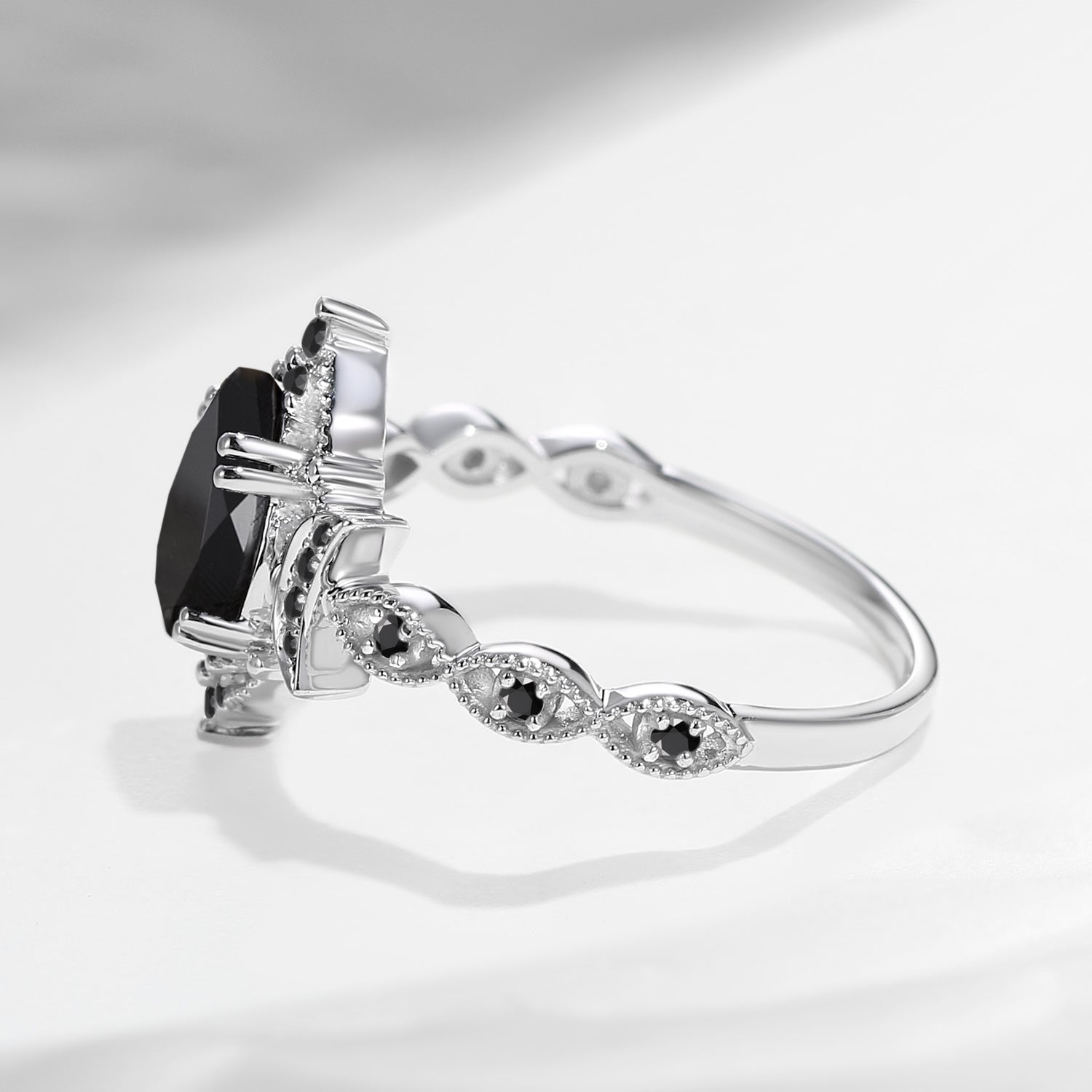 ⟢ Side Stone: Black Moissanite/Diamond, about 0.25ct