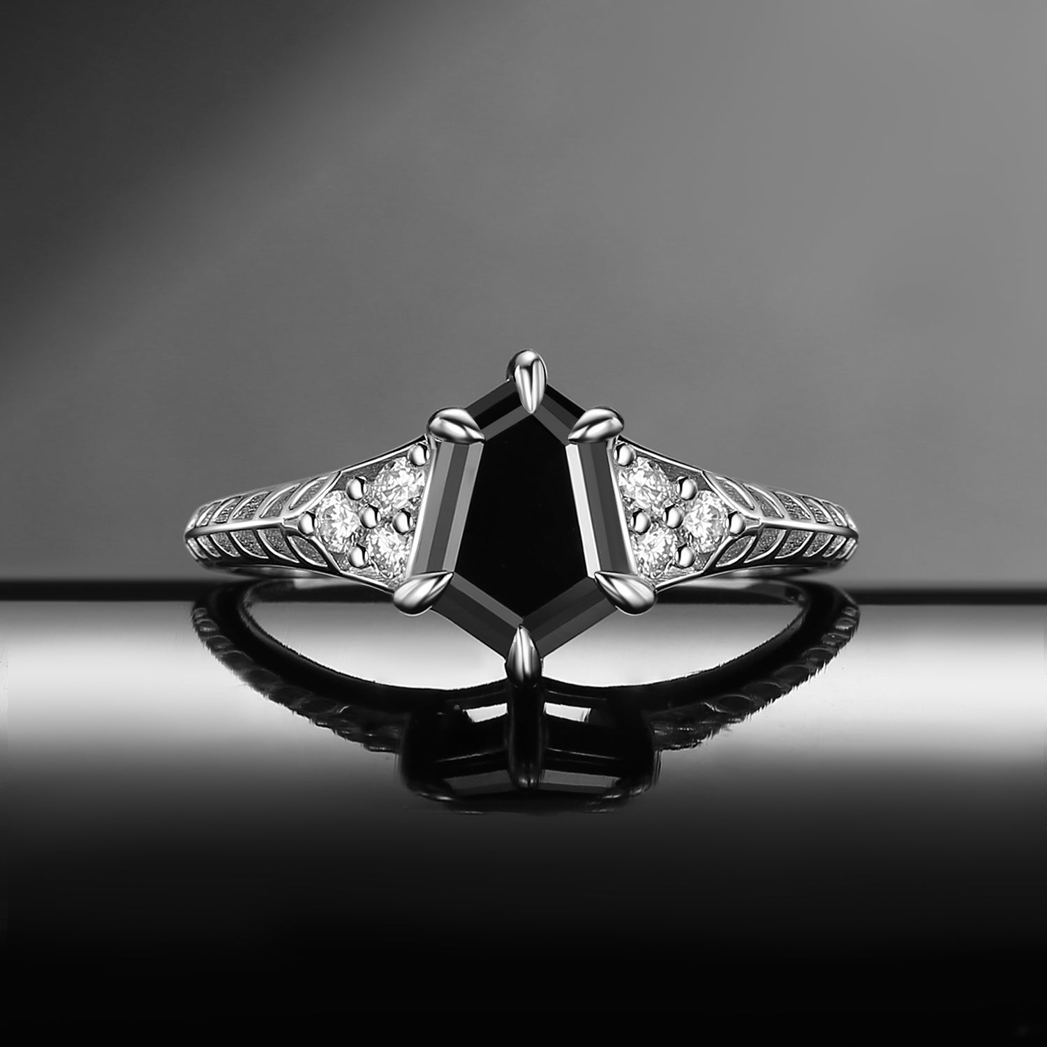 Gothic Inspired Hexagon Cut Black Rutilated Quartz 'Fallen Aegis' Shield Engagement Ring Set 3pcs