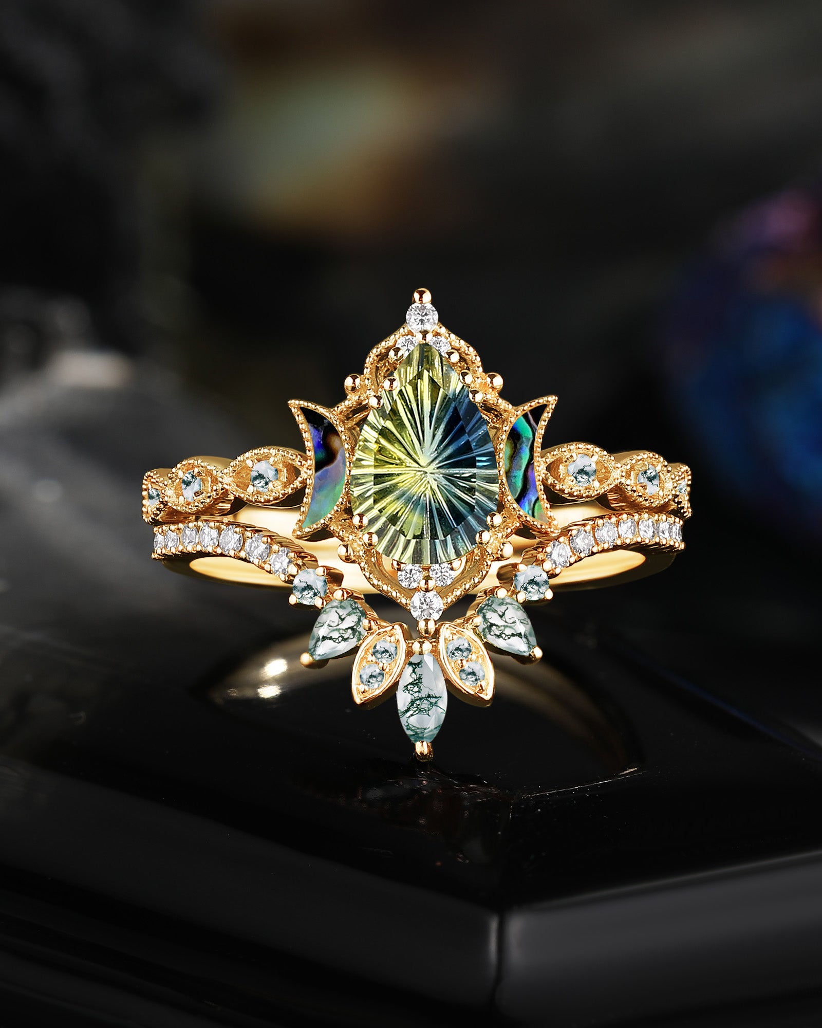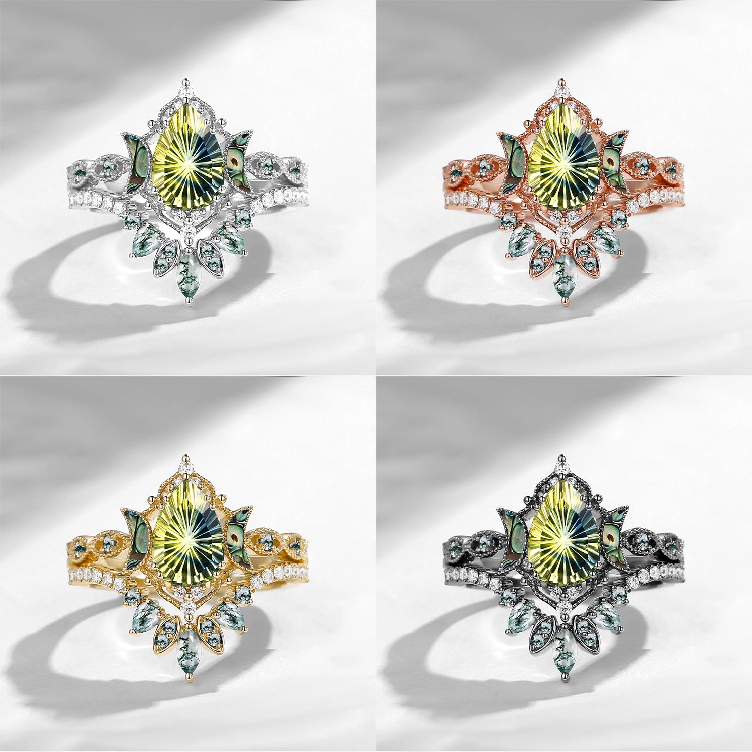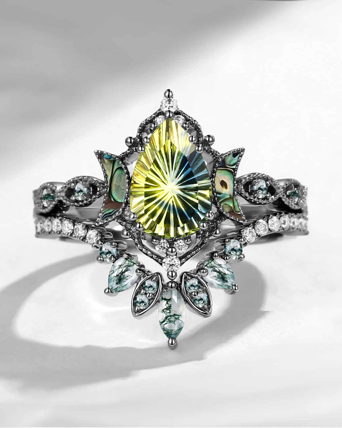 Firework Cut Natural Teal Sapphire Engagement Ring Set 2pcs - Ultra Galaxy