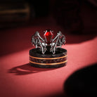 Bat Wing Inspired Coffin Garnet With Gold Strips Couple Bridal Ring Set