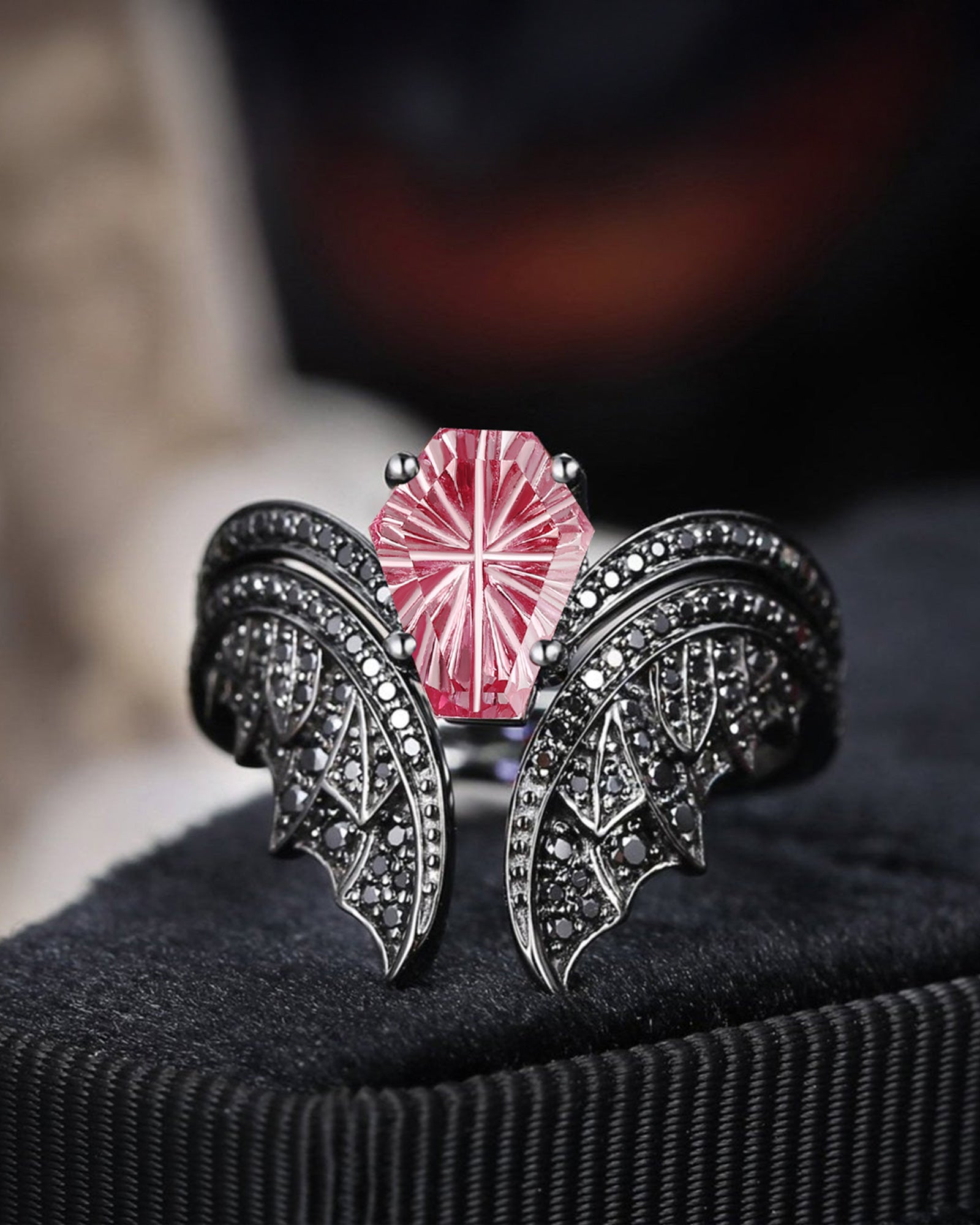 Firework Cut Natural Pink Tourmaline Coffin Black Gold Bridal Set 2pcs - Bat Ring