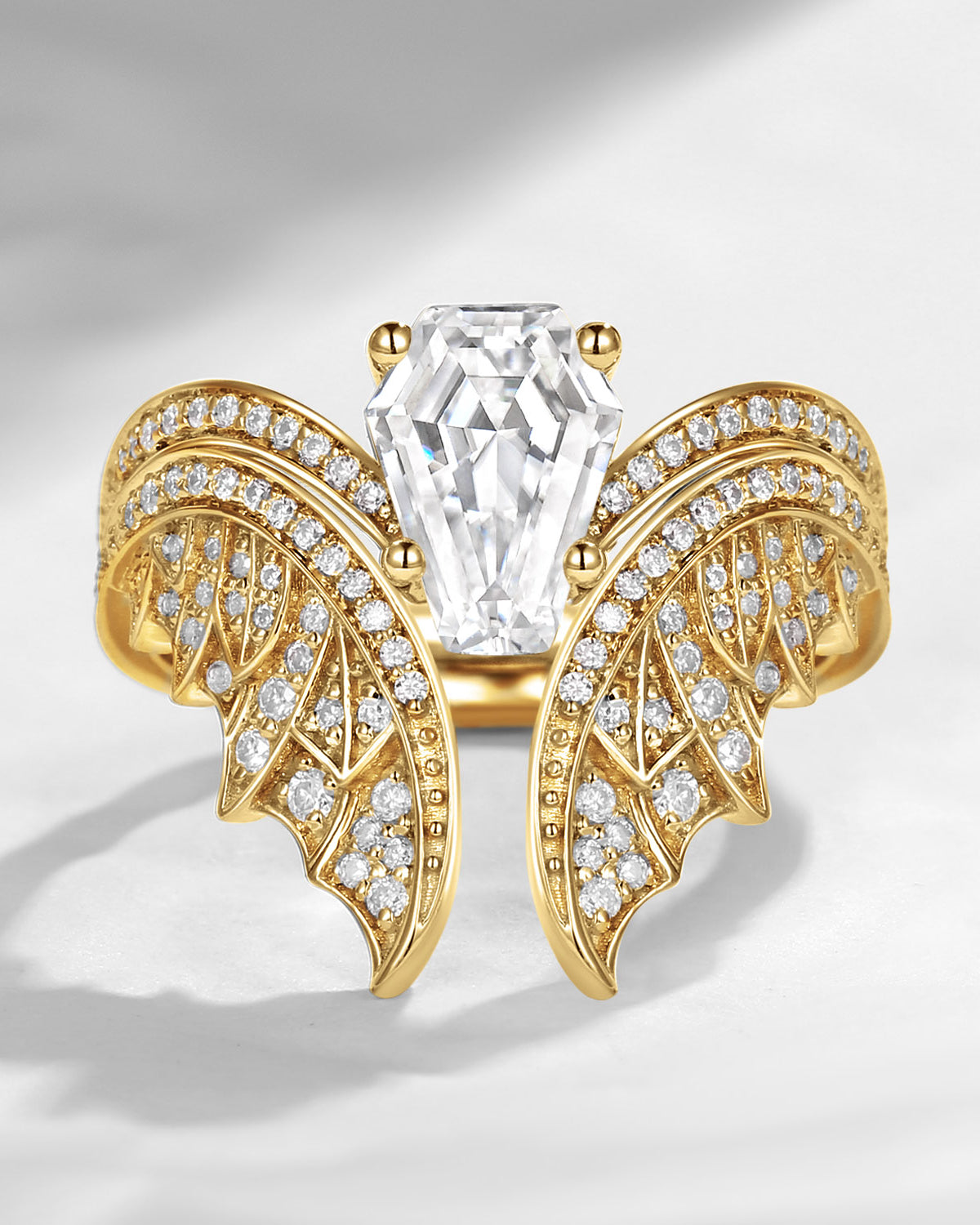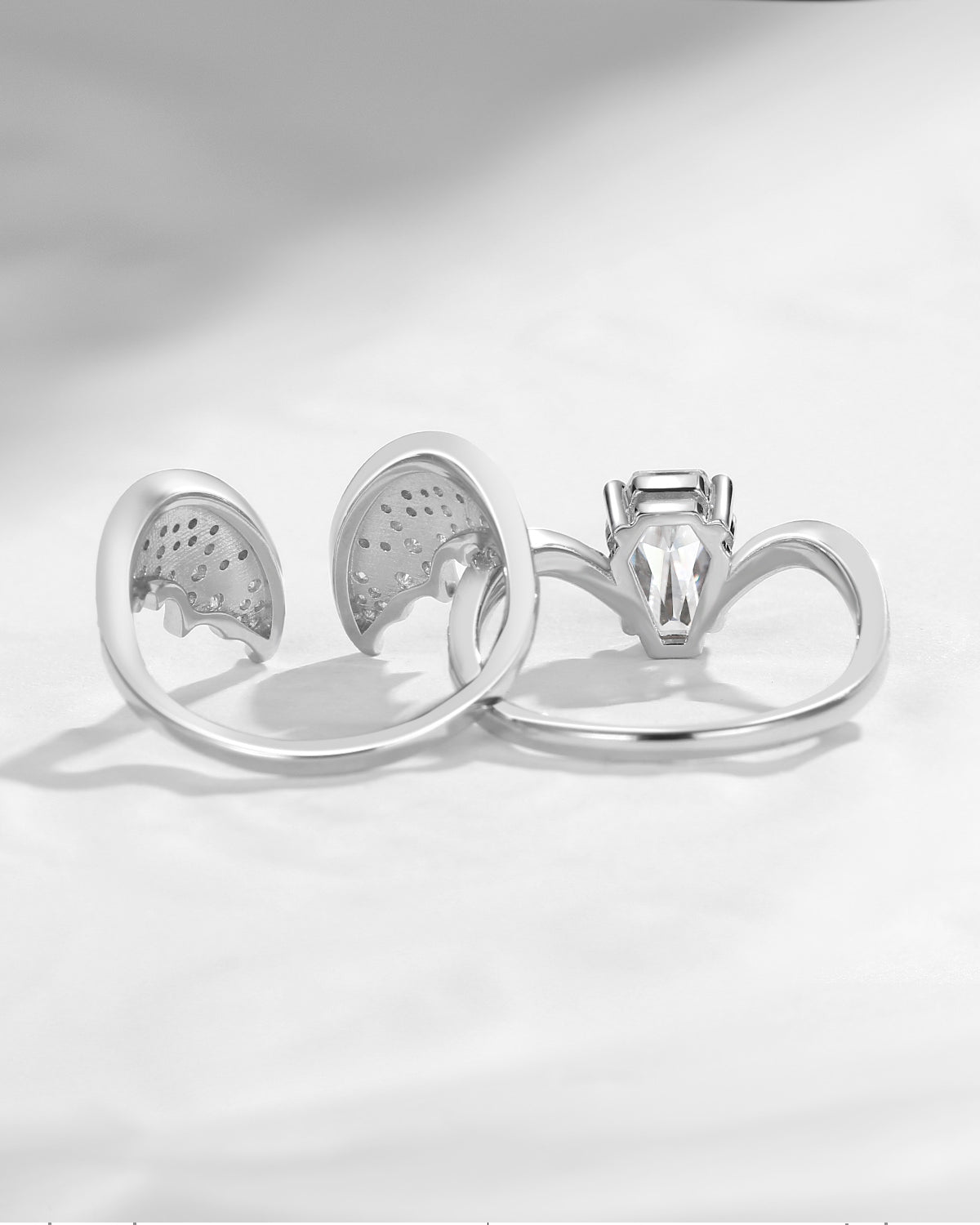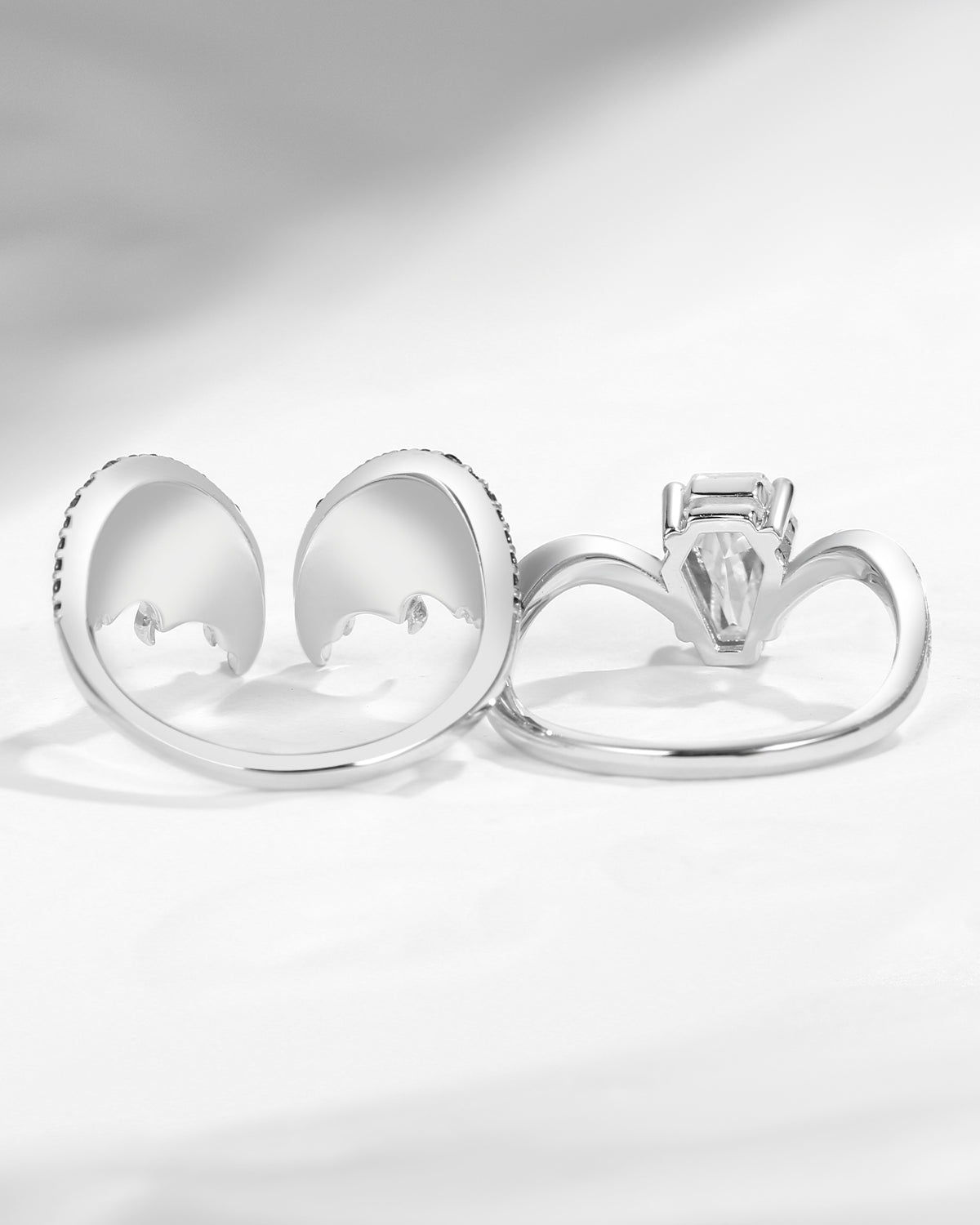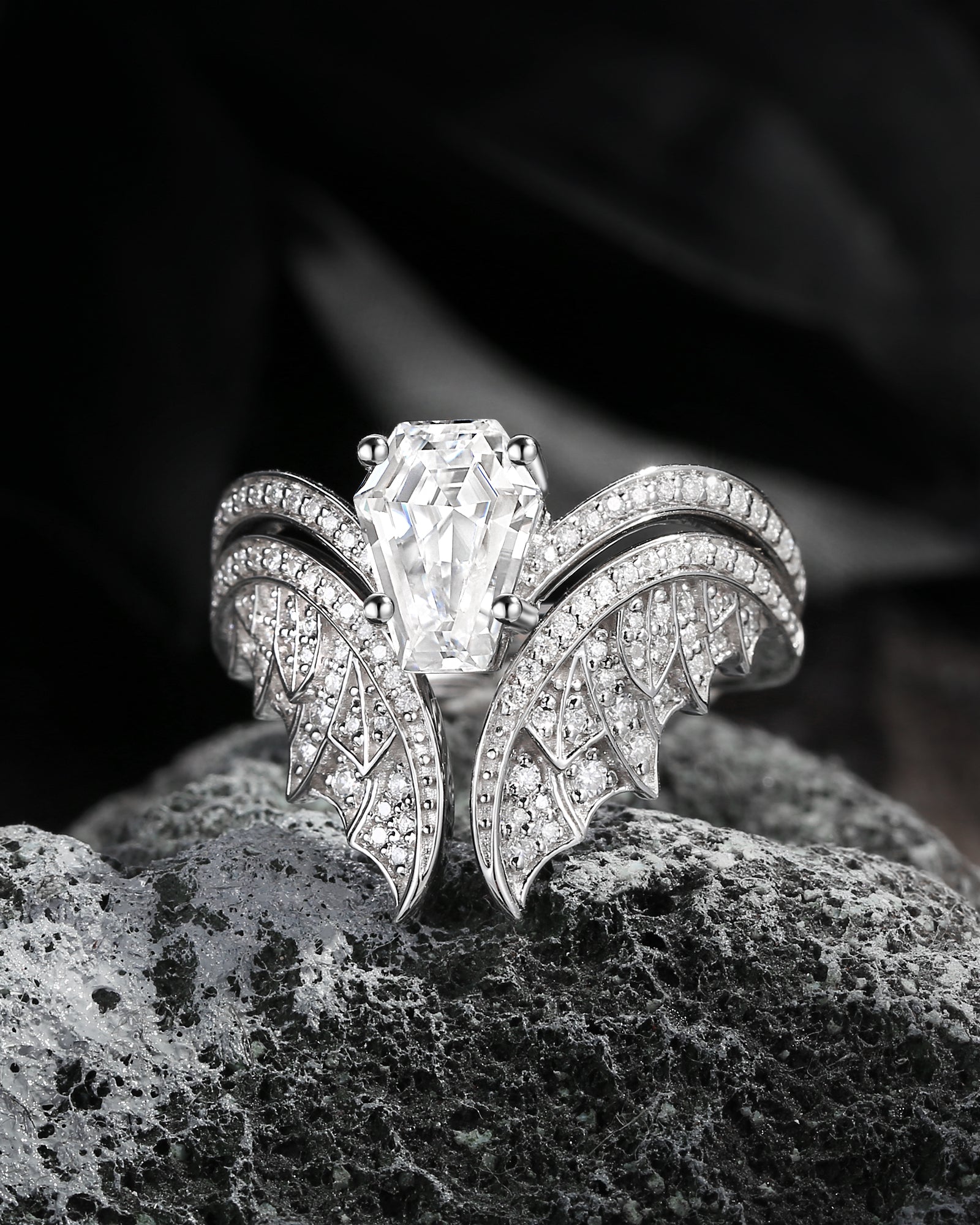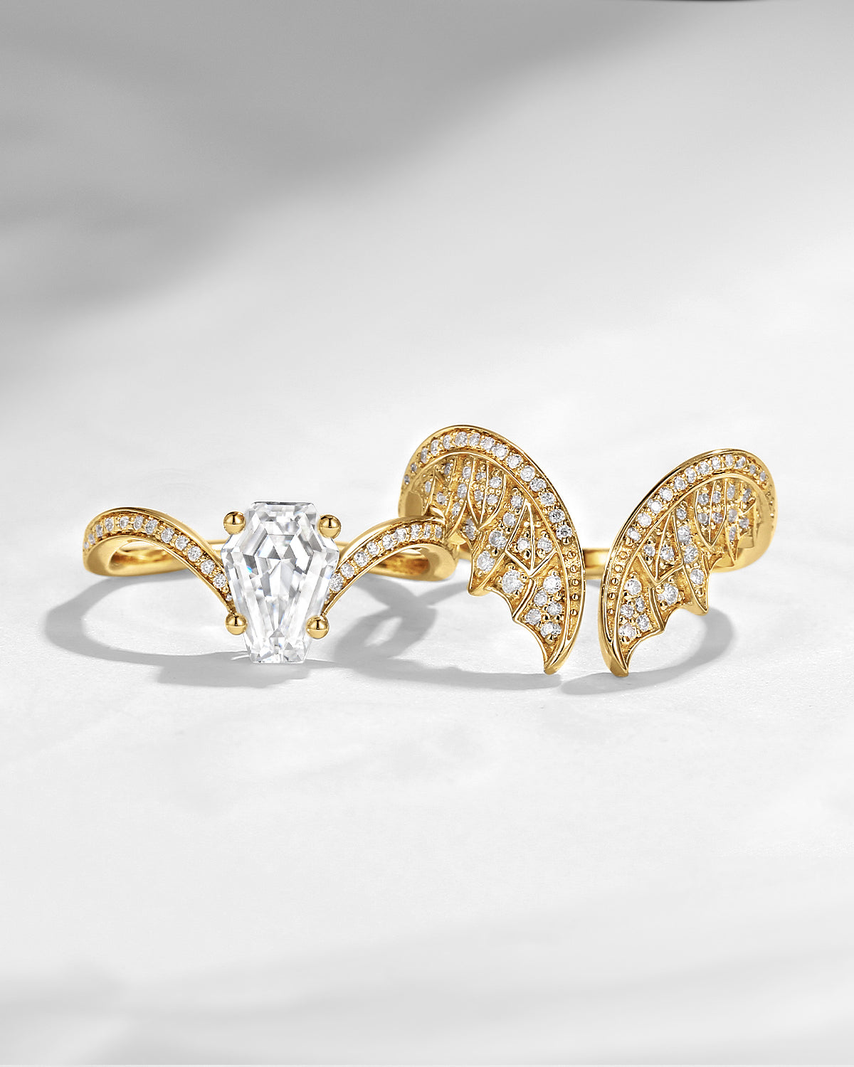 Unique Coffin Cut Moissanite Onyx Black Gold Bridal Set 2pcs - Bat Ring