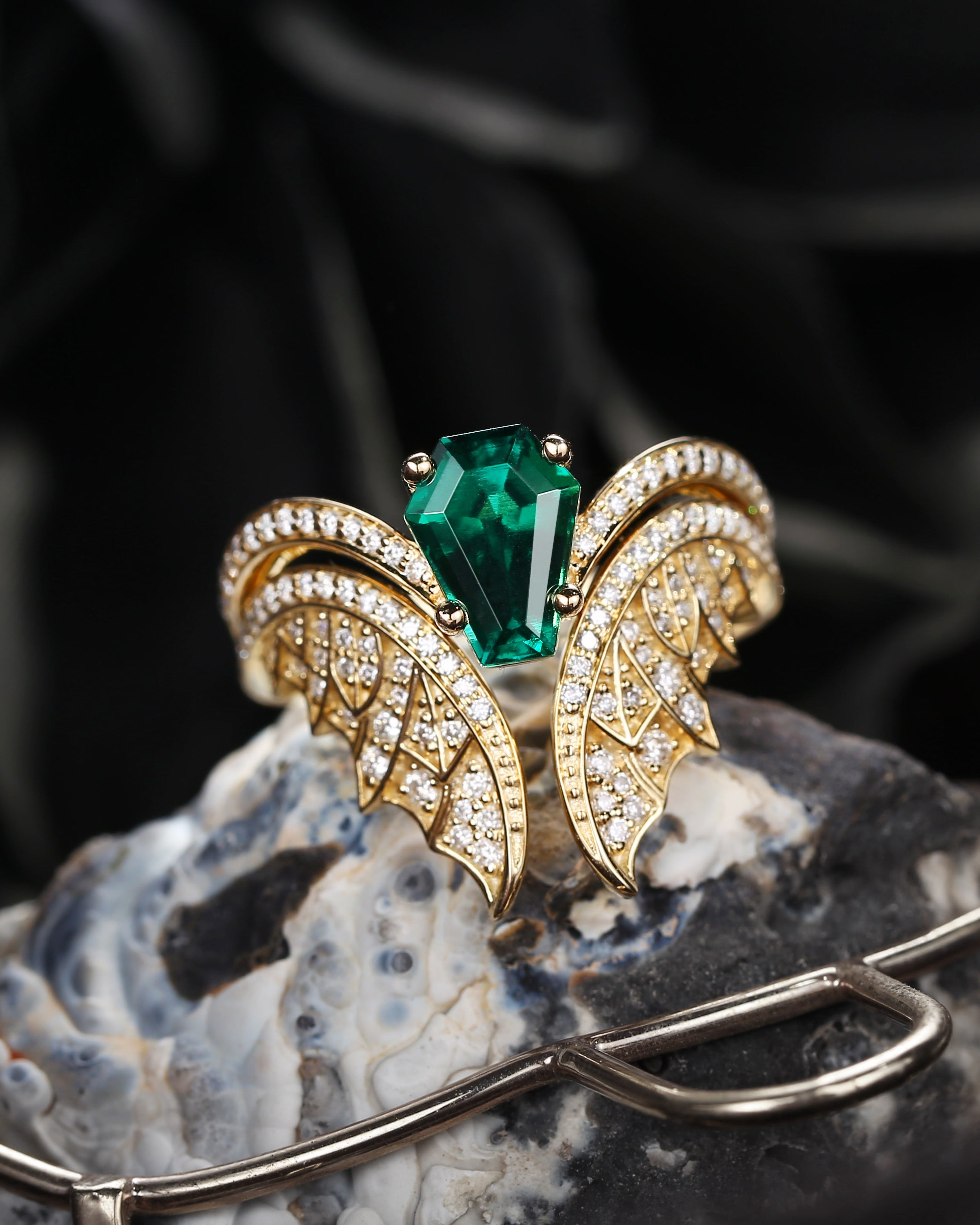 Coffin Cut Lab Emerald Vintage Yellow Gold Bridal Set 2pcs - Bat Ring