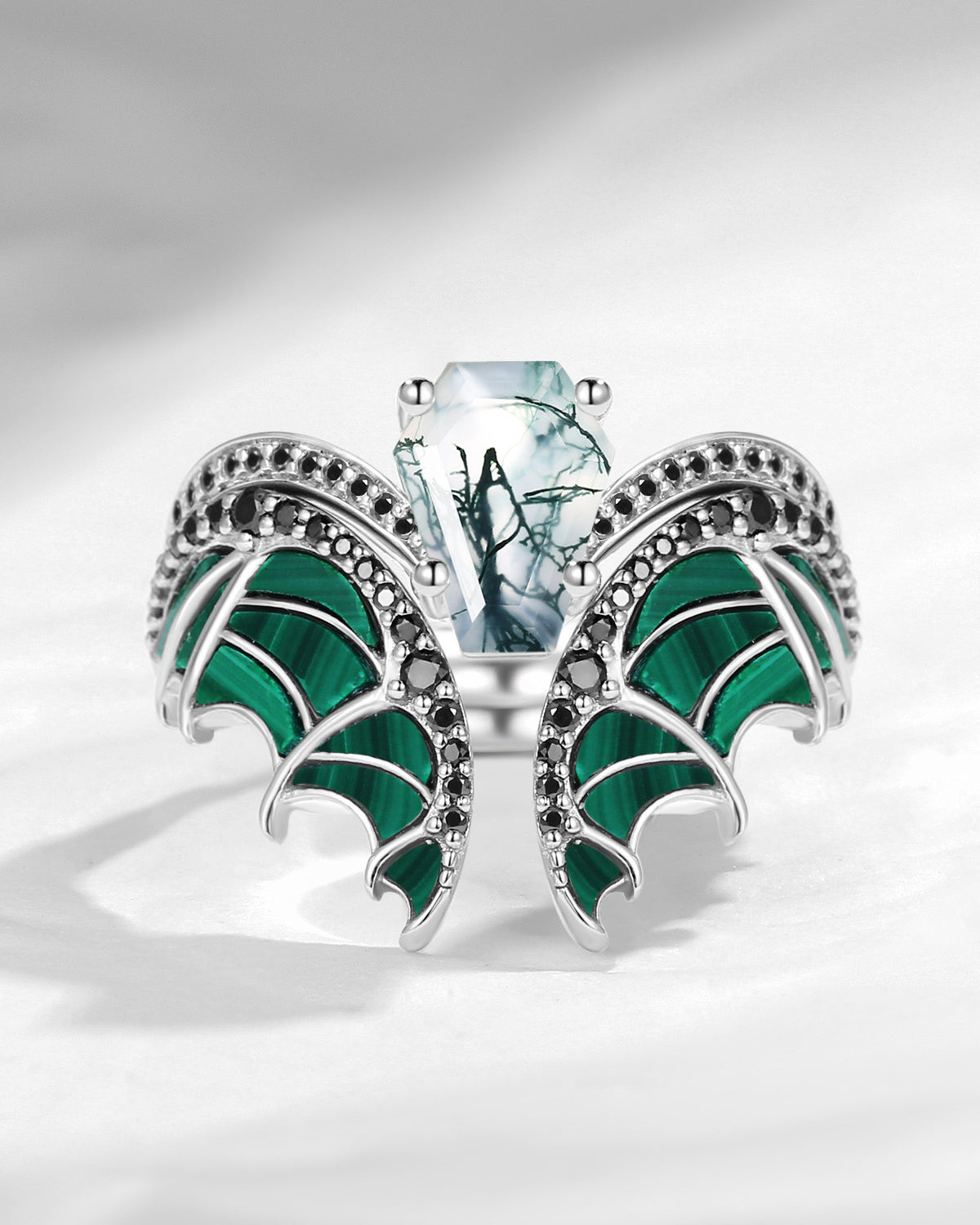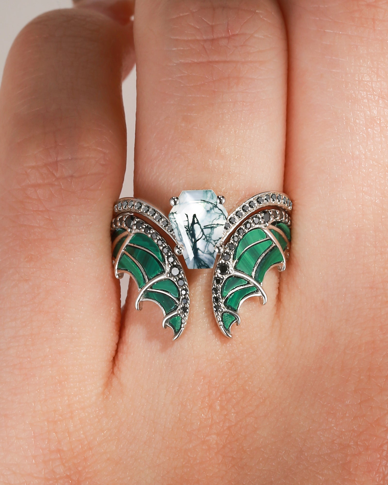 Unique Coffin Cut Moss Agate Malachite Bridal Set 2pcs - Bat Ring