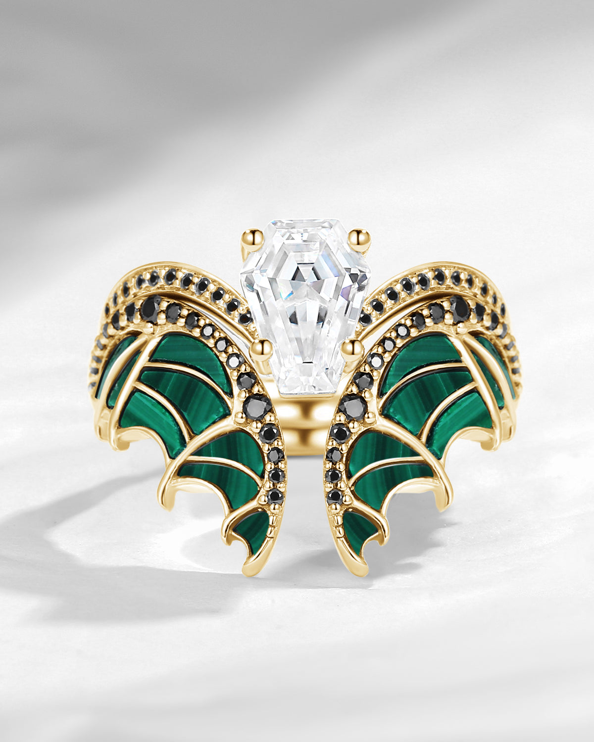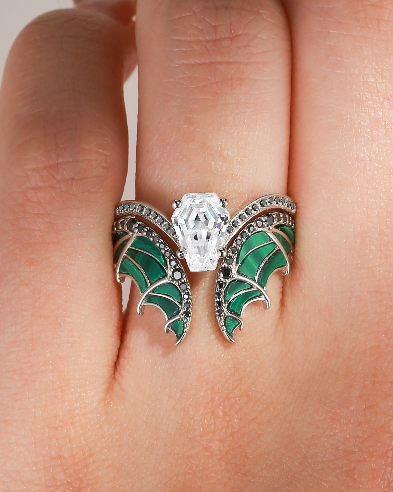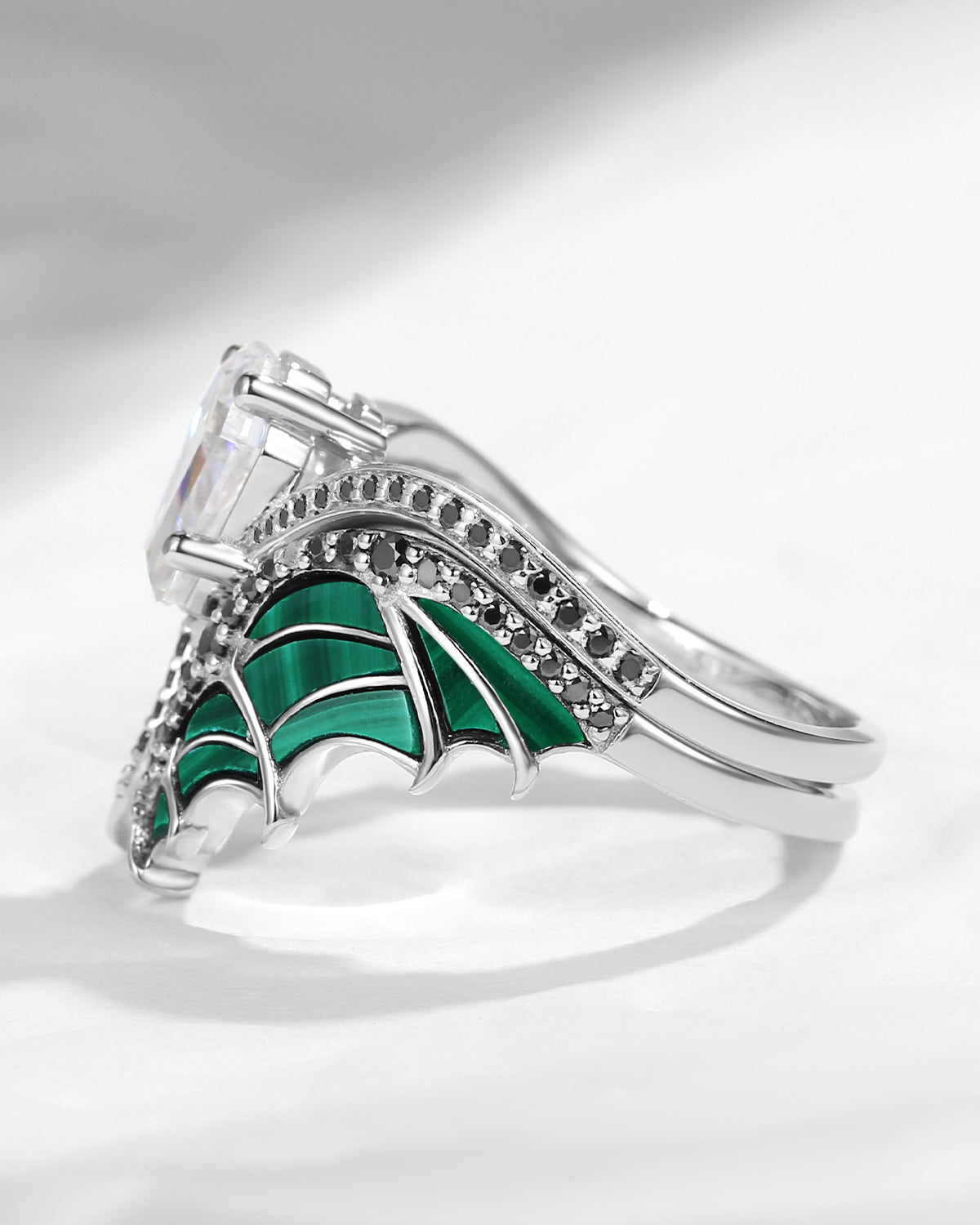 Unique Coffin Cut Moissanite Malachite Bridal Set 2pcs - Bat Ring