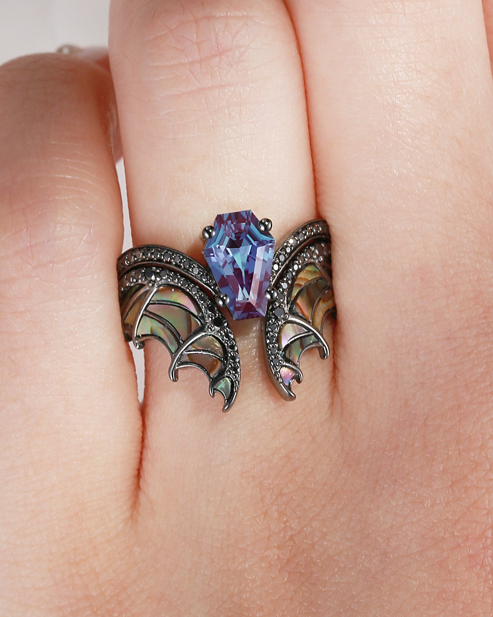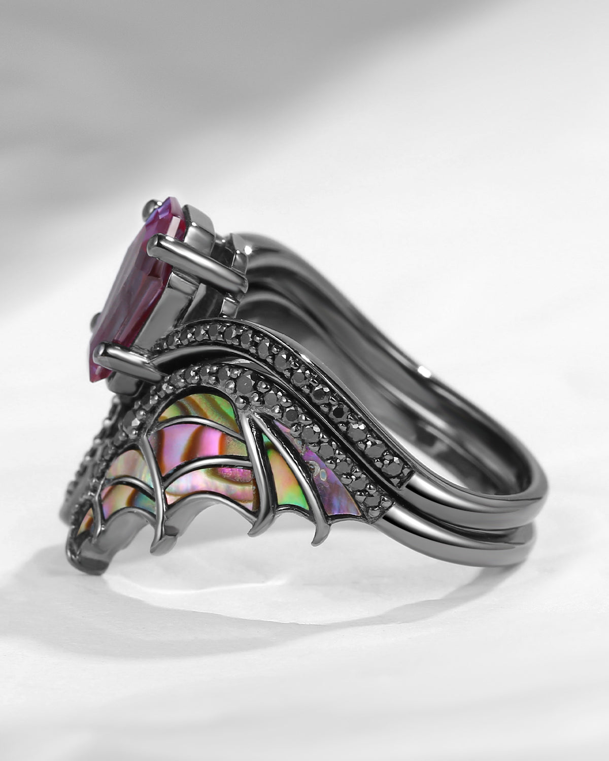 Unique Coffin Cut Lab Alexandrite Abalone Shell Black Gold Bridal Set 2pcs - Bat Ring