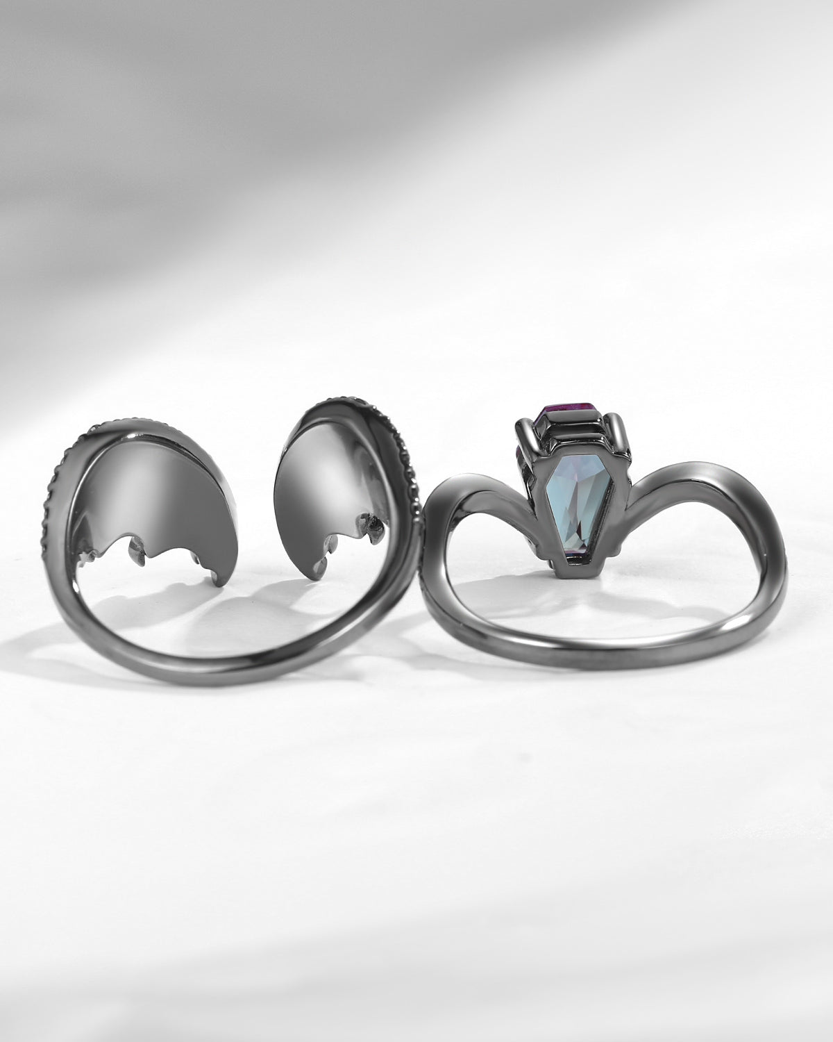 Coffin Cut Lab Alexandrite Vintage Black Gold Bridal Set 2pcs - Bat Ring