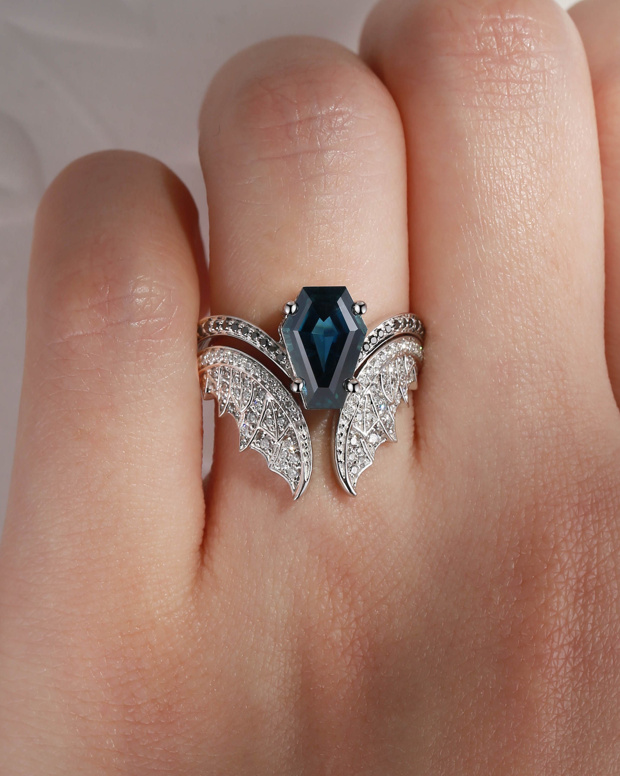 Coffin Cut Lab Teal Sapphire Vintage White Gold Bridal Set 2pcs - Bat Ring