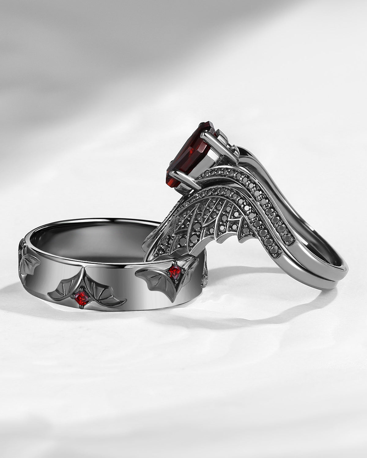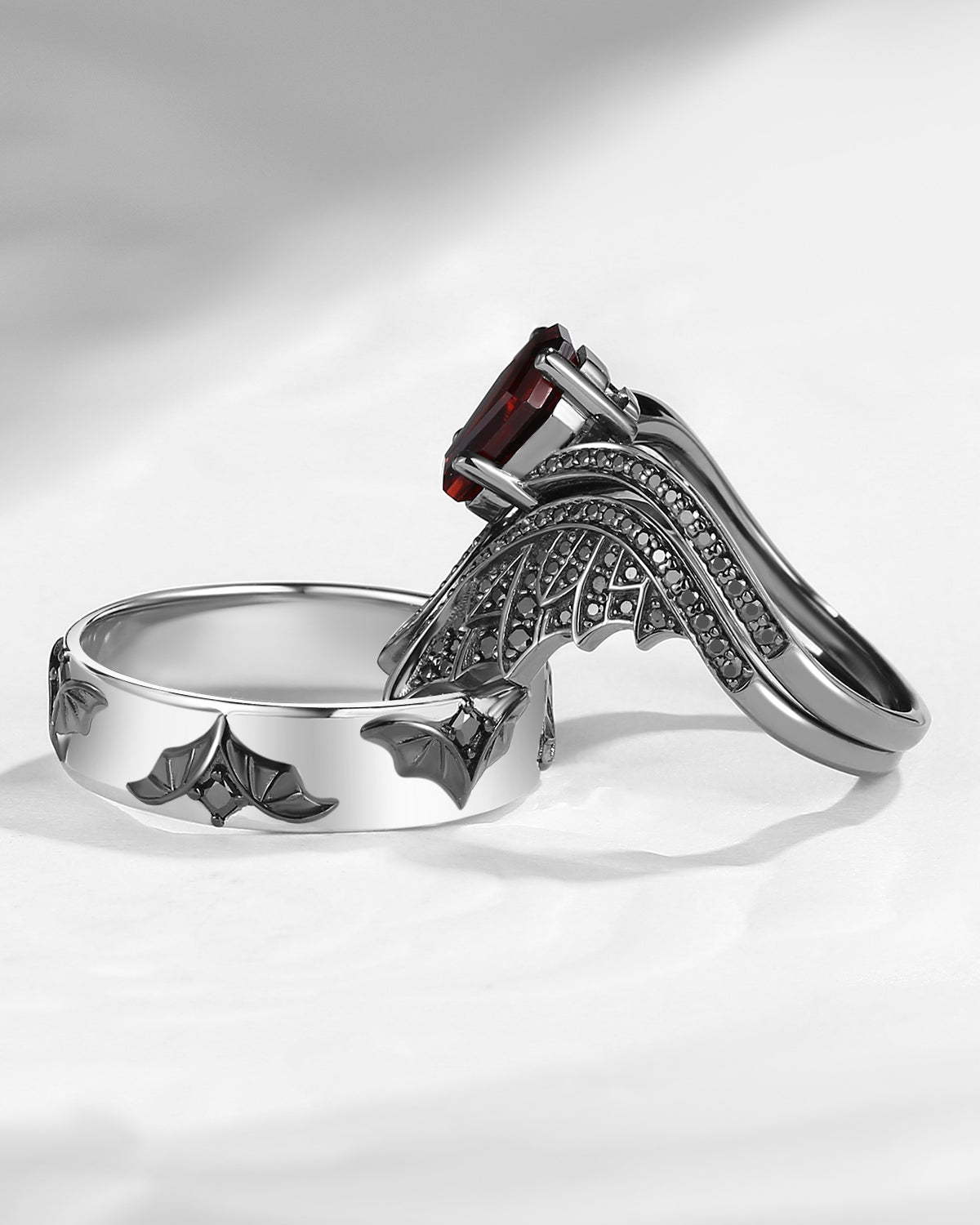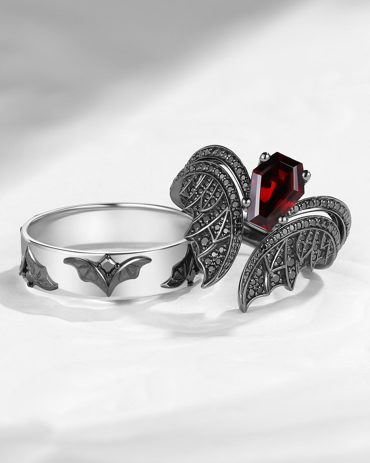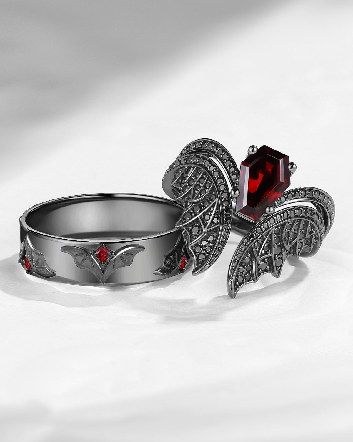 Gothic Coffin Garnet Bat Wing Inspired Couple Bridal Ring Set