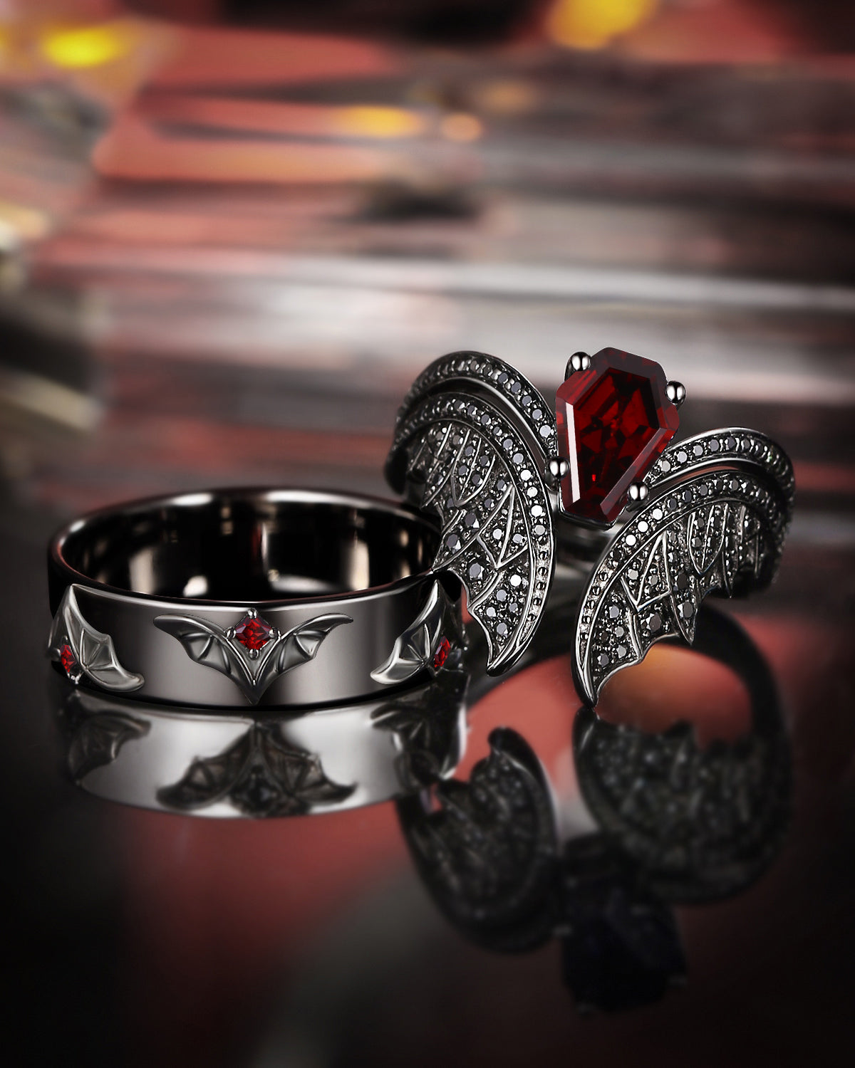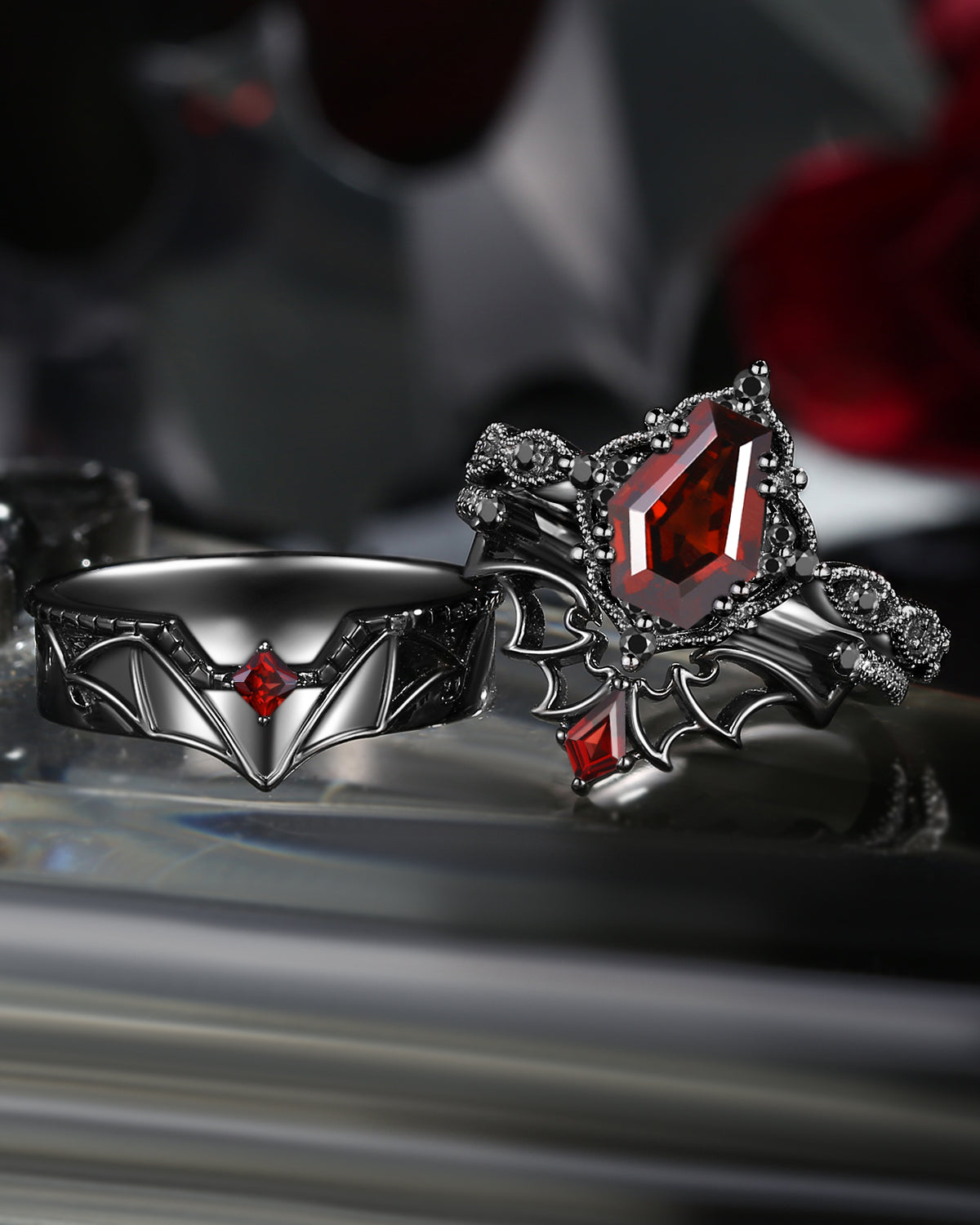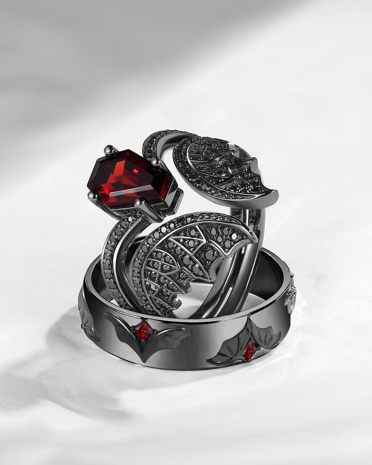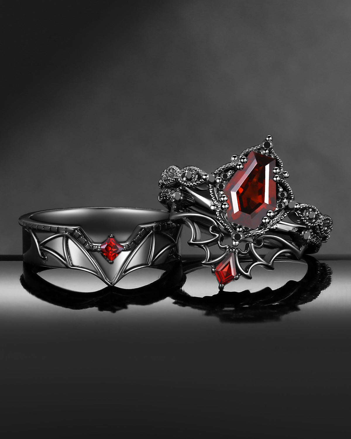 Gothic Coffin Garnet Bat Wing Inspired Couple Bridal Ring Set