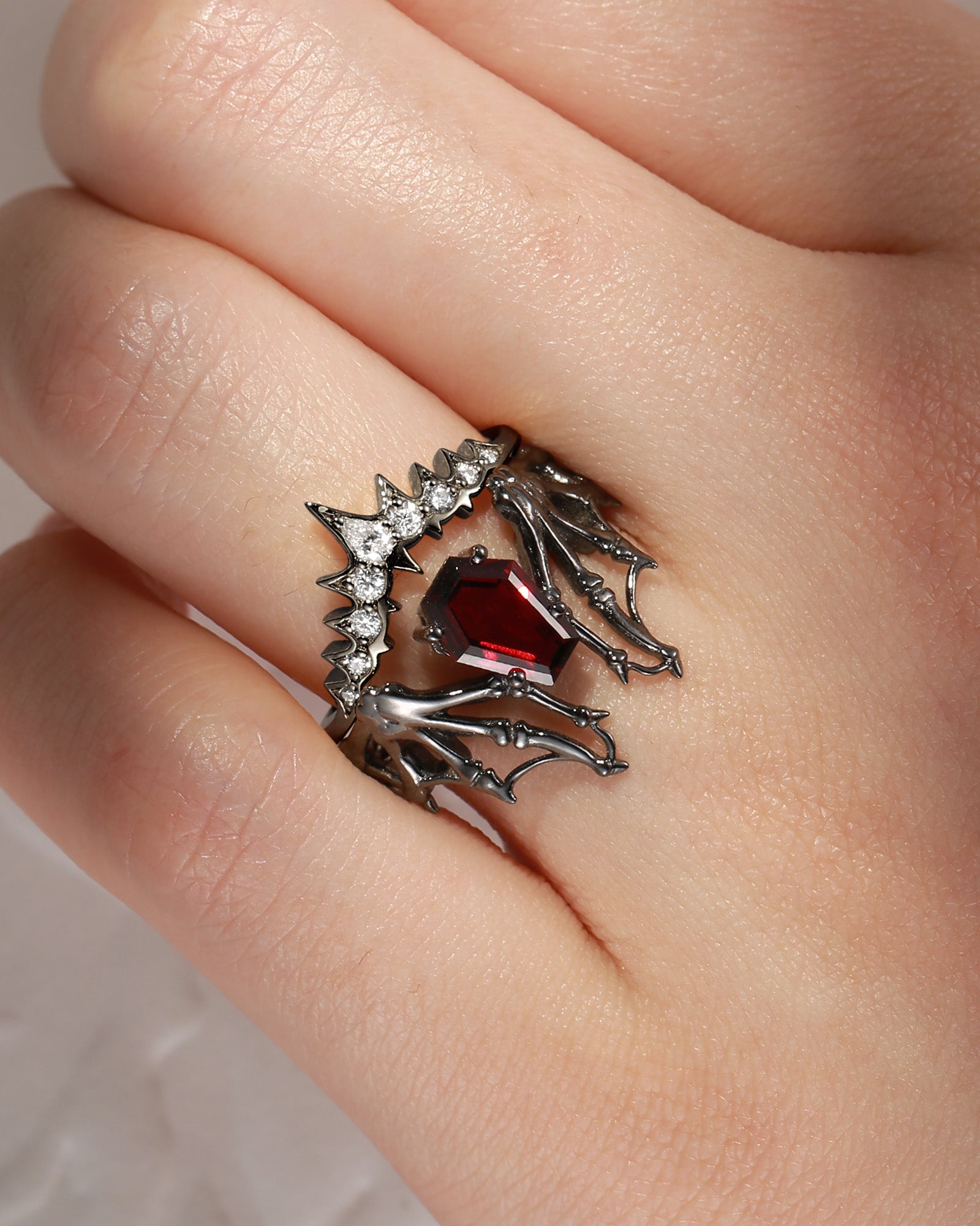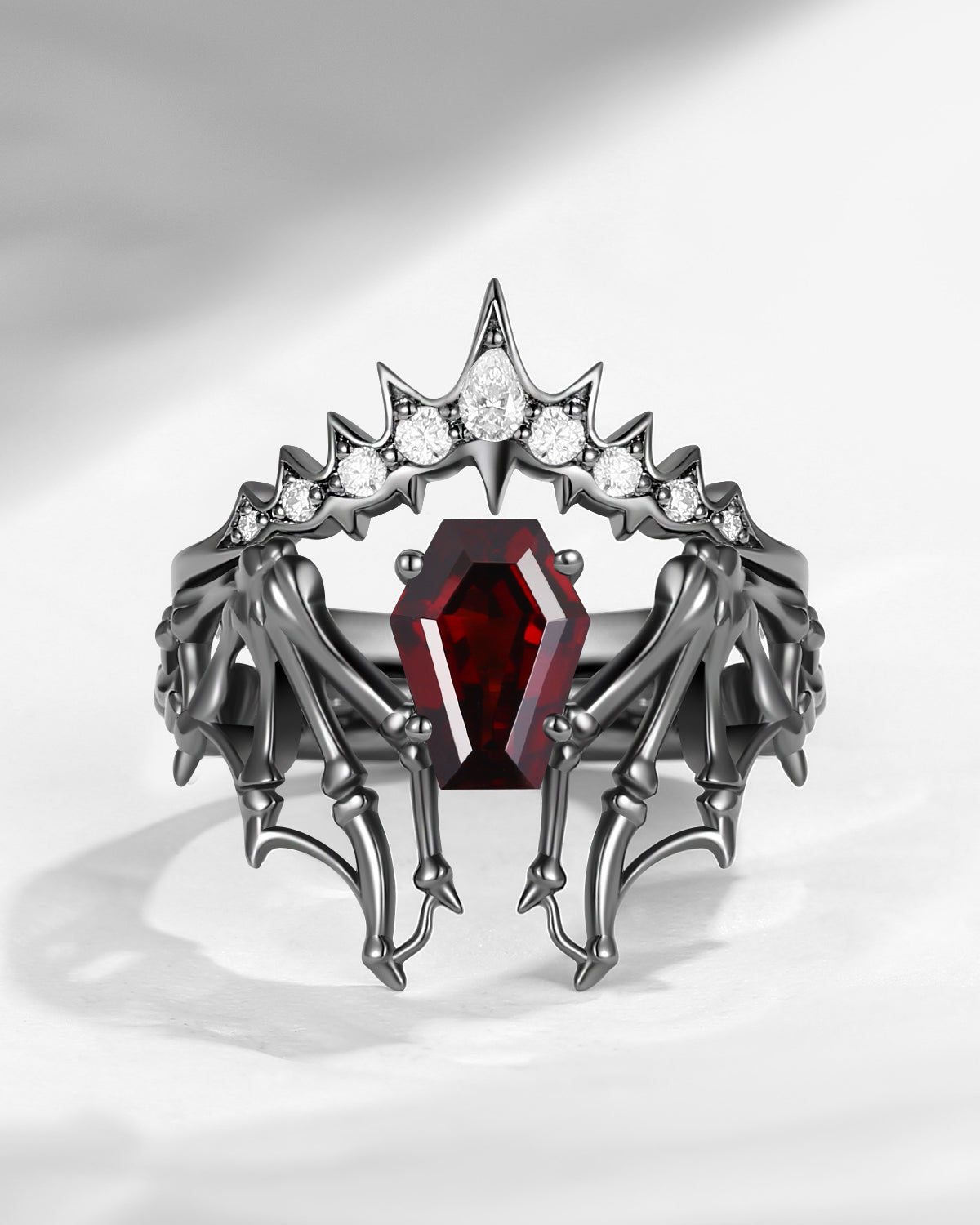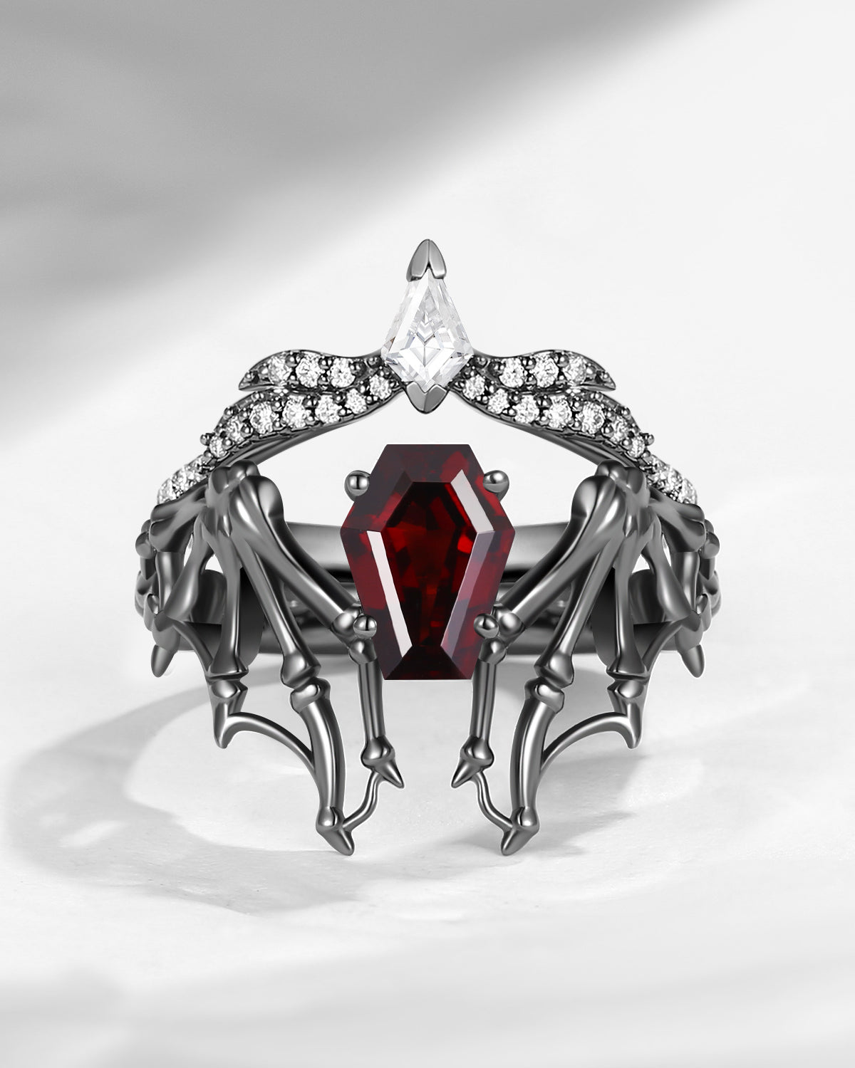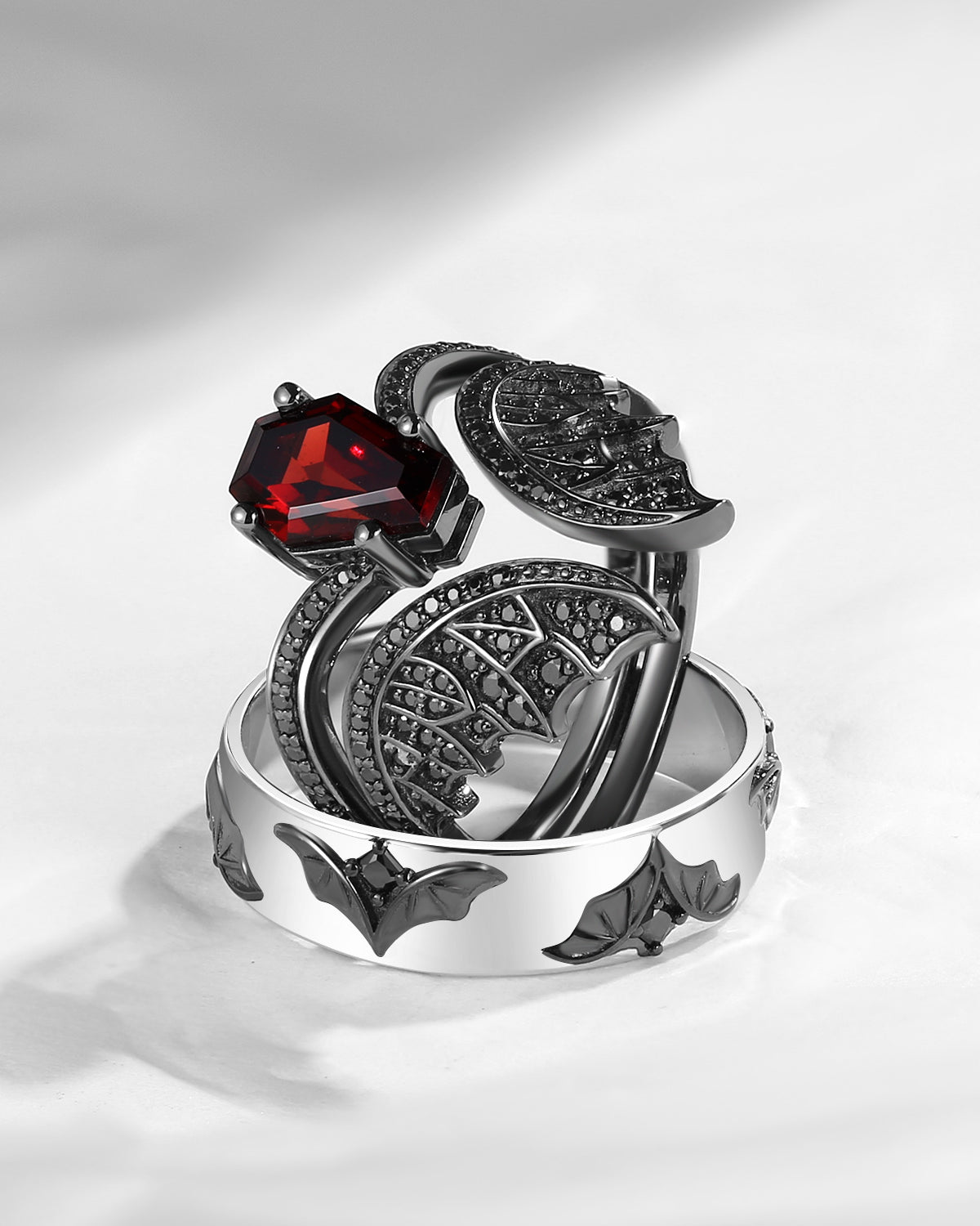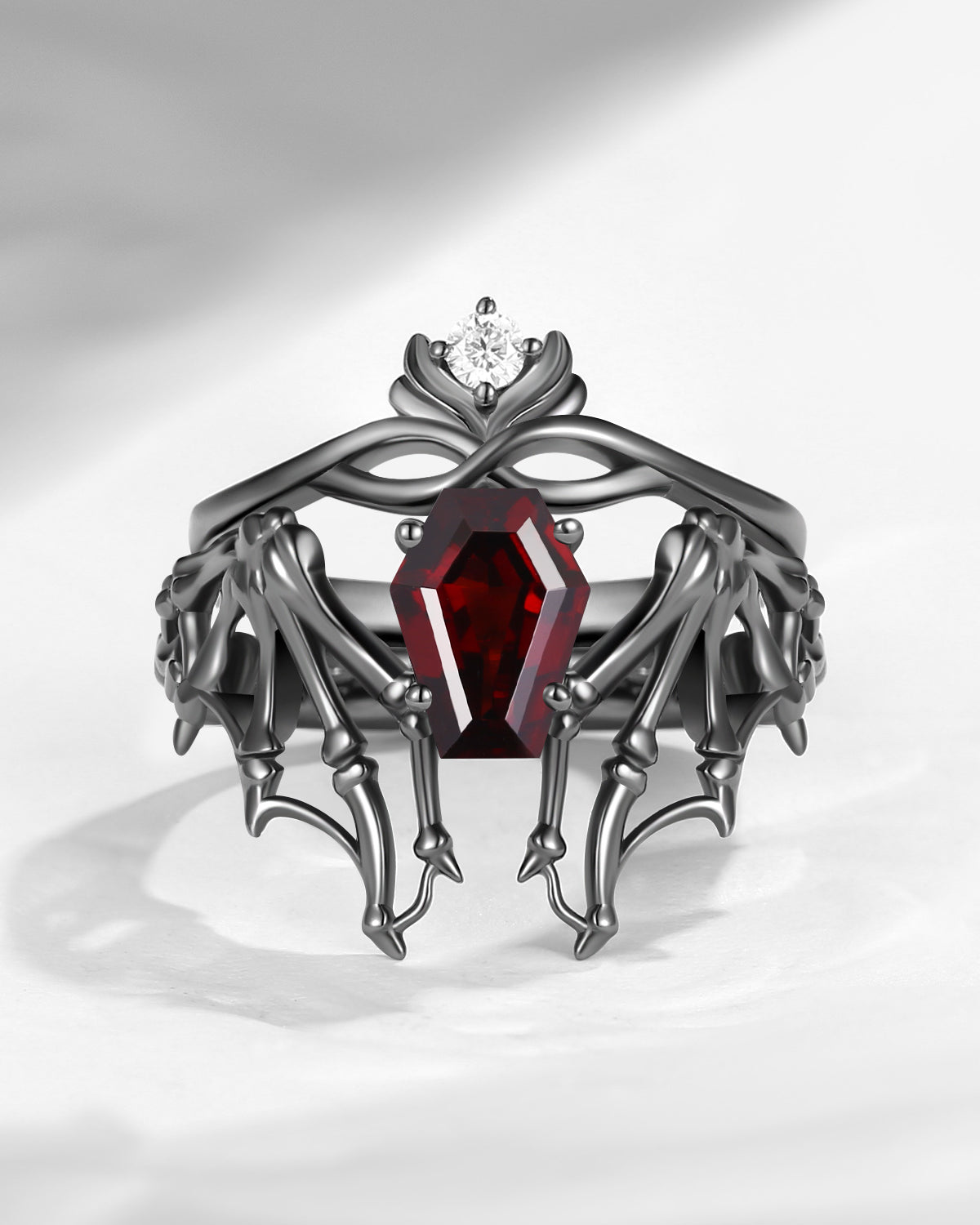 Gothic Coffin Garnet Bat Wing Inspired Couple Bridal Ring Set
