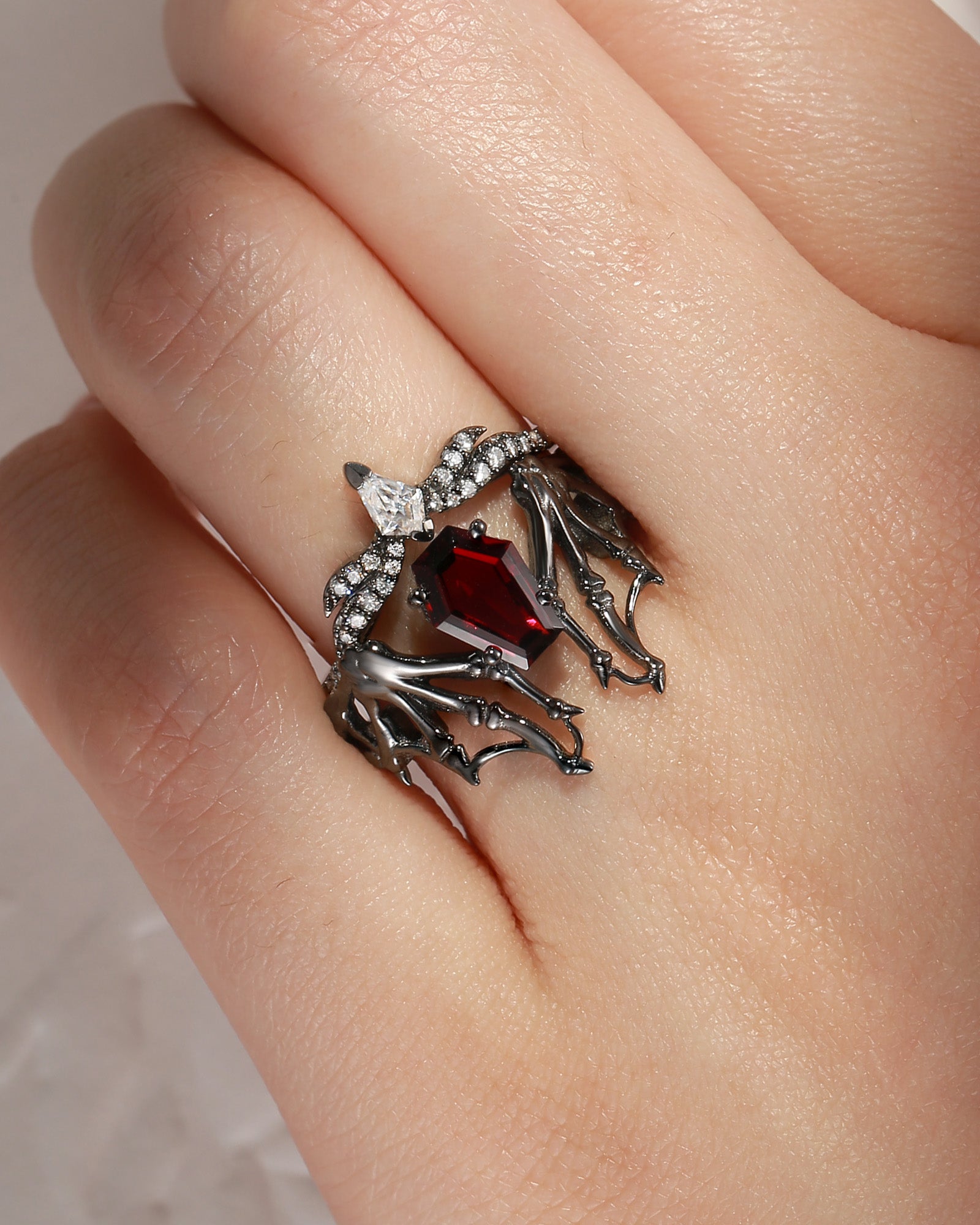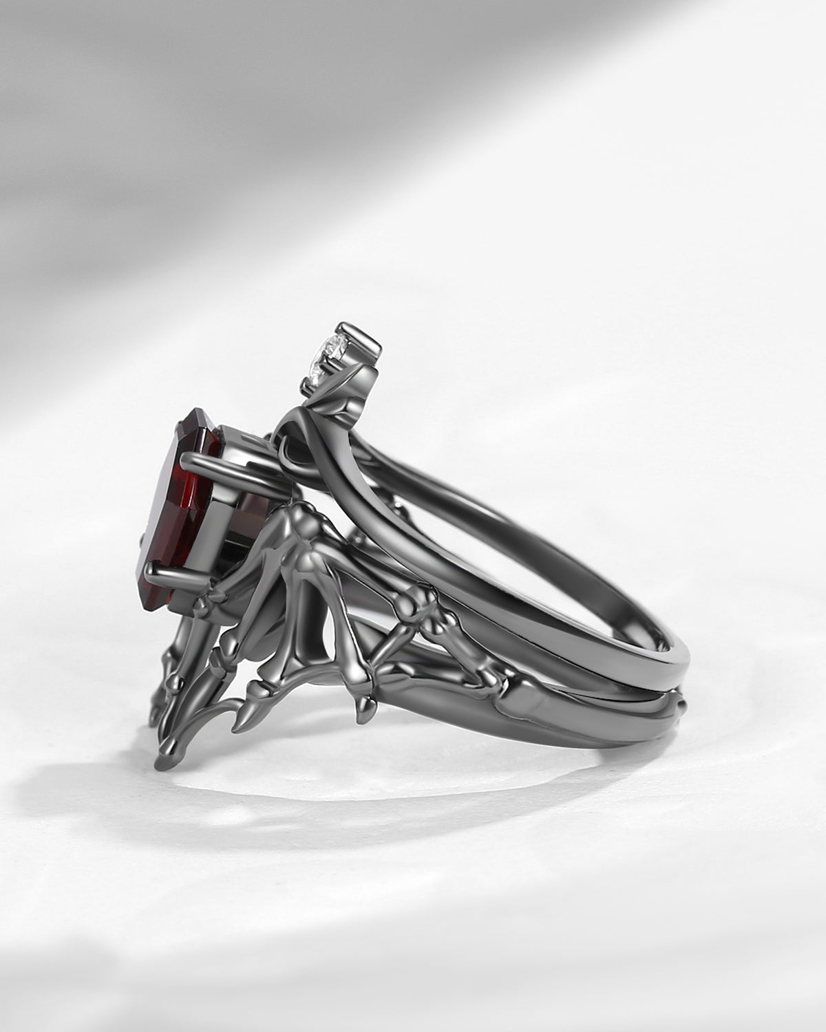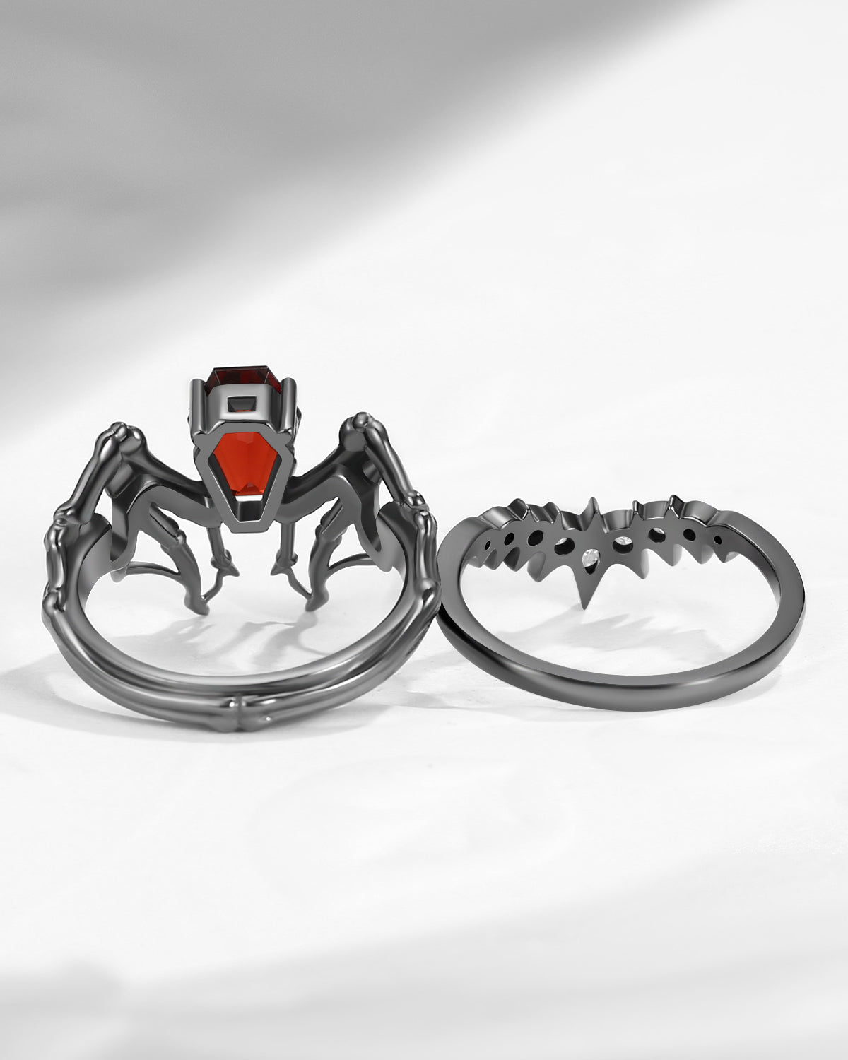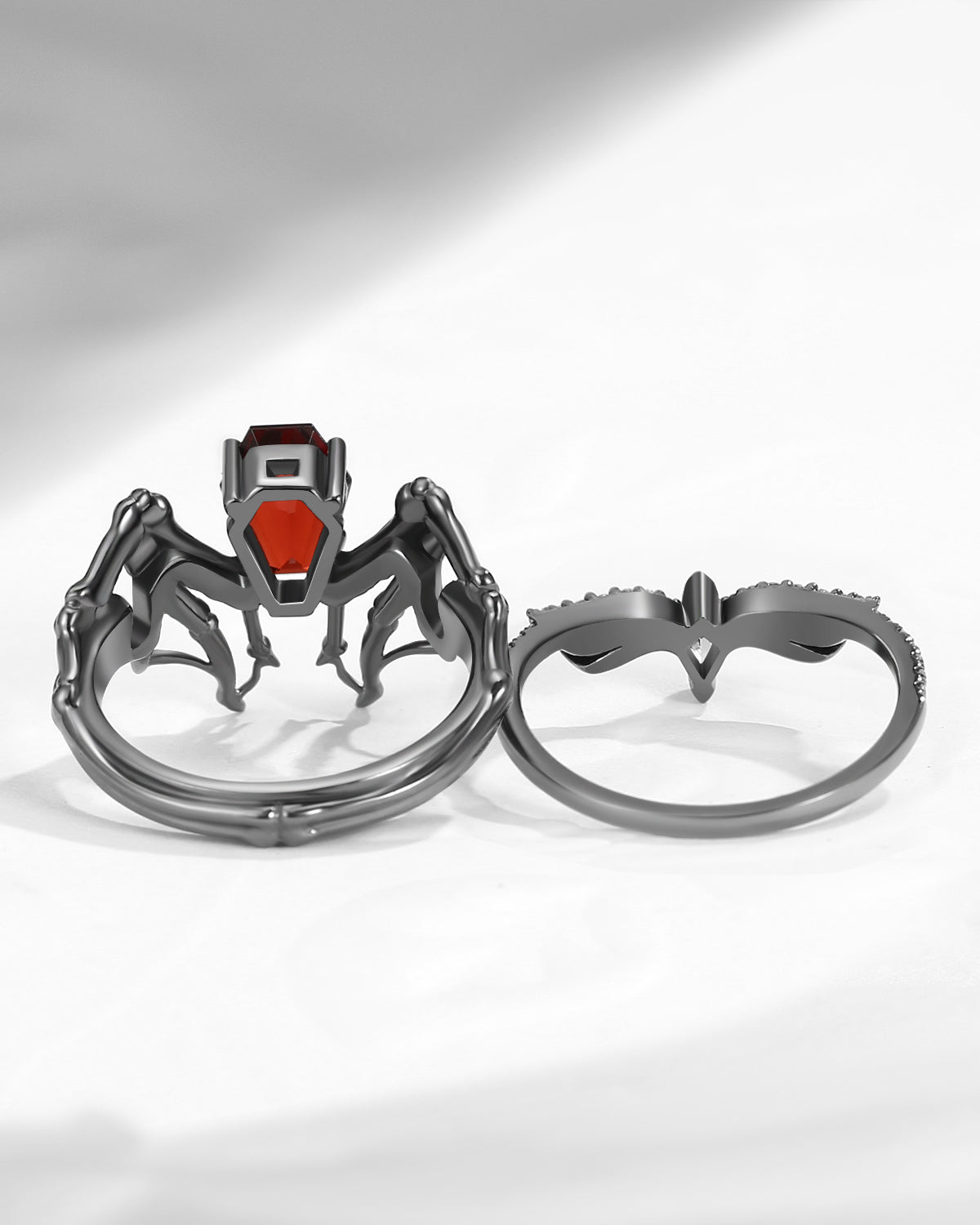 Gothic Coffin Garnet Bat Wing Inspired Couple Bridal Ring Set