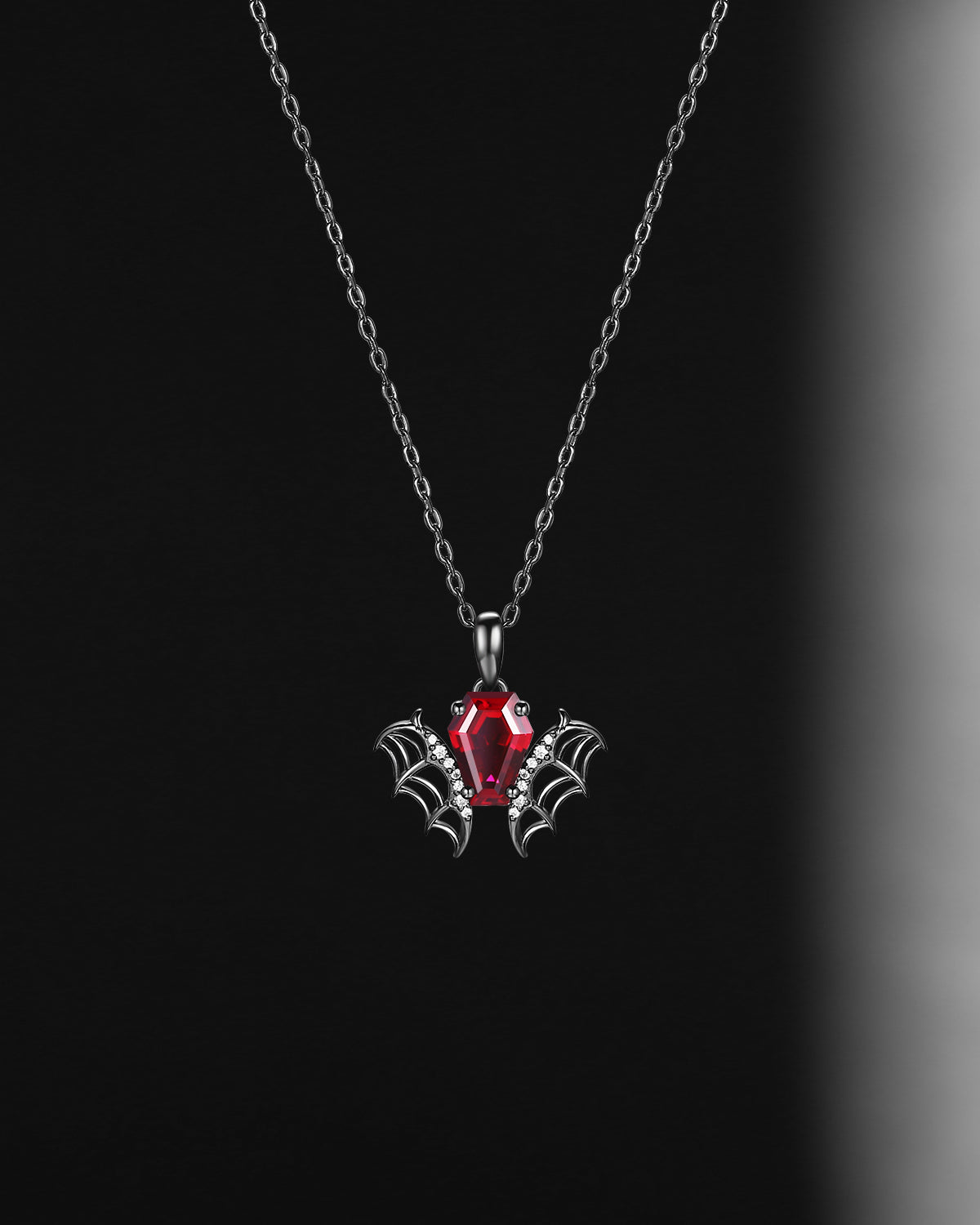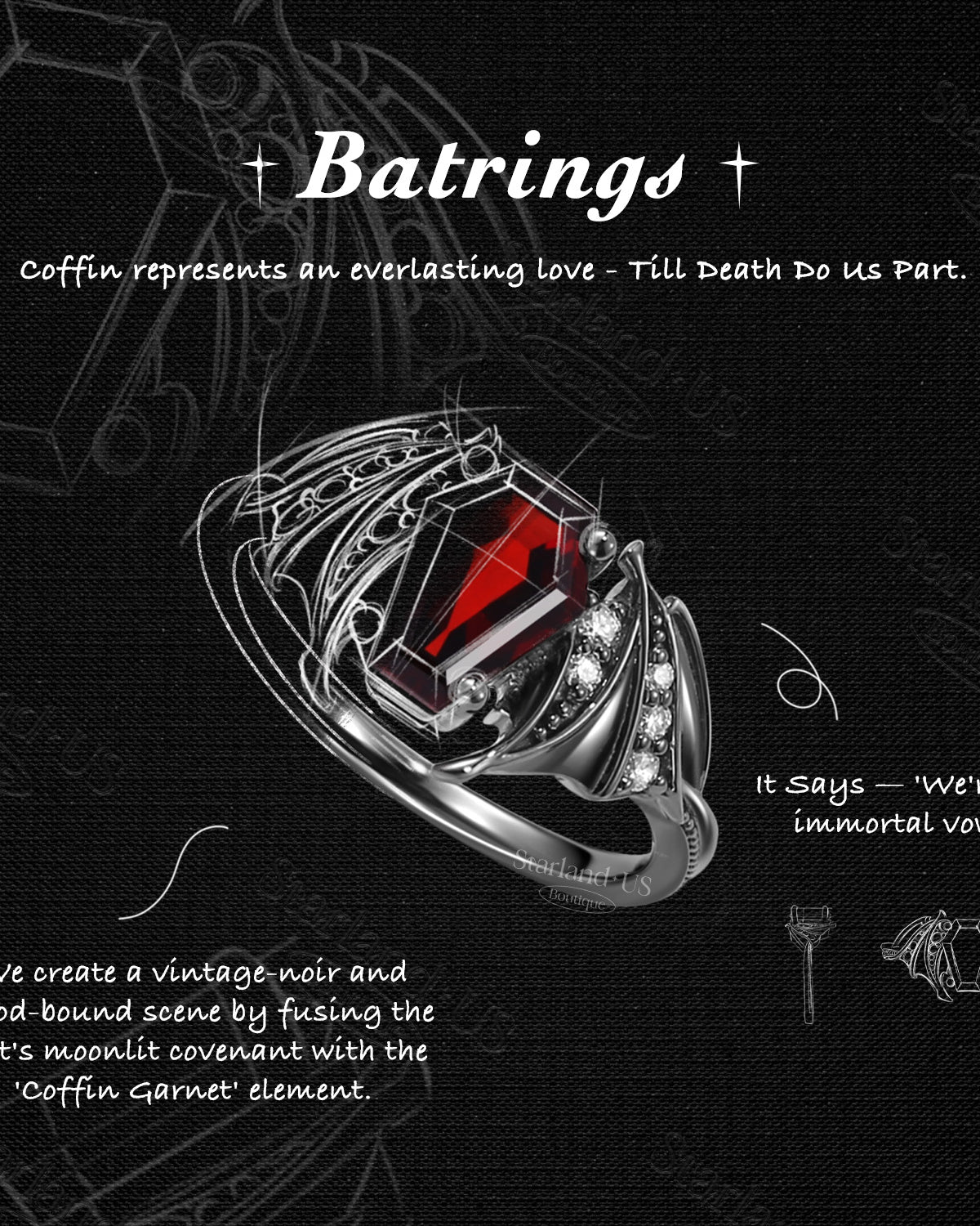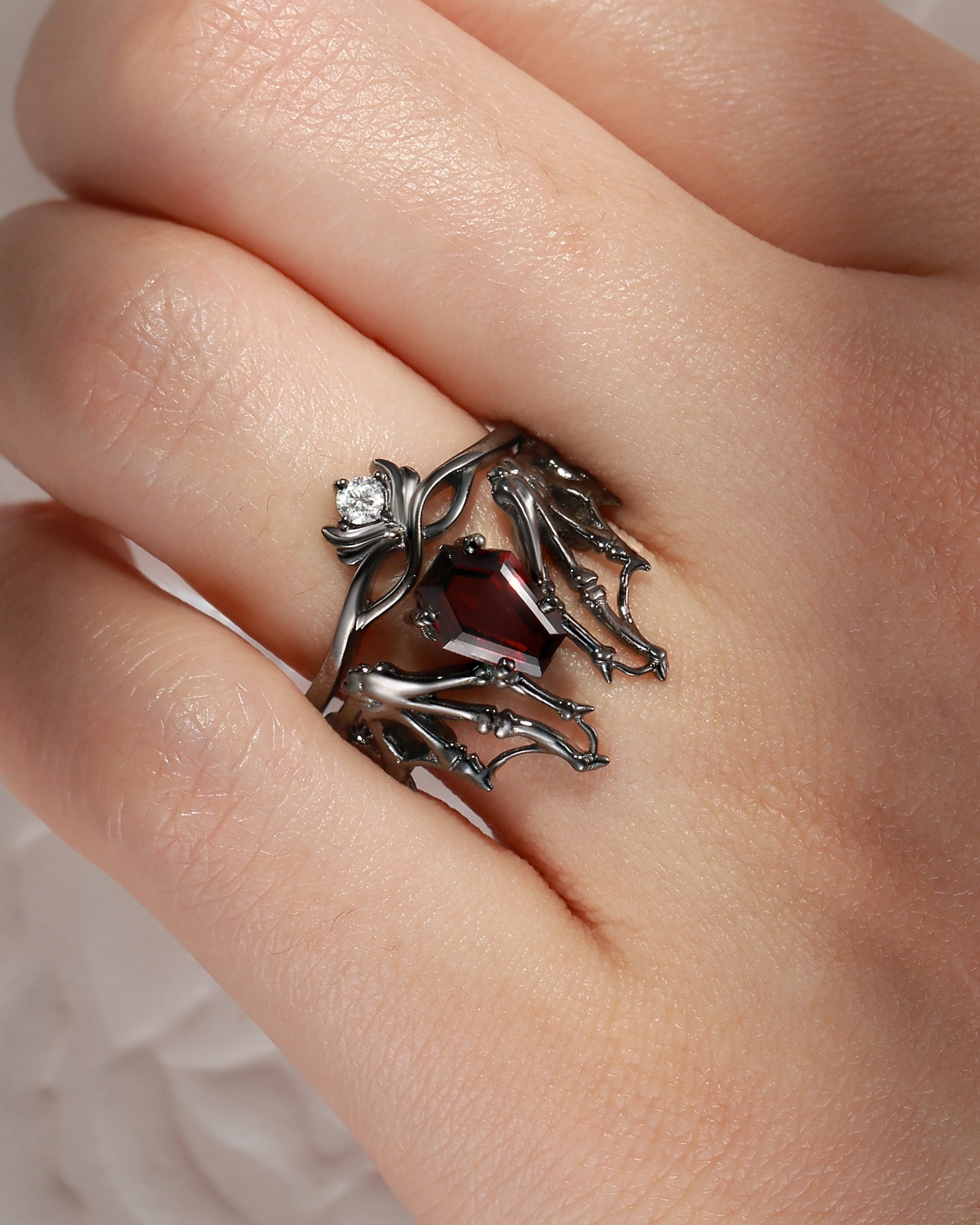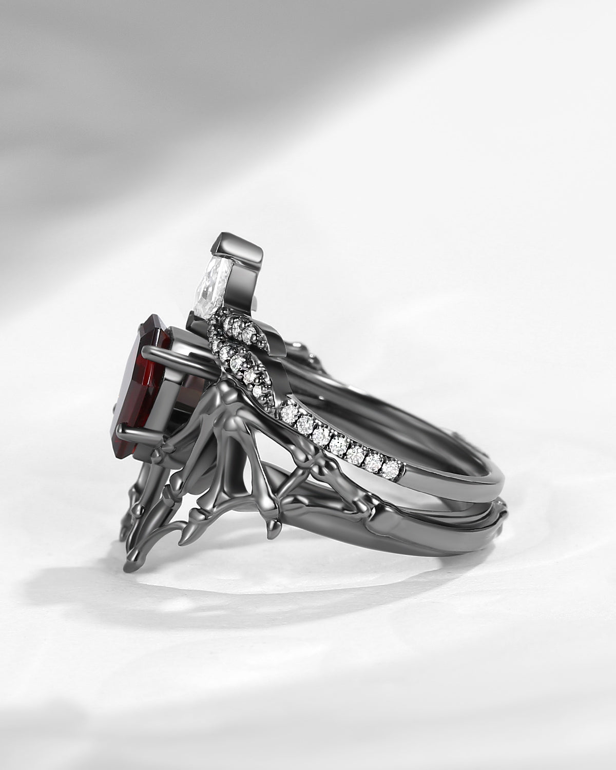 Gothic Coffin Garnet Bat Wing Inspired Couple Bridal Ring Set