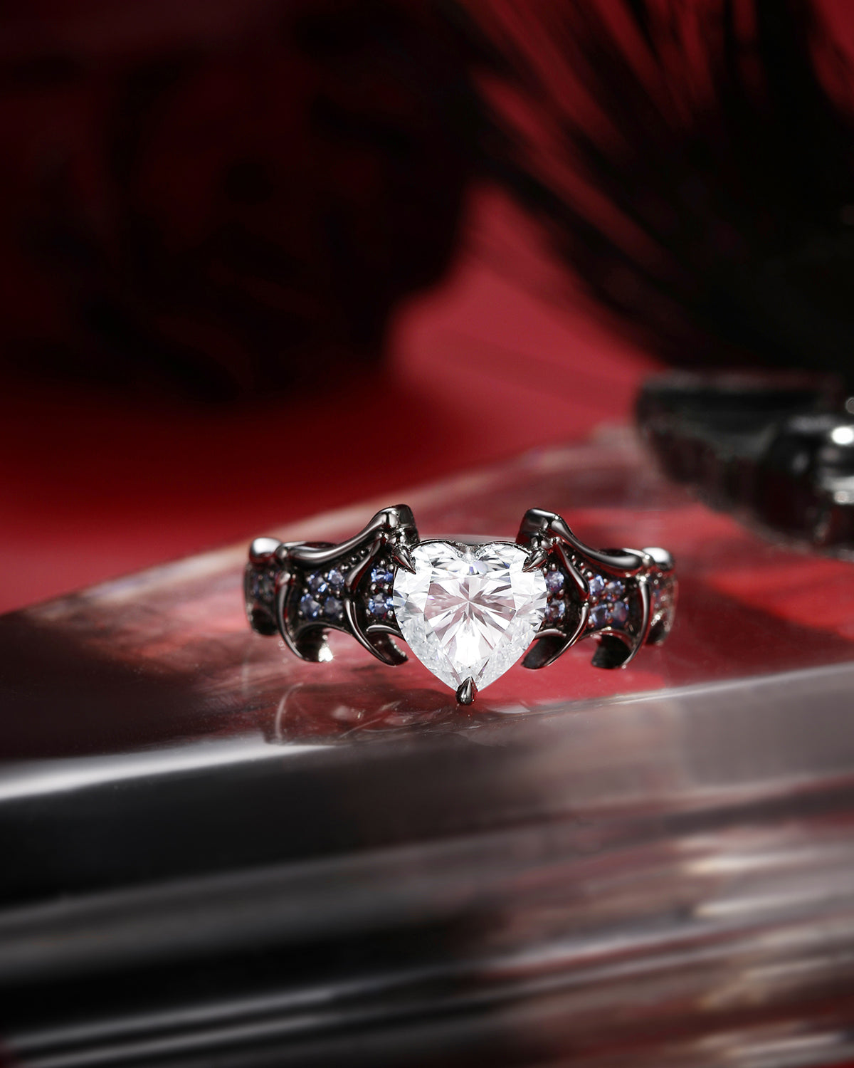Heart Shaped Moissanite Gothic Inspired Black Gold Engagement Ring - Bat Ring