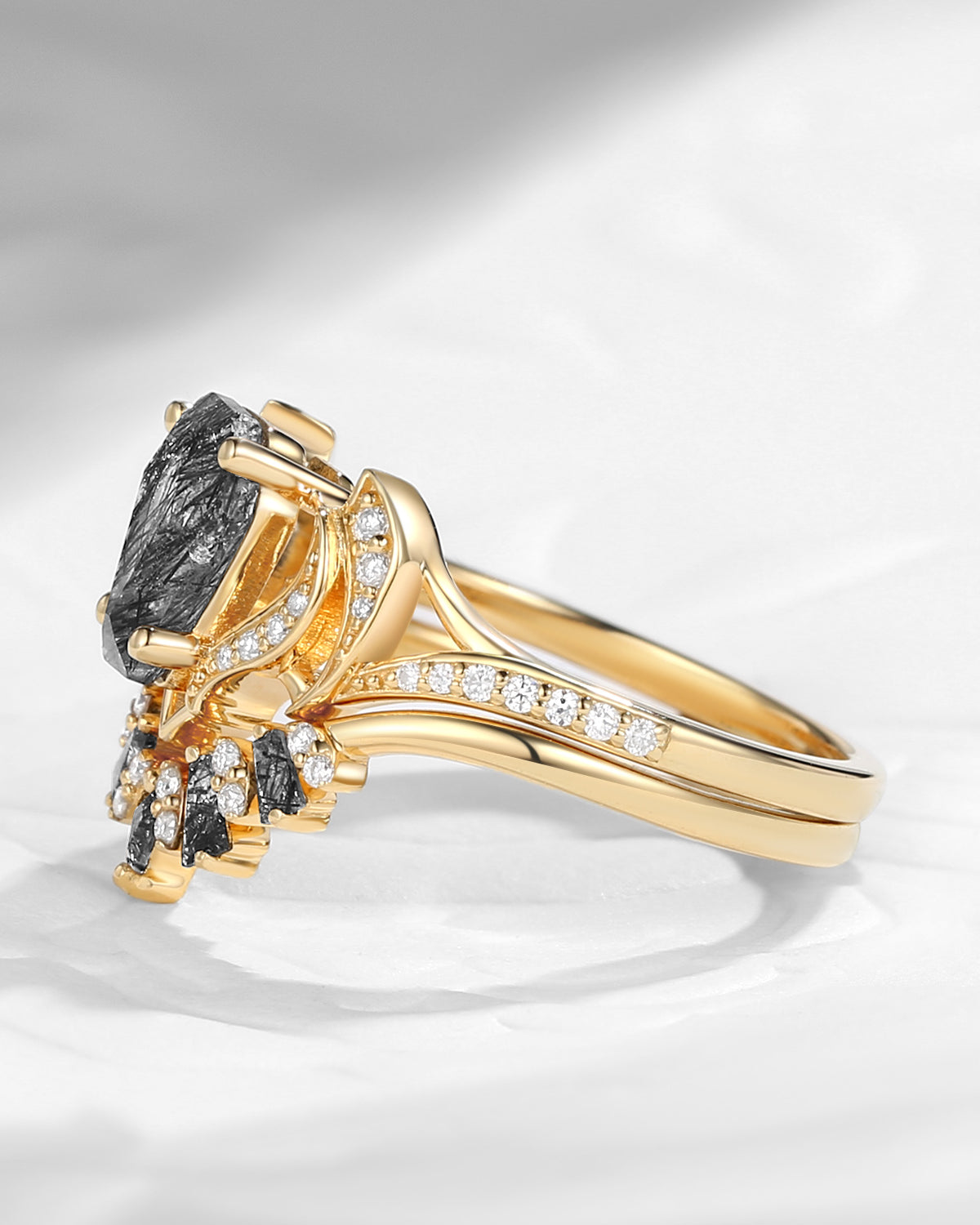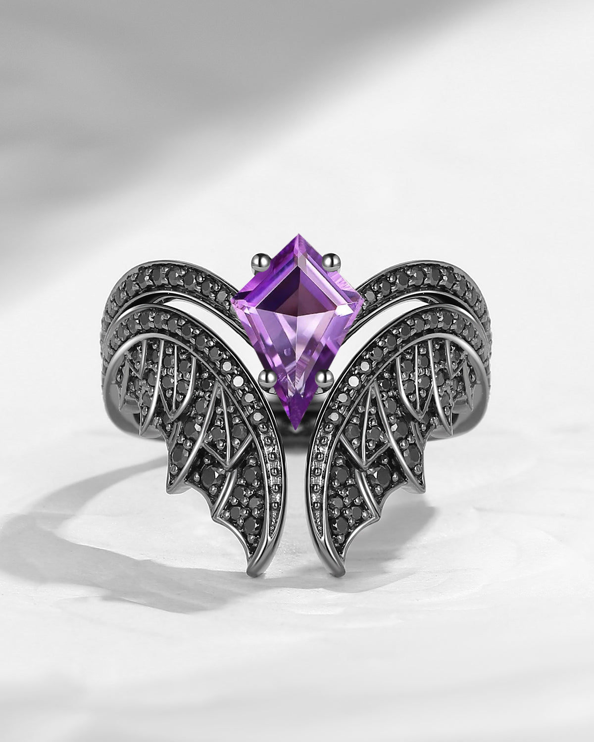 Kite Cut Natural Amethyst Vintage Black Gold Bridal Set 2pcs - Bat Ring