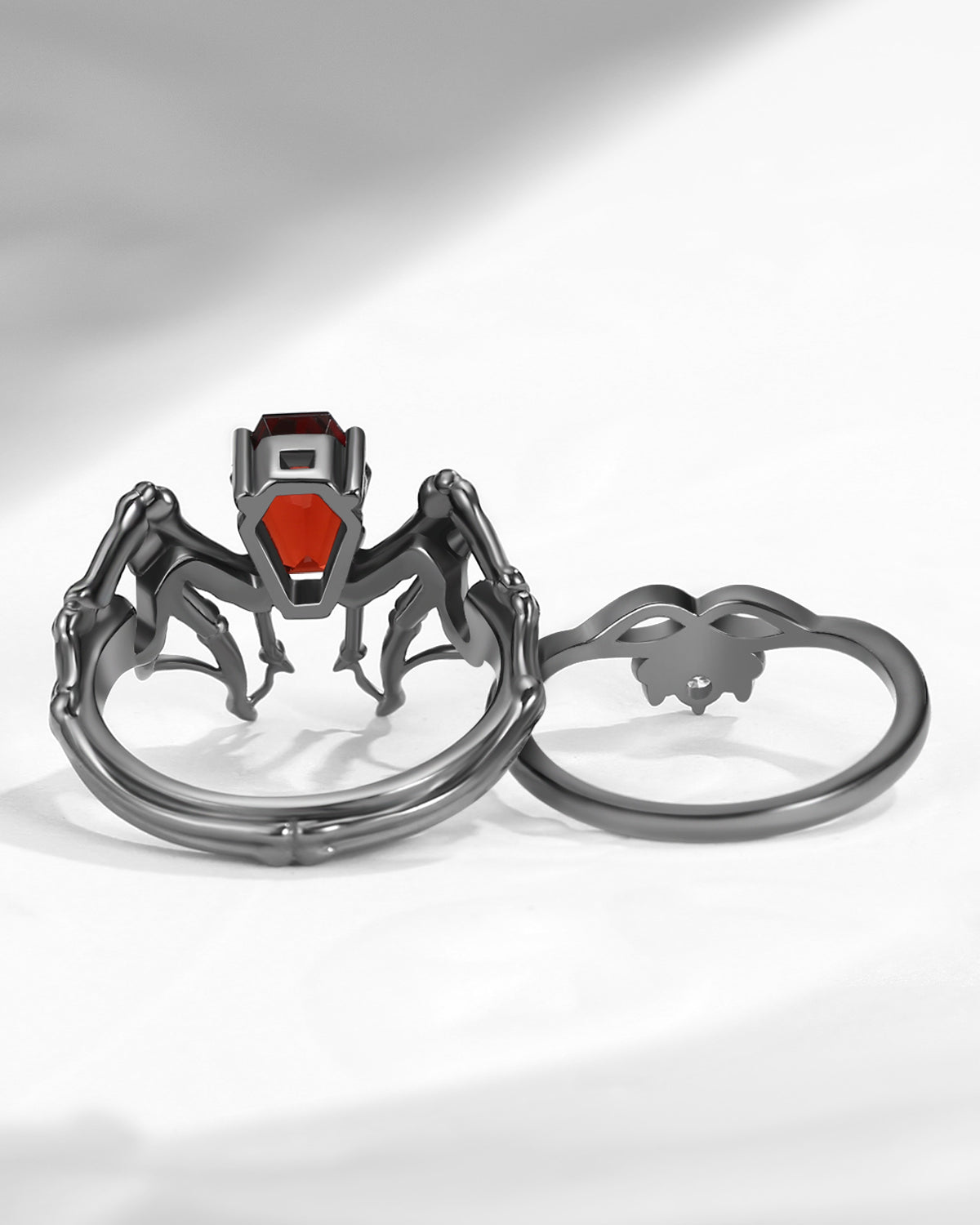 Non-Traditional Coffin Garnet Black Gold Vampire Ring Set 2pcs - Bat Ring